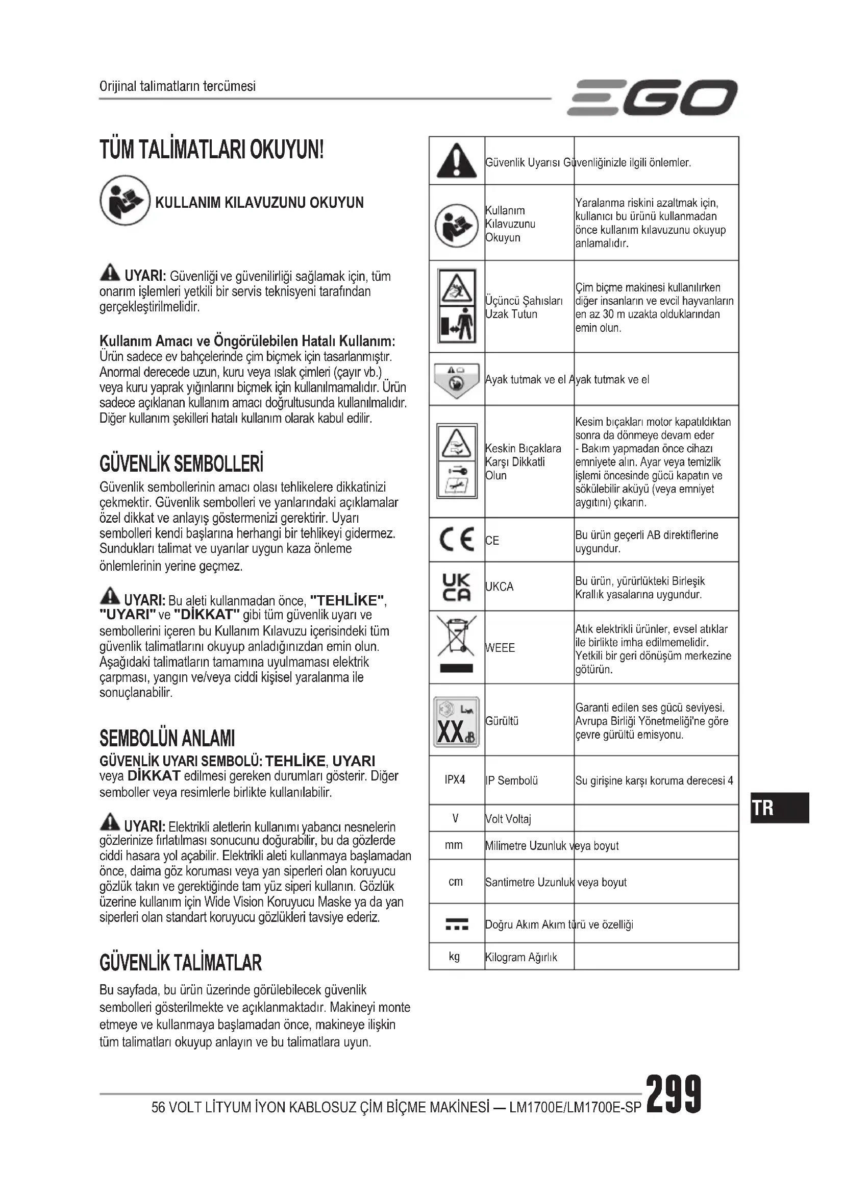 GürültüGaranti edilen ses gücü seviyesi. Avrupa Birliği Yönetmeliği'ne göre çevre gürültü emisyonu. IPX4 IP SembolüSu girişine karşı koruma derecesi 4 Volt Voltaj Milimetre Uzunluk veya boyut Santimetre Uzunluk veya boyutDoğru Akım Akım türü ve özelliği Kilogram AğırlıkOrijinal talimatların tercümesi56 VOLT LİTYUM İYON KABLOSUZ ÇİM BİÇME MAKİNESİ — LM1700E/LM1700E-SP300