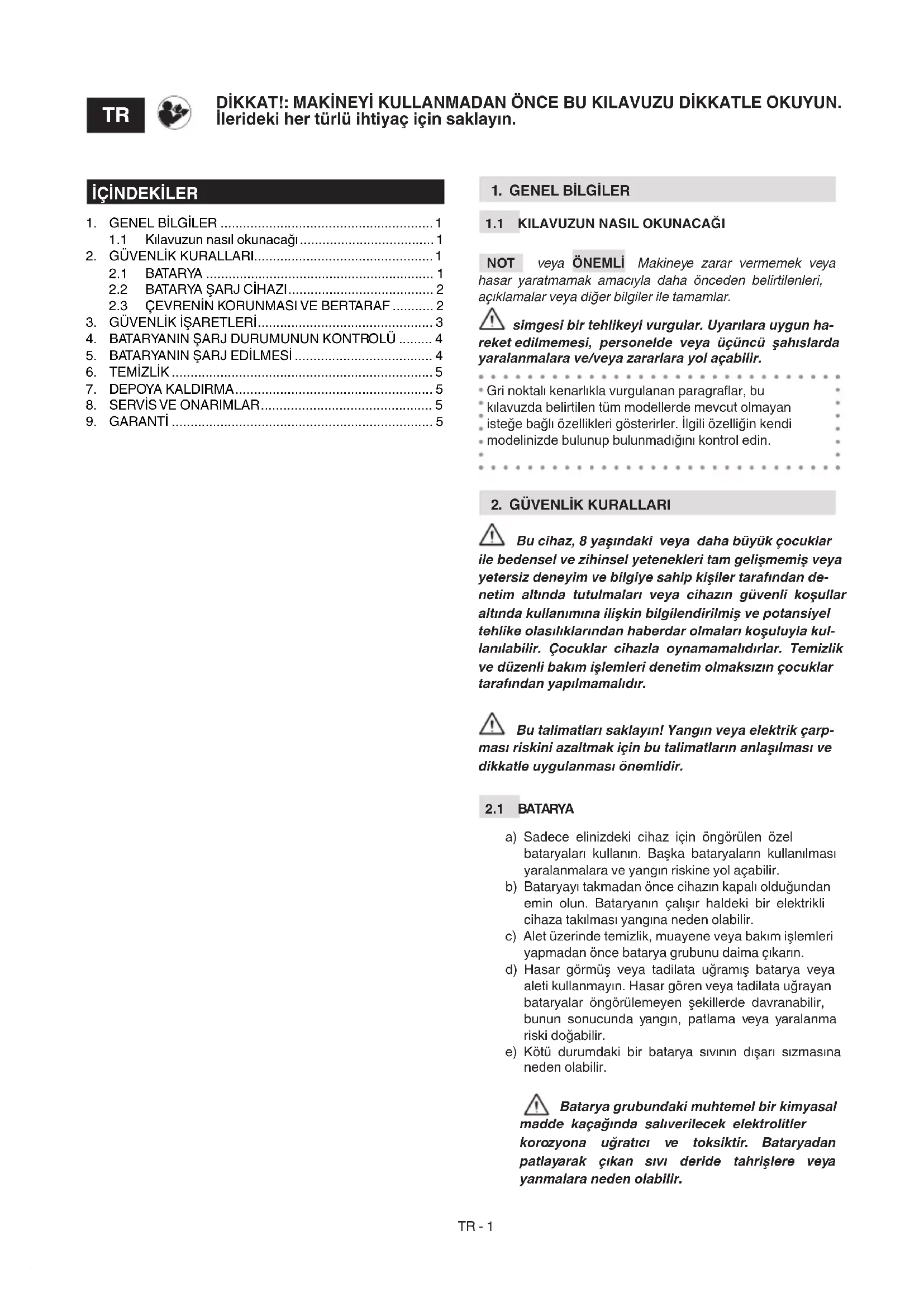 a) Sadece elinizdeki cihaz için öngörülen özel bataryaları kullanın. Başka bataryaların kullanılması yaralanmalara ve yangın riskine yol açabilir. b) Bataryayı takmadan önce cihazın kapalı olduğundan emin olun. Bataryanın çalışır haldeki bir elektrikli cihaza takılması yangına neden olabilir. c) Alet üzerinde temizlik, muayene veya bakım işlemleri yapmadan önce batarya grubunu daima çıkarın. d) Hasar görmüş veya tadilata uğramış batarya veya aleti kullanmayın. Hasar gören veya tadilata uğrayan bataryalar öngörülemeyen şekillerde davranabilir, bunun sonucunda yangın, patlama veya yaralanma riski doğabilir. e) Kötü durumdaki bir batarya sıvının dışarı sızmasına neden olabilir. Batarya grubundaki muhtemel bir kimyasal madde kaçağında salıverilecek elektrolitler korozyona uğratıcı ve toksiktir. Bataryadan patlayarak çıkan sıvı deride tahrişlere veya yanmalara neden olabilir. DİKKAT!: MAKİNEYİ KULLANMADAN ÖNCE BU KILAVUZU DİKKATLE OKUYUN. İlerideki her türlü ihtiyaç için saklayın.