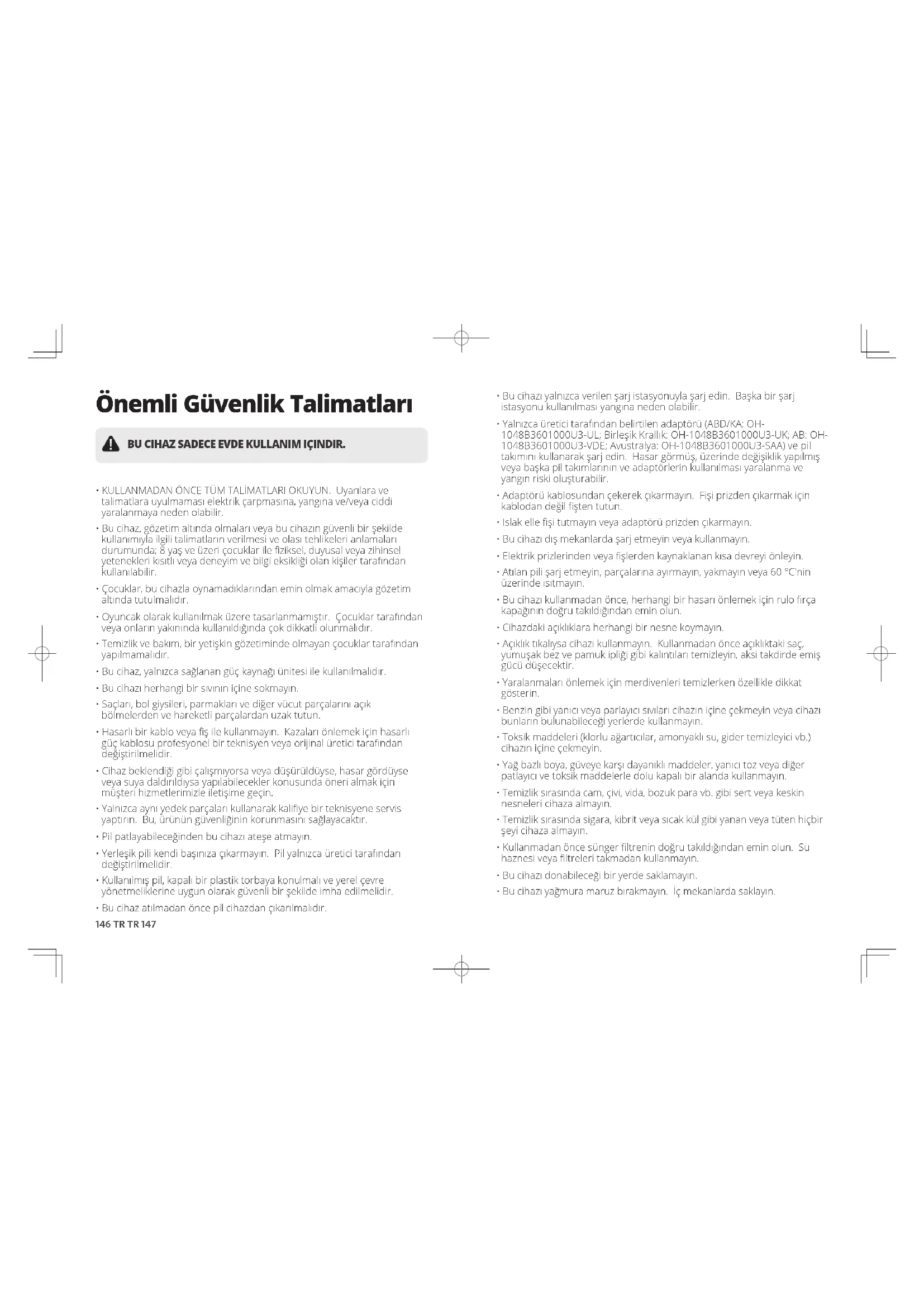 - KULLANMADAN ÖNCE TÜM TALİMATLARI OKUYUN. Uyarılara ve talimatlara uyulmaması elektrik çarpmasına, yangına ve/veya ciddi yaralanmaya neden olabilir.