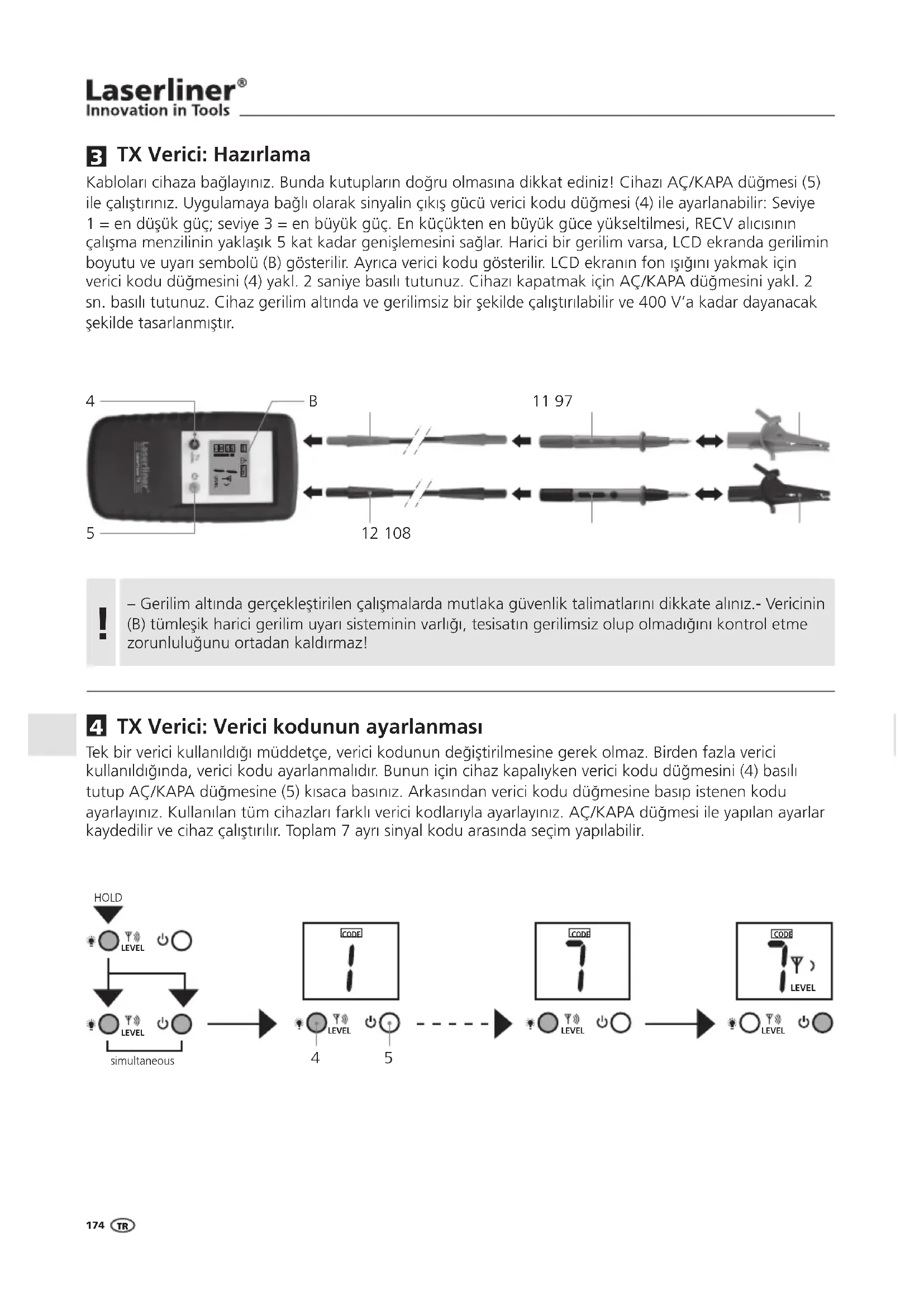 simultaneous HOLD CODE LEVELLEVELLEVELLEVEL CODE LEVEL CODE LEVEL KablolarÚ cihaza baŒlayÚnÚz. Bunda kutuplarÚn doŒru olmasÚna dikkat ediniz! CihazÚ AÇ/KAPA düŒmesi (5) ile çalÚŭtÚrÚnÚz. Uygulamaya baŒlÚ olarak sinyalin çÚkÚŭ gücü verici kodu düŒmesi (4) ile ayarlanabilir: Seviye 1 = en düŭük güç; seviye 3 = en büyük güç. En küçükten en büyük güce yükseltilmesi, RECV alÚcÚsÚnÚn çalÚŭma menzilinin yaklaŭÚk 5 kat kadar geniŭlemesini saŒlar. Harici bir gerilim varsa, LCD ekranda gerilimin boyutu ve uyarÚ sembolü (B) gösterilir. AyrÚca verici kodu gösterilir. LCD ekranÚn fon ÚŭÚŒÚnÚ yakmak için verici kodu düŒmesini (4) yakl. 2 saniye basÚlÚ tutunuz. CihazÚ kapatmak için AÇ/KAPA düŒmesini yakl. 2 sn. basÚlÚ tutunuz. Cihaz gerilim altÚnda ve gerilimsiz bir ŭekilde çalÚŭtÚ rÚlabilir ve 400 V‘a kadar dayanacak ŭekilde tasarlanmÚŭtÚr. TX Verici: HazČrlama