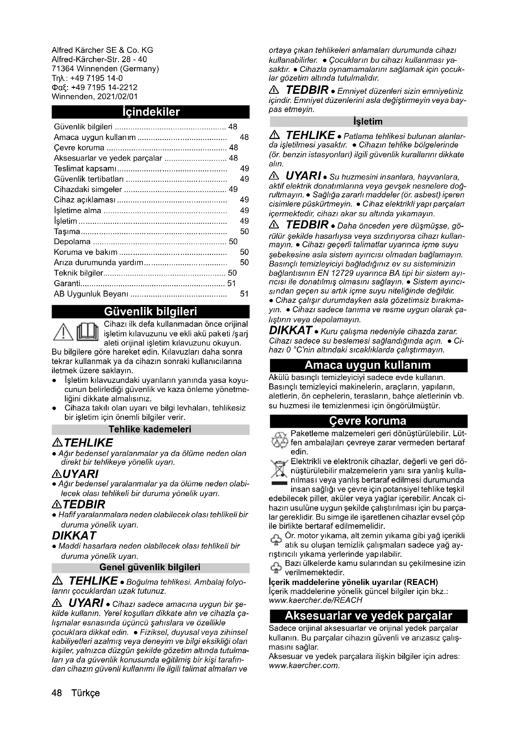 dB(A) 84 Chairman of the Board of Management Director Regulatory Affairs & Certification H. Jenner S. Reiser48 Türkçe Alfred Kärcher SE & Co. KG Alfred-Kärcher-Str. 28 - 40 71364 Winnenden (Germany) Τηλ.: +49 7195 14-0 Φαξ: +49 7195 14-2212 Winnenden, 2021/02/01 İçindekiler Güvenlik bilgileri Cihazı ilk defa kullanmadan önce orijinal işletim kılavuzunu ve ekli akü paketi /şarj aleti orijinal işletim kılavuzunu okuyun. Bu bilgilere göre hareket edin. Kılavuzları daha sonra tekrar kullanmak ya da cihazın sonraki kullanıcılarına iletmek üzere saklayın. ●İşletim kılavuzundaki uyarıların yanında yasa koyu- cunun belirlediği güvenlik ve kaza önleme yönetme- liğini dikkate almalısınız. ● Cihaza takılı olan uyarı ve bilgi levhaları, tehlikesiz bir işletim için önemli bilgiler verir. Tehlike kademeleri TEHLIKE ● Ağır bedensel yaralanmalar ya da ölüme neden olan direkt bir tehlikeye yönelik uyarı. 몇 UYARI ● Ağır bedensel yaralanmalar ya da ölüme neden olabi- lecek olası tehlikeli bir duruma yönelik uyarı. 몇 TEDBIR ● Hafif yaralanmalara neden olabilecek olası tehlikeli bir duruma yönelik uyarı. DIKKAT ● Maddi hasarlara neden olabilecek olası tehlikeli bir duruma yönelik uyarı. Genel güvenlik bilgileri TEHLIKE ● Boğulma tehlikesi. Ambalaj folyo- larını çocuklardan uzak tutunuz. 몇 UYARI ● Cihazı sadece amacına uygun bir şe- kilde kullanın. Yerel koşulları dikkate alın ve cihazla ça- lışmalar esnasında üçüncü şahıslara ve özellikle çocuklara dikkat edin. ● Fiziksel, duyusal veya zihinsel kabiliyetleri azalmış veya deneyim ve bilgi eksikliği olan kişiler, yalnızca düzgün şekilde gözetim altında tutulma- ları ya da güvenlik konusunda eğitilmiş bir kişi tarafın- dan cihazın güvenli kullanımı ile ilgili talimat almaları ve ortaya çıkan tehlikeleri anlamaları durumunda cihazı kullanabilirler. ● Çocukların bu cihazı kullanması ya- saktır. ● Cihazla oynamamalarını sağlamak için çocuk- lar gözetim altında tutulmalıdır. 몇 TEDBIR ● Emniyet düzenleri sizin emniyetiniz içindir. Emniyet düzenlerini asla değiştirmeyin veya bay- pas etmeyin. İşletim TEHLIKE ● Patlama tehlikesi bulunan alanlar- da işletilmesi yasaktır. ● Cihazın tehlike bölgelerinde (ör. benzin istasyonları) ilgili güvenlik kurallarını dikkate alın. 몇 UYARI ● Su huzmesini insanlara, hayvanlara, aktif elektrik donatımlarına veya gevşek nesnelere doğ- rultmayın. ● Sağlığa zararlı maddeler (ör. asbest) içeren cisimlere püskürtmeyin. ● Cihaz elektrikli yapı parçaları içermektedir, cihazı akar su altında yıkamayın. 몇 TEDBIR ● Daha önceden yere düşmüşse, gö- rülür şekilde hasarlıysa veya sızdırıyorsa cihazı kullan- mayın. ● Cihazı geçerli talimatlar uyarınca içme suyu şebekesine asla sistem ayırıcısı olmadan bağlamayın. Basınçlı temizleyiciyi bağladığınız ev su sisteminizin bağlantısının EN 12729 uyarınca BA tipi bir sistem ayı- rıcısı ile donatılmış olmasını sağlayın. ● Sistem ayırıcı-
