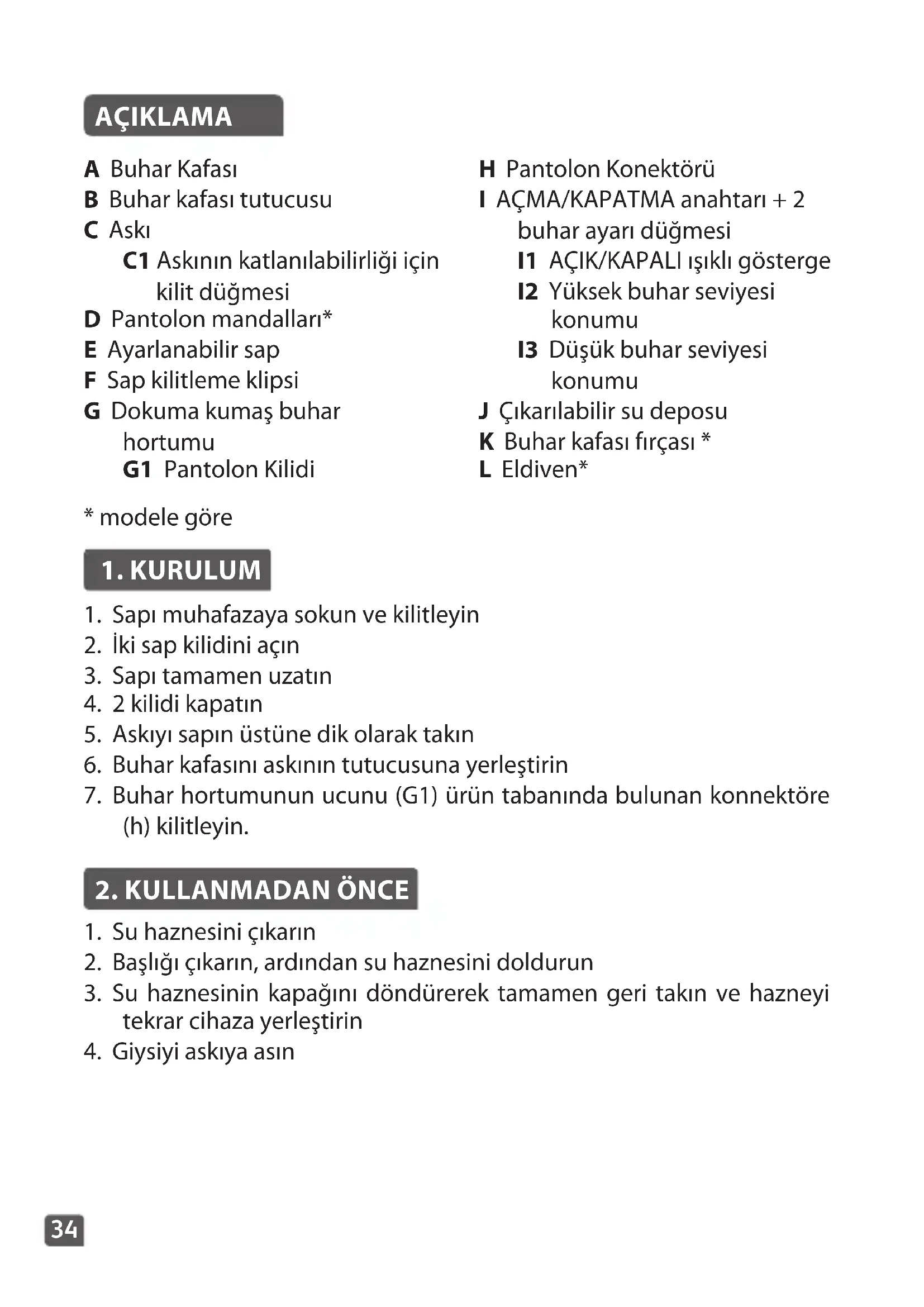 - Μην πλένετε και μην ξεπλένετε ποτέ τη συσκευή απευθείας στον νεροχύτη.34 AÇIKLAMA A Buhar Kafası B Buhar kafası tutucusu C Askı C1 Askının katlanılabilirliği için kilit düğmesi D Pantolon mandalları* E Ayarlanabilir sap F Sap kilitleme klipsi G Dokuma kumaş buhar hortumu G1 Pantolon Kilidi H Pantolon Konektörü I AÇMA/KAPATMA anahtarı + 2 buhar ayarı düğmesi I1 AÇIK/KAPALI ışıklı gösterge I2 Yüksek buhar seviyesi konumu I3 Düşük buhar seviyesi konumu J Çıkarılabilir su deposu K Buhar kafası fırçası * L Eldiven*