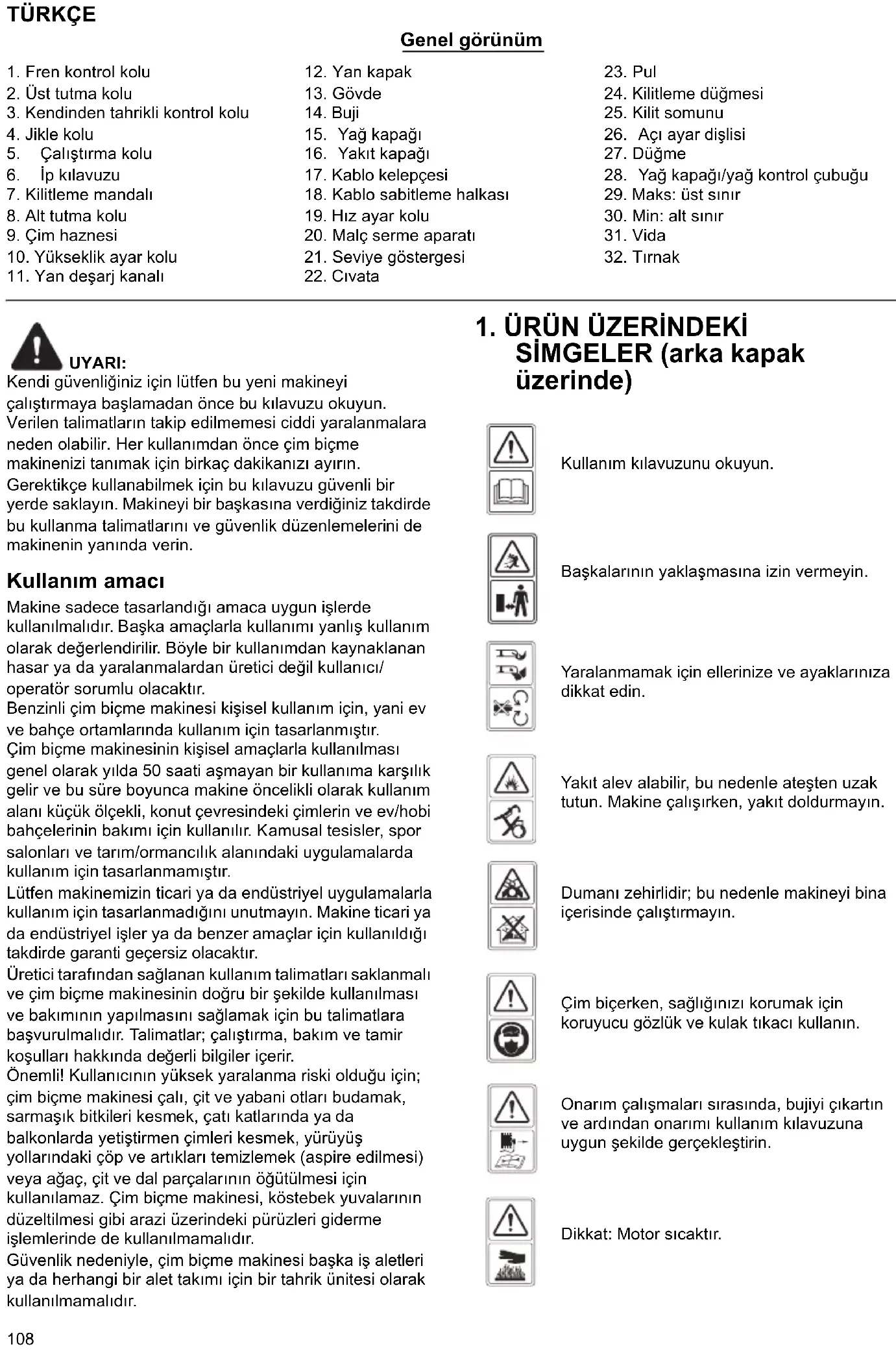 Kullanım kılavuzunu okuyun. Başkalarının yaklaşmasına izin vermeyin. Yaralanmamak için ellerinize ve ayaklarınıza dikkat edin. Yakıt alev alabilir, bu nedenle ateşten uzak tutun. Makine çalışırken, yakıt doldurmayın. Dumanı zehirlidir; bu nedenle makineyi bina içerisinde çalıştırmayın. Çim biçerken, sağlığınızı korumak için koruyucu gözlük ve kulak tıkacı kullanın. Onarım çalışmaları sırasında, bujiyi çıkartın ve ardından onarımı kullanım kılavuzuna uygun şekilde gerçekleştirin. Dikkat: Motor sıcaktır.109