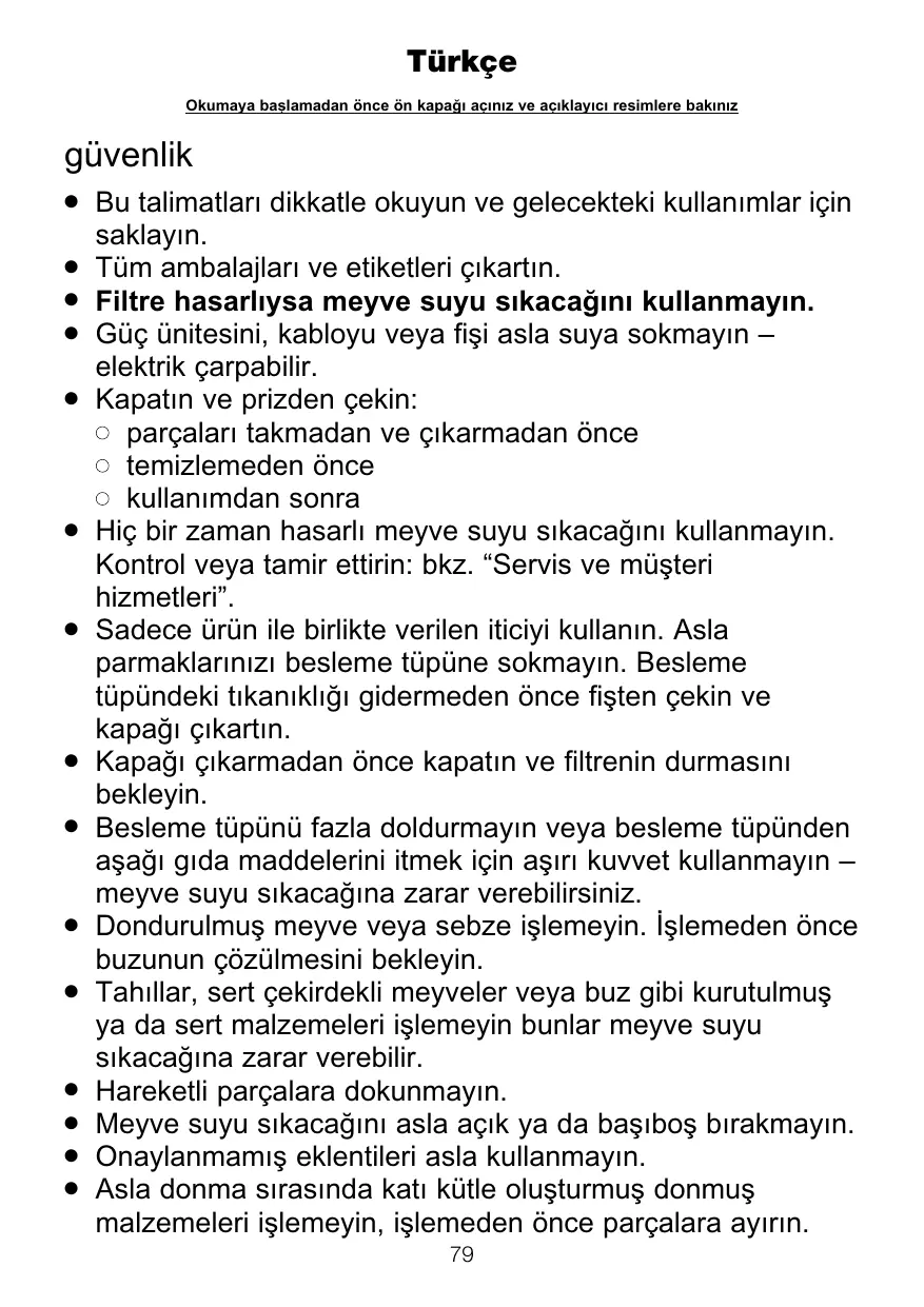 Bu talimatları dikkatle okuyun ve gelecekteki kullanımlar için saklayın. Tüm ambalajları ve etiketleri çıkartın. Filtre hasarlıysa meyve suyu sıkacağını kullanmayın. Güç ünitesini, kabloyu veya fişi asla suya sokmayın – elektrik çarpabilir. Kapatın ve prizden çekin: parçaları takmadan ve çıkarmadan önce temizlemeden önce kullanımdan sonra Hiç bir zaman hasarlı meyve suyu sıkacağını kullanmayın. Kontrol veya tamir ettirin: bkz. “Servis ve müşteri hizmetleri”. Sadece ürün ile birlikte verilen iticiyi kullanın. Asla parmaklarınızı besleme tüpüne sokmayın. Besleme tüpündeki tıkanıklığı gidermeden önce fişten çekin ve kapağı çıkartın. Kapağı çıkarmadan önce kapatın ve filtrenin durmasını bekleyin. Besleme tüpünü fazla doldurmayın veya besleme tüpünden aşağı gıda maddelerini itmek için aşırı kuvvet kullanmayın – meyve suyu sıkacağına zarar verebilirsiniz. Dondurulmuş meyve veya sebze işlemeyin. İşlemeden önce buzunun çözülmesini bekleyin. Tahıllar, sert çekirdekli meyveler veya buz gibi kurutulmuş ya da sert malzemeleri işlemeyin bunlar meyve suyu sıkacağına zarar verebilir. Hareketli parçalara dokunmayın. Meyve suyu sıkacağını asla açık ya da başıboş bırakmayın. Onaylanmamış eklentileri asla kullanmayın. Asla donma sırasında katı kütle oluşturmuş donmuş malzemeleri işlemeyin, işlemeden önce parçalara ayırın. 79