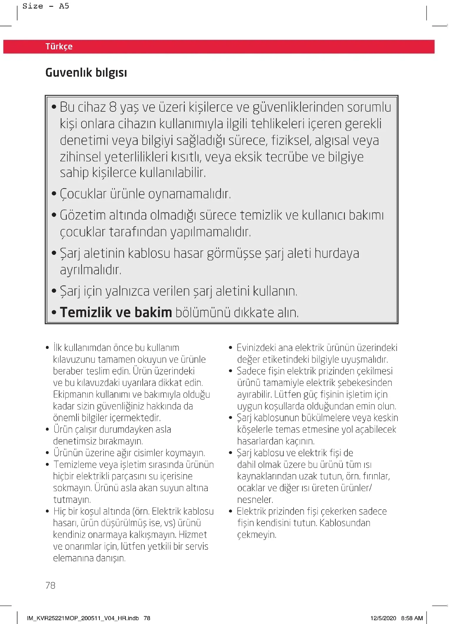 - Temizlik ve bakim bölümünü dıkkate alın.