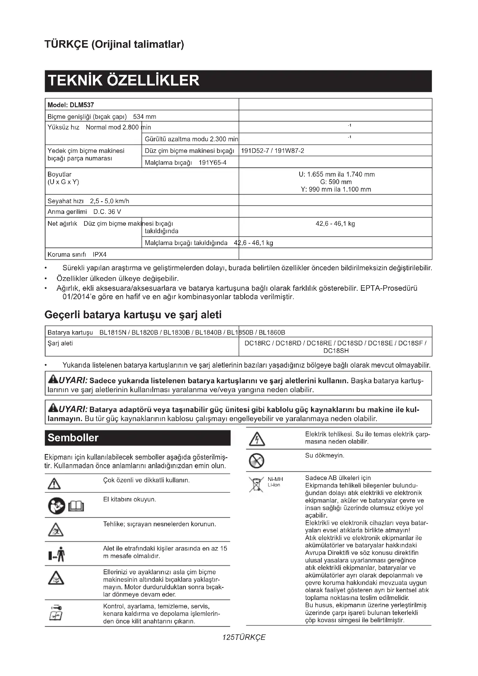 Yedekçimbiçmemakinesi bıçağıparçanumarası Düzçimbiçmemakinesibıçağı 191D52-7 / 191W87-2 Malçlamabıçağı 191Y65-4 Boyutlar (U x G x Y) U:1.655mmila1.740mm G: 590 mm Y:990mmila1.100mm Seyahathızı 2,5 - 5,0 km/h Anmagerilimi D.C. 36 V Netağırlık Düzçimbiçmemakinesibıçağı takıldığında 42,6 - 46,1 kg Malçlamabıçağıtakıldığında 42,6 - 46,1 kg Korumasınıfı IPX4