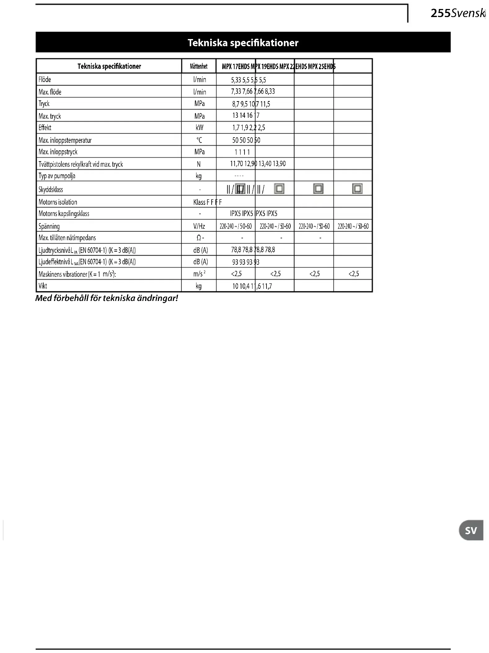 Maksimum besleme basıncı MPa 1 1 1 1Maksimum basınçta tabancanın itme kuvveti 11,70 12,90 13,40 13,90Pompa yağ tipi - - - -Koruma sınıfı