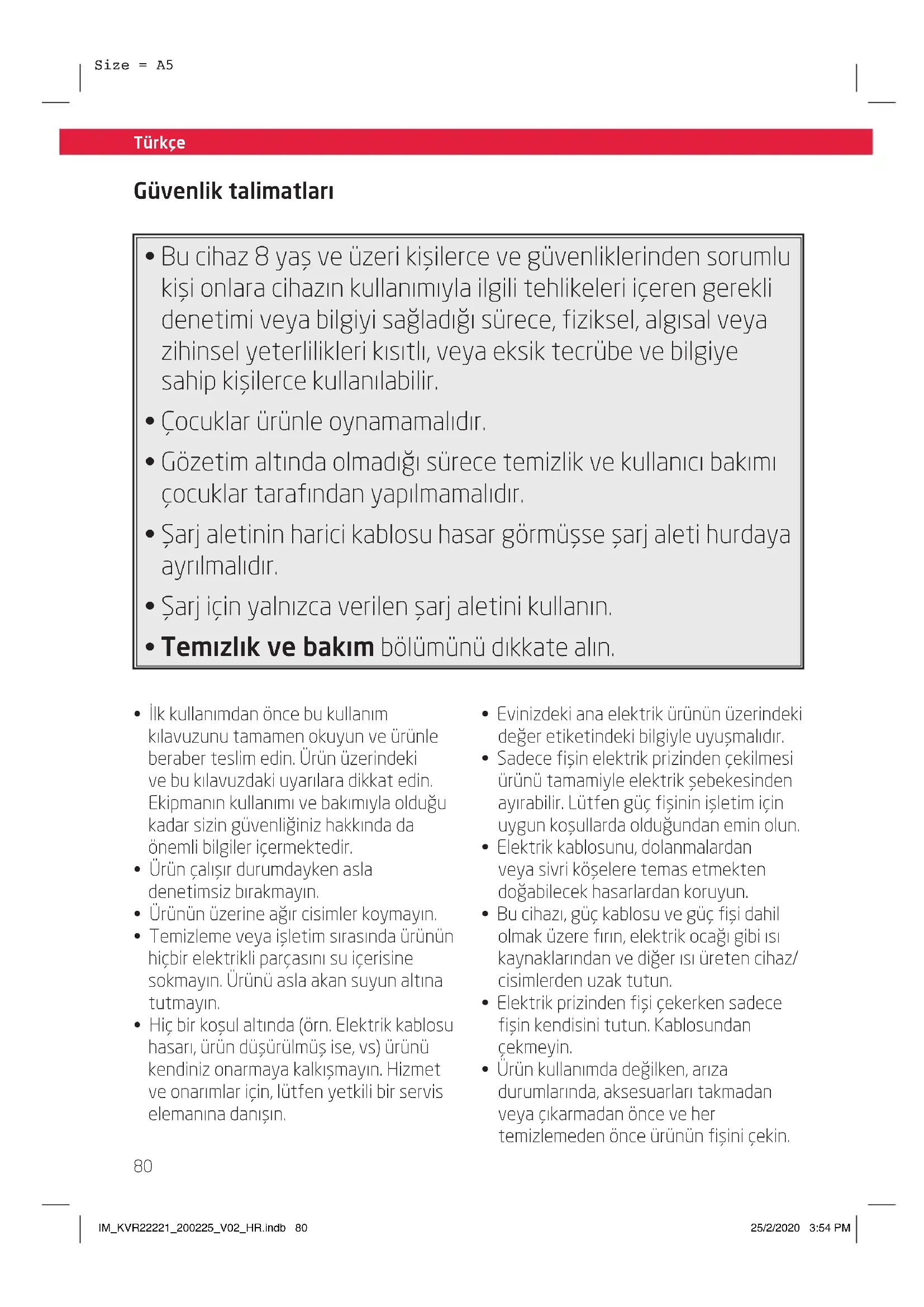 - Ürün kullanımda değilken, arıza durumlarında, aksesuarları takmadan veya çıkarmadan önce ve her temizlemeden önce ürünün fişini çekin. IM_KVR22221_200225_V02_HR.indb 80IM_KVR22221_200225_V02_HR.indb 80 25/2/2020 3:54 PM25/2/2020 3:54 PMTürkçe