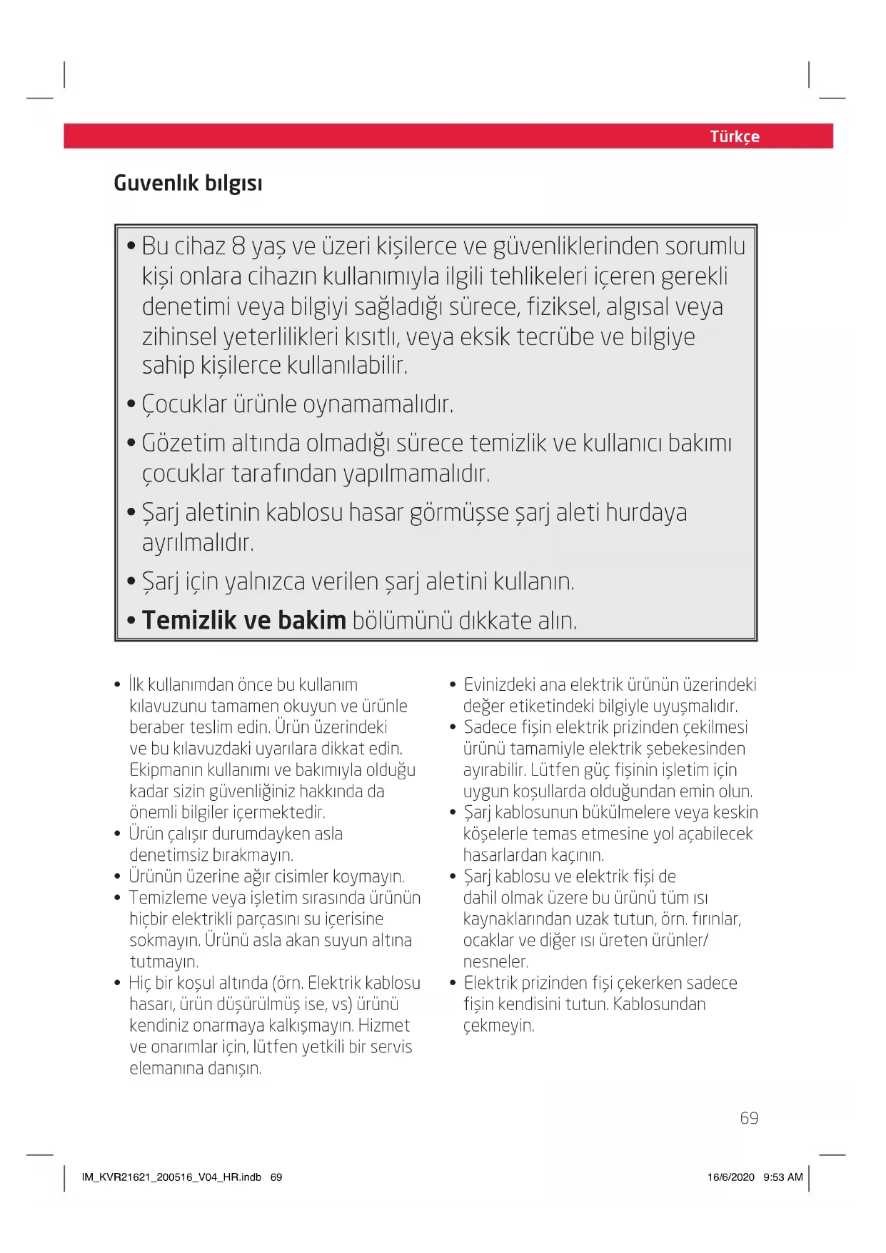 - Elektrik prizinden fişi çekerken sadece fişin kendisini tutun. Kablosundan çekmeyin. IM_KVR21621_200516_V04_HR.indb 69IM_KVR21621_200516_V04_HR.indb 69 16/6/2020 9:53 AM16/6/2020 9:53 AMSize - A5 Türkçe