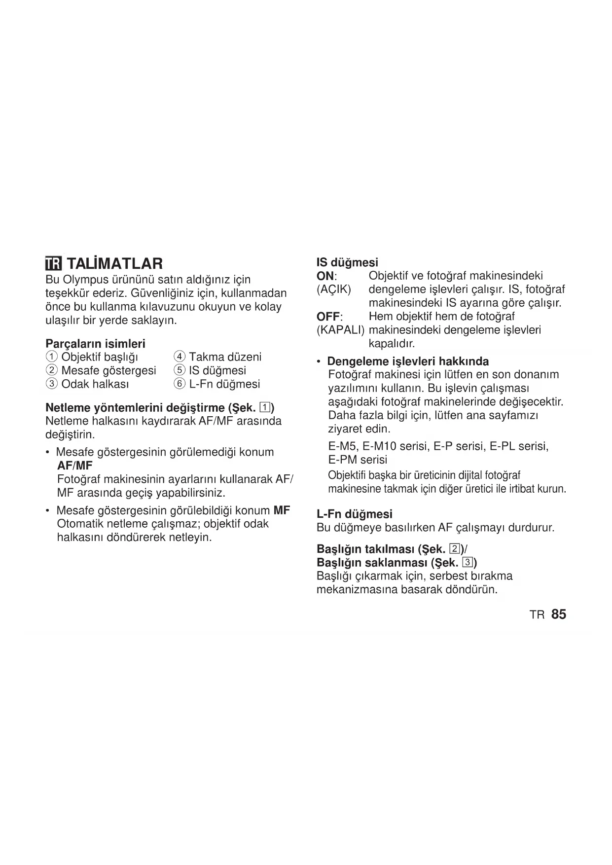 Daha fazla bilgi için, lütfen ana sayfamızı ziyaret edin. E-M5, E-M10 serisi, E-P serisi, E-PL serisi, E-PM serisi Objektifi başka bir üreticinin dijital fotoğraf makinesine takmak için diğer üretici ile irtibat kurun. L-Fn düğmesi Bu düğmeye basılırken AF çalışmayı durdurur. Başlığın takılması (Şek. 2)/ Başlığın saklanması (Şek. 3) Başlığı çıkarmak için, serbest bırakma mekanizmasına basarak döndürün. TR86 TR Çekim konusunda notlar
