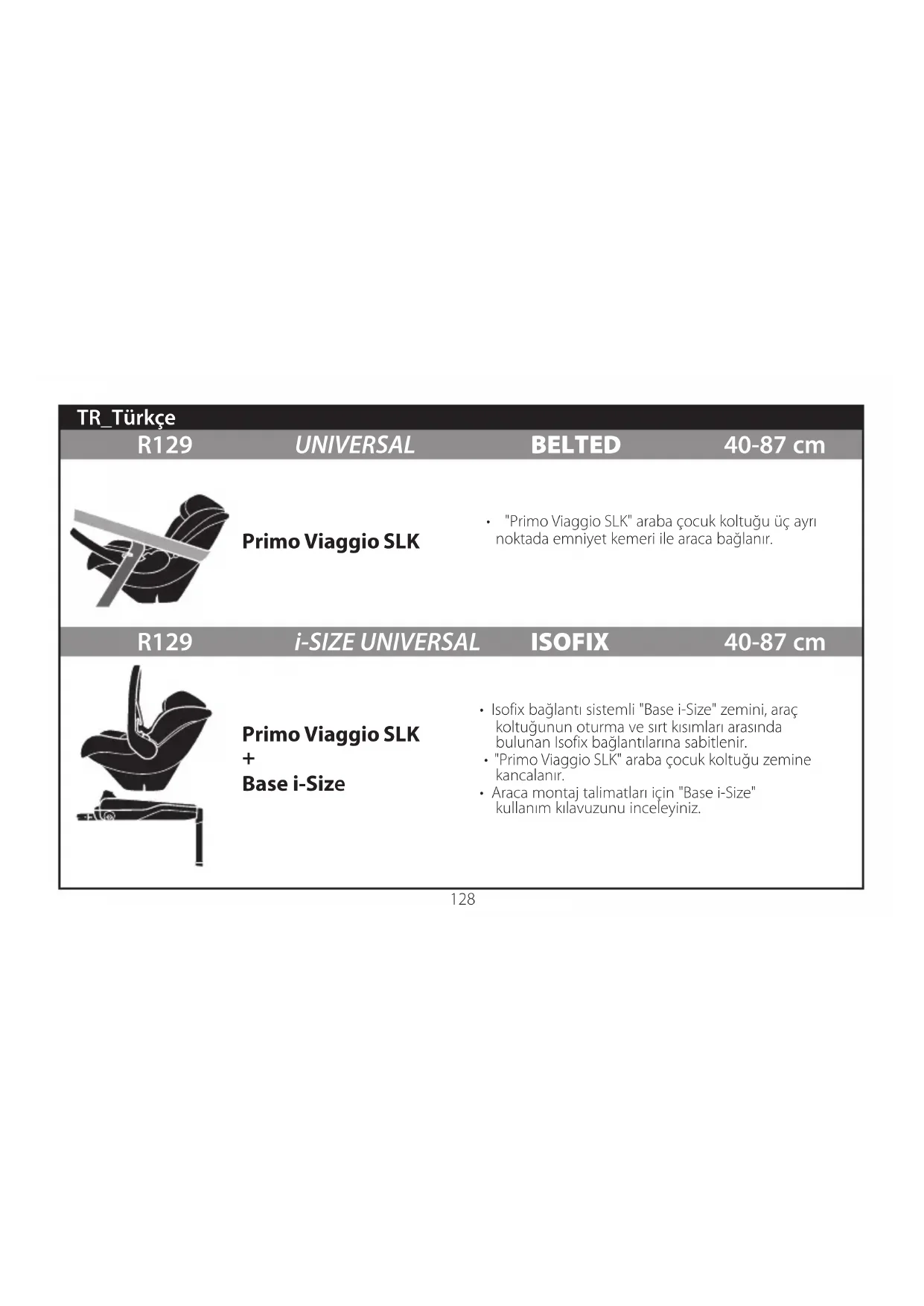 - Araca montaj talimatları için "Base i-Size" kullanım kılavuzunu inceleyiniz.129 Bir Peg Perego ürününü tercih ettiğiniz için teşekkür ederiz. Ürün özellikleri