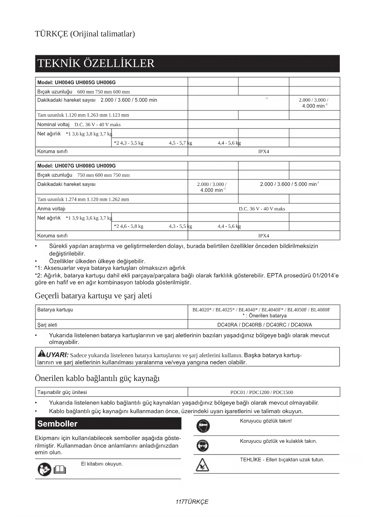(dB(A)) Belirsizlik K (dB(A)) UH004G 88 3 98 96 2,2 UH005G 89 3 99 97 1,8 UH006G 84 3 94 92 2,2 UH007G 84 3 94 92 1,7 UH008G 85 3 95 93 2,1 UH009G 86 3 96 94 1,6 NOT:Beyanedilengürültüemisyonudeğer(ler)ibirstandarttestyöntemineuygunşekildeölçülmüştürvebiraleti birbaşkasıylakarşılaştırmakiçinkullanılabilir. NOT:Beyanedilengürültüemisyonudeğer(ler)ibirönmaruzkalmadeğerlendirmesiolarakdakullanılabilir. UYARI: Kulak koruyucuları takın. UYARI: Elektrikli aletin gerçek kullanımı sırasındaki gürültü emisyonu, aletin kullanım biçimlerine, özellikle işlenen iş parçasının türüne bağlı olarak beyan edilen değer(ler)den farklı olabilir. UYARI: Gerçek kullanım koşullarındaki tahmini maruziyeti baz alan, operatörü koruyacak güvenlik önlemlerini mutlaka belirleyin (çalışma döngüsü içerisinde aletin kapalı olduğu ve aktif durumda olmasının yanı sıra boşta çalıştığı zamanlar gibi, bütün zaman dilimleri göz önünde bulundurarak). Titreşim Titreşimtoplamdeğeri(üçeksenlivektörtoplamı)(EN62841-4-2standardınagörehesaplanan): Model Ön kol Arka kol ah (m/s