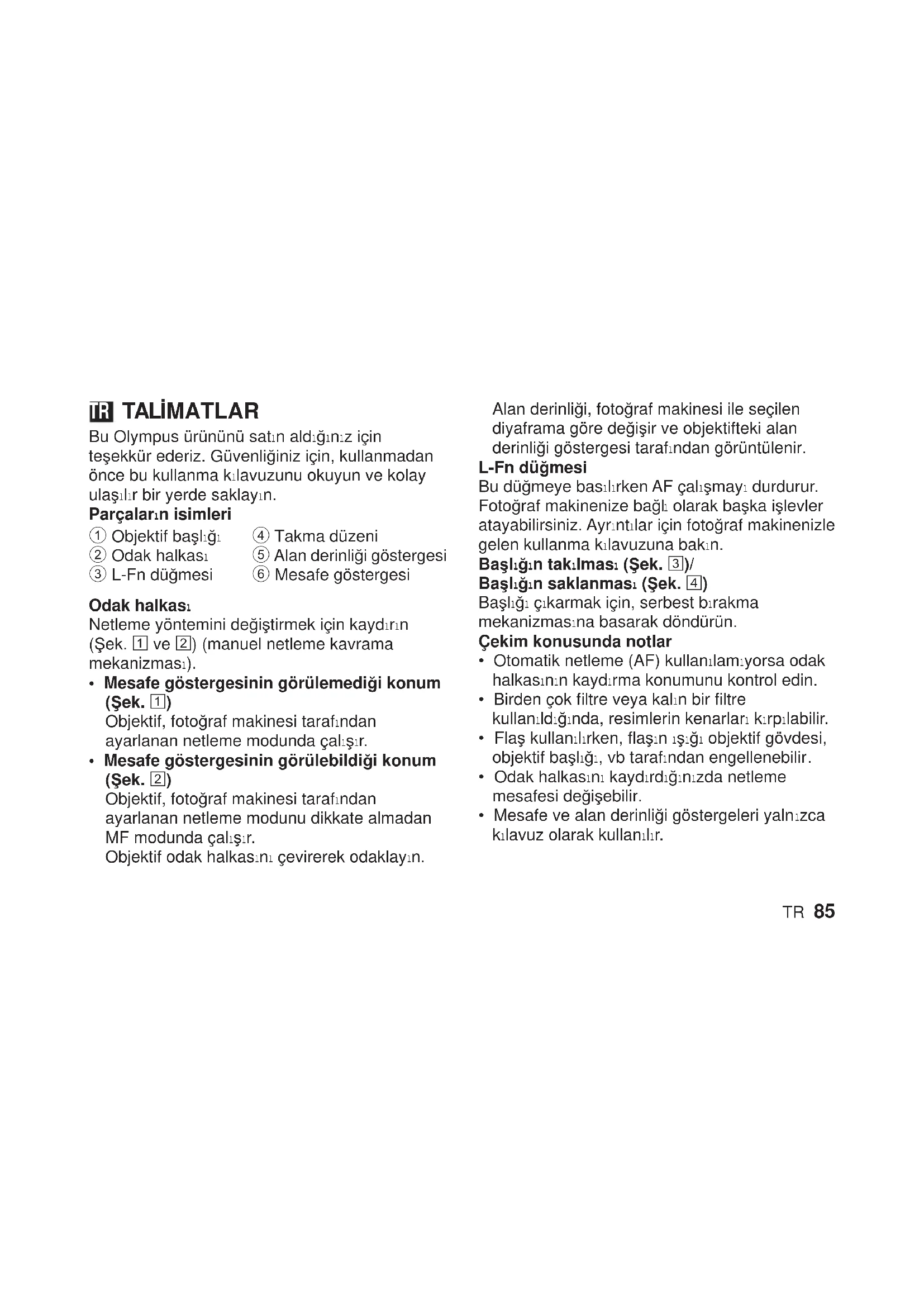 - Mesafe göstergesinin görülebildiği konum (Şek. 2) Objektif, fotoğraf makinesi tarafından ayarlanan netleme modunu dikkate almadan MF modunda çalışır. Objektif odak halkasını çevirerek odaklayın. Alan derinliği, fotoğraf makinesi ile seçilen diyaframa göre değişir ve objektifteki alan derinliği göstergesi tarafından görüntülenir. L-Fn düğmesi Bu düğmeye basılırken AF çalışmayı durdurur. Fotoğraf makinenize bağl ı olarak başka işlevler atayabilirsiniz. A yrıntılar için fotoğraf makinenizle gelen kullanma kılavuzuna bakın. Başlığın takılması (Şek. 3)/ Başlığın saklanması (Şek. 4) Başlığı çıkarmak için, serbest bırakma mekanizmasına basarak döndürün. Çekim konusunda notlar