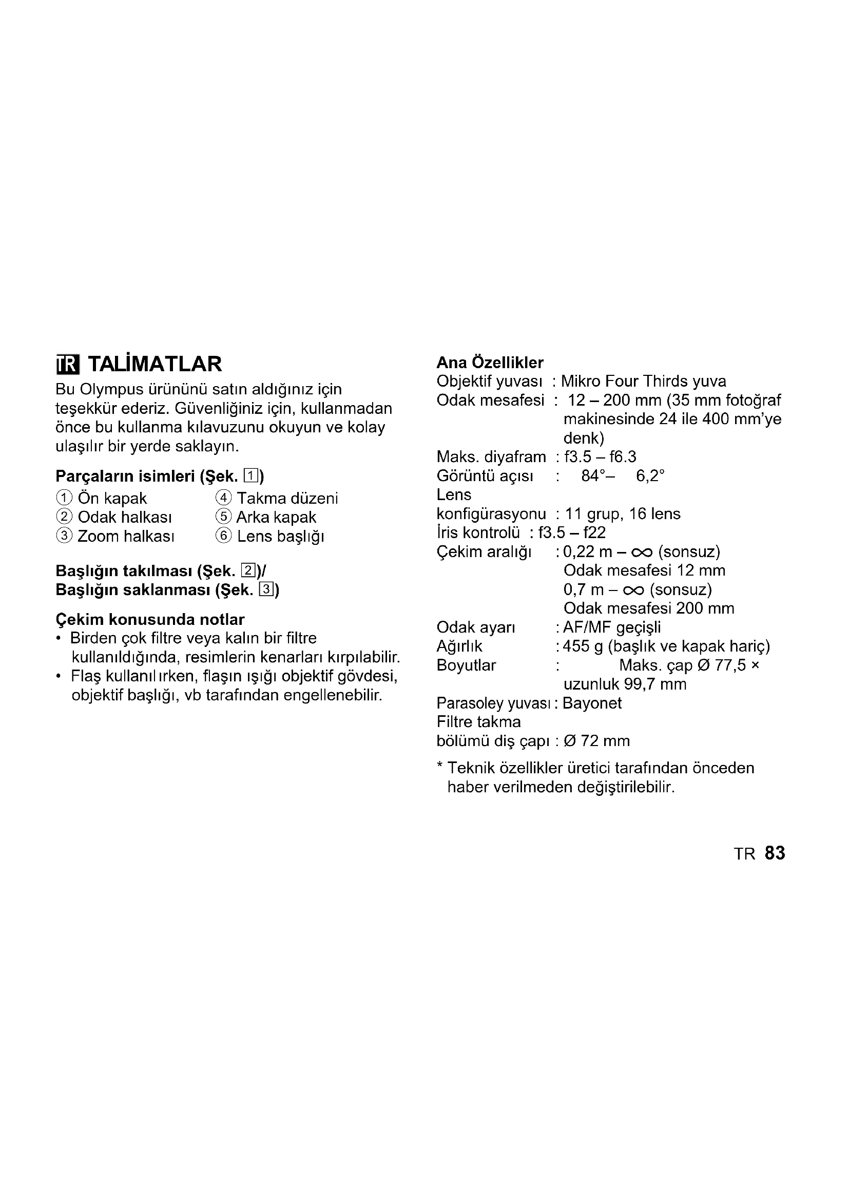 - Flaş kullanıl ırken, flaşın ışığı objektif gövdesi, objektif başlığı, vb tarafından engellenebilir. Ana Özellikler Objektif yuvası : Mikro Four Thirds yuva Odak mesafesi : 12 – 200 mm (35 mm fotoğraf makinesinde 24 ile 400 mm’ye denk) Maks. diyafram : f3.5 – f6.3 Görüntü açısı : 84°– 6,2° Lens konfigürasyonu : 11 grup, 16 lens İris kontrolü : f3.5 – f22 Çekim aralığı : 0,22 m – ) (sonsuz) Odak mesafesi 12 mm 0,7 m – ) (sonsuz) Odak mesafesi 200 mm Odak ayarı : AF/MF geçişli Ağırlık : 455 g (başlık ve kapak hariç) Boyutlar : Maks. çap Ø 77,5 × uzunluk 99,7 mm Parasoley yuvası : Bayonet Filtre takma bölümü diş çapı : Ø 72 mm