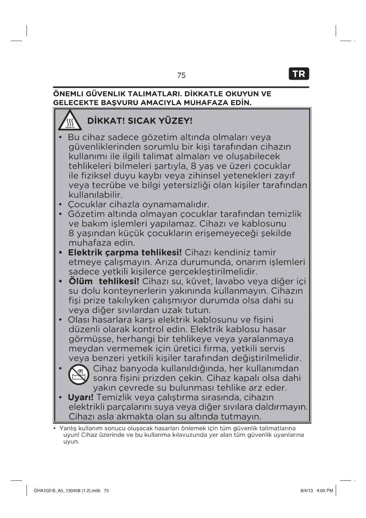 - Yanlış kullanım sonucu oluşacak hasarları önlemek için tüm güvenlik talimatlarına uyun! Cihaz üzerinde ve bu kullanma kılavuzunda yer alan tüm güvenlik uyarılarına uyun. OHA102-B_A5_130408 (1.2).indb 75OHA102-B_A5_130408 (1.2).indb 75 8/4/13 4:05 PM8/4/13 4:05 PM76