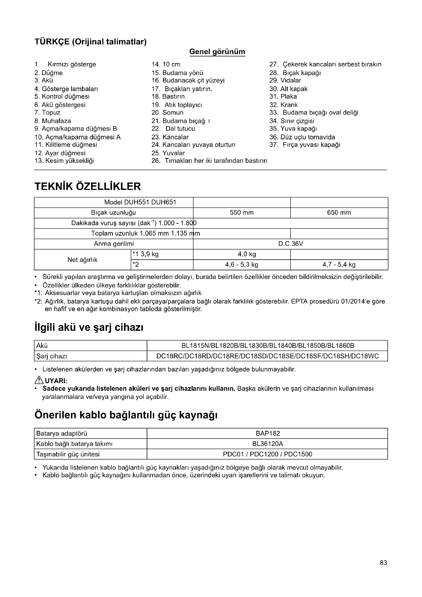 ) 1.000 - 1.800 Toplam uzunluk 1.065 mm 1.135 mm Anma gerilimi D.C.36V Net ağırlık *1 3,9 kg 4,0 kg *2 4,6 - 5,3 kg 4,7 - 5,4 kg Akü BL1815N/BL1820B/BL1830B/BL1840B/BL1850B/BL1860B Şarj cihazı DC18RC/DC18RD/DC18RE/DC18SD/DC18SE/DC18SF/DC18SH/DC18WC Batarya adaptörü BAP182 Kablo bağlı batarya takımı BL36120A Taşınabilir güç ünitesi PDC01 / PDC1200 / PDC150084 Gürültü Tipik A-ağırlıklı gürültü düzeyi (EN62841-4-2 standardına göre belirlenen): ENG907-1