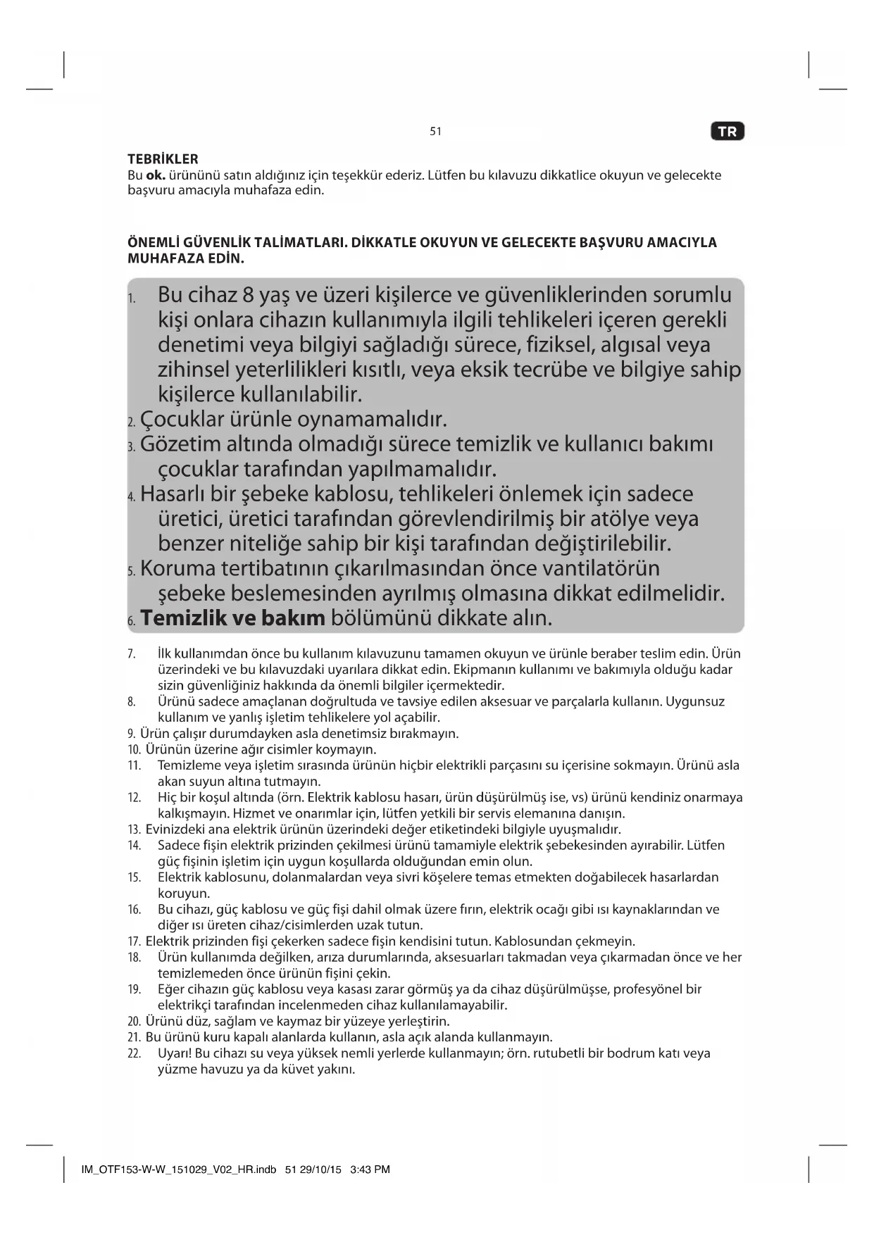 - Çalıştırma sırasında, muhafazanın içerisine parmaklarınızı ya da başka cisimleri sokmayın. IM_OTF153-W-W_151029_V02_HR.indb 53 29/10/15 3:43 PM54