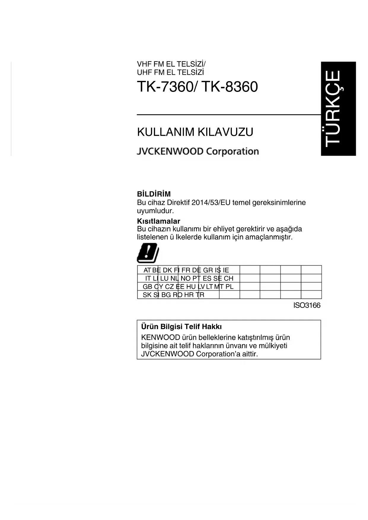 Bu cihaz Direktif 2014/53/EU temel gereksinimlerine uyumludur. Kısıtlamalar Bu cihazın kullanımı bir ehliyet gerektirir ve aşağıda listelenen ü lkelerde kullanım için amaçlanmıştır. AT BE DK FI FR DE GR IS IE IT LI LU NL NO PT ES SE CH GB CY CZ EE HU LV LT MT PL SK SI BG RO HR TR ISO3166 Ürün Bilgisi Telif Hakkı KENWOOD ürün belleklerine katıştırılmış ürün bilgisine ait telif haklarının ünvanı ve mülkiyeti JVCKENWOOD Corporation’a aittir.Kullanılmış Elektrikli ve Elektronik Cihaz ve Pillerin bertaraf edilmesi hakkında bilgi (Ayrışmış atık toplama sistemlerinin kullanıldığı Avrupa Birliği ülkeleri için geçerlidir.) Bu sembolü (üzeri çizili çöp bidonu) içeren ürün ve piller evsel atı k çöpleri ile birlikte atılamaz. Kullanılmış elektrikli ve elektronik cihaz ve piller, bu tür maddeleri ve bunların yan ürünlerini iş lemeye elverişli bir geri kazanım tesisine gönderilmelidir. Size en yakın geri kazanım tesisinin konumunu öğrenmek üzere yerel yetkililerinize danışın. Doğru geri kazanım ve atık uzaklaştırma y öntemleri, sadece öz kaynakların korunmasına yardımcı olmakla kalmayıp ayrıca sağlığımıza ve çevreye olacak zararlı etkilerini engellemeye yardımcı olur. Bu ürün 28300 sayılı Resmi Gazete’de yayımlanan Atik Elektrikli ve Elektronik Eşyalarin Kontrolü Yönetmeliğe uygun olarak üretilmiştir.T-i