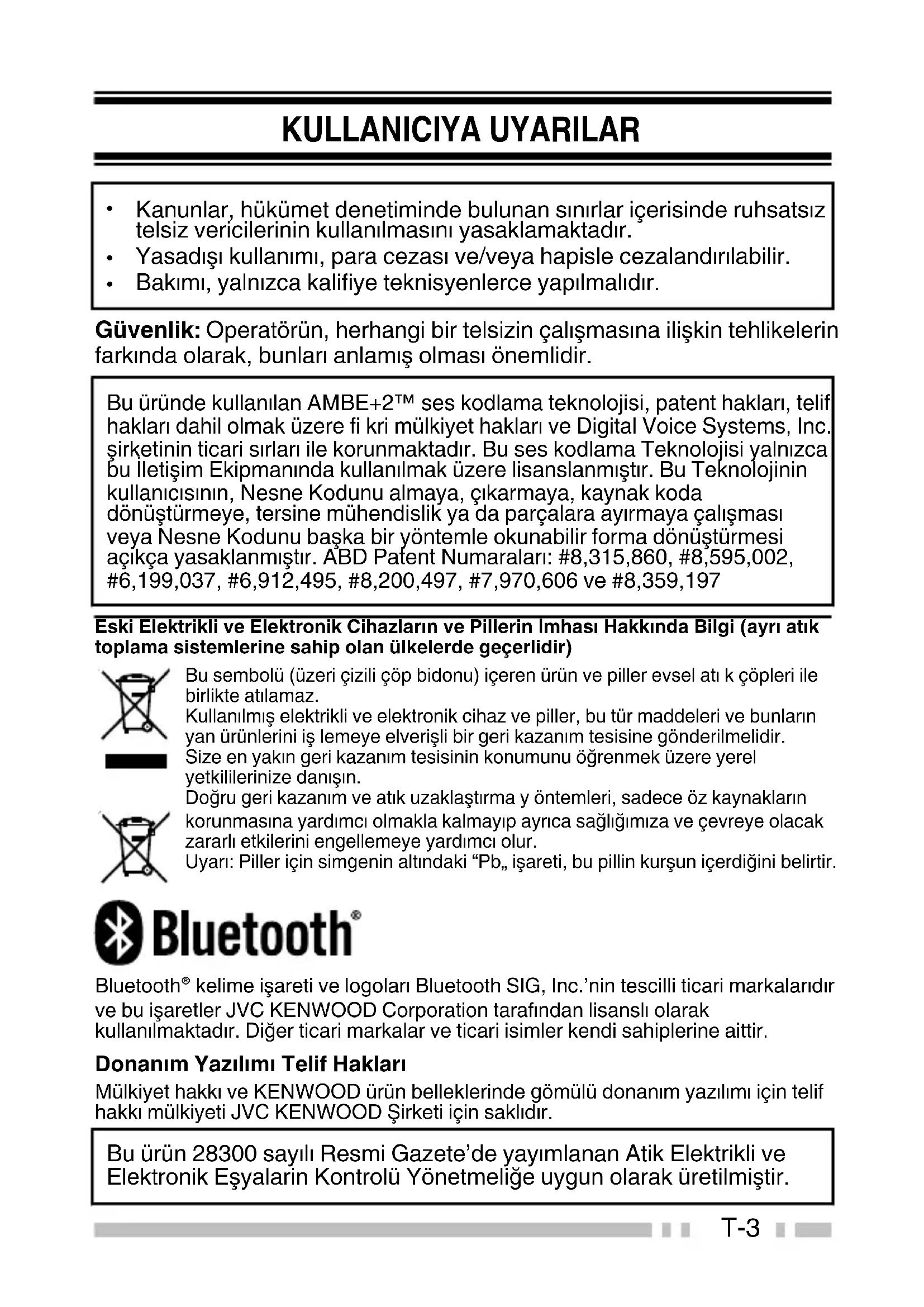 Bakımı, yalnızca kalifiye teknisyenlerce yapılmalıdır. Güvenlik: Operatörün, herhangi bir telsizin çalışmasına ilişkin tehlikelerin farkında olarak, bunları anlamış olması önemlidir. Bu üründe kullanılan AMBE+2™ ses kodlama teknolojisi, patent hakları, telif hakları dahil olmak üzere fi kri mülkiyet hakları ve Digital Voice Systems, Inc. şirketinin ticari sırları ile korunmaktadır. Bu ses kodlama Teknolojisi yalnızca bu İletişim Ekipmanında kullanılmak üzere lisanslanmıştır. Bu Teknolojinin kullanıcısının, Nesne Kodunu almaya, çıkarmaya, kaynak koda dönüştürmeye, tersine mühendislik ya da parçalara ayırmaya çalışması veya Nesne Kodunu başka bir yöntemle okunabilir forma dönüştürmesi açıkça yasaklanmıştır. ABD Patent Numaraları: #8,315,860, #8,595,002, #6,199,037, #6,912,495, #8,200,497, #7,970,606 ve #8,359,197 Eski Elektrikli ve Elektronik Cihazların ve Pillerin İmhası Hakkında Bilgi (ayrı atıktoplama sistemlerine sahip olan ülkelerde geçerlidir).Bu sembolü (üzeri çizili çöp bidonu) içeren ürün ve piller evsel atı k çöpleri ilebirlikte atılamaz.Kullanılmış elektrikli ve elektronik cihaz ve piller, bu tür maddeleri ve bunlarınyan ürünlerini iş lemeye elverişli bir geri kazanım tesisine gönderilmelidir.Size en yakın geri kazanım tesisinin konumunu öğrenmek üzere yerelyetkililerinize danışın.Doğru geri kazanım ve atık uzaklaştırma y öntemleri, sadece öz kaynaklarınkorunmasına yardımcı olmakla kalmayıp ayrıca sağlığımıza ve çevreye olacakzararlı etkilerini engellemeye yardımcı olur.Uyarı: Piller için simgenin altındaki “Pb„ işareti, bu pillin kurşun içerdiğini belirtir...Bluetooth® kelime işareti ve logoları Bluetooth SIG, Inc.’nin tescilli ticari markalarıdırve bu işaretler JVC KENWOOD Corporation tarafından lisanslı olarakkullanılmaktadır. Diğer ticari markalar ve ticari isimler kendi sahiplerine aittir. Donanım Yazılımı Telif Hakları Mülkiyet hakkı ve KENWOOD ürün belleklerinde gömülü donanım yazılımı için telifhakkı mülkiyeti JVC KENWOOD Şirketi için saklıdır.. Bu ürün 28300 sayılı Resmi Gazete’de yayımlanan Atik Elektrikli ve Elektronik Eşyalarin Kontrolü Yönetmeliğe uygun olarak üretilmiştir. T-3İKAZLAR
