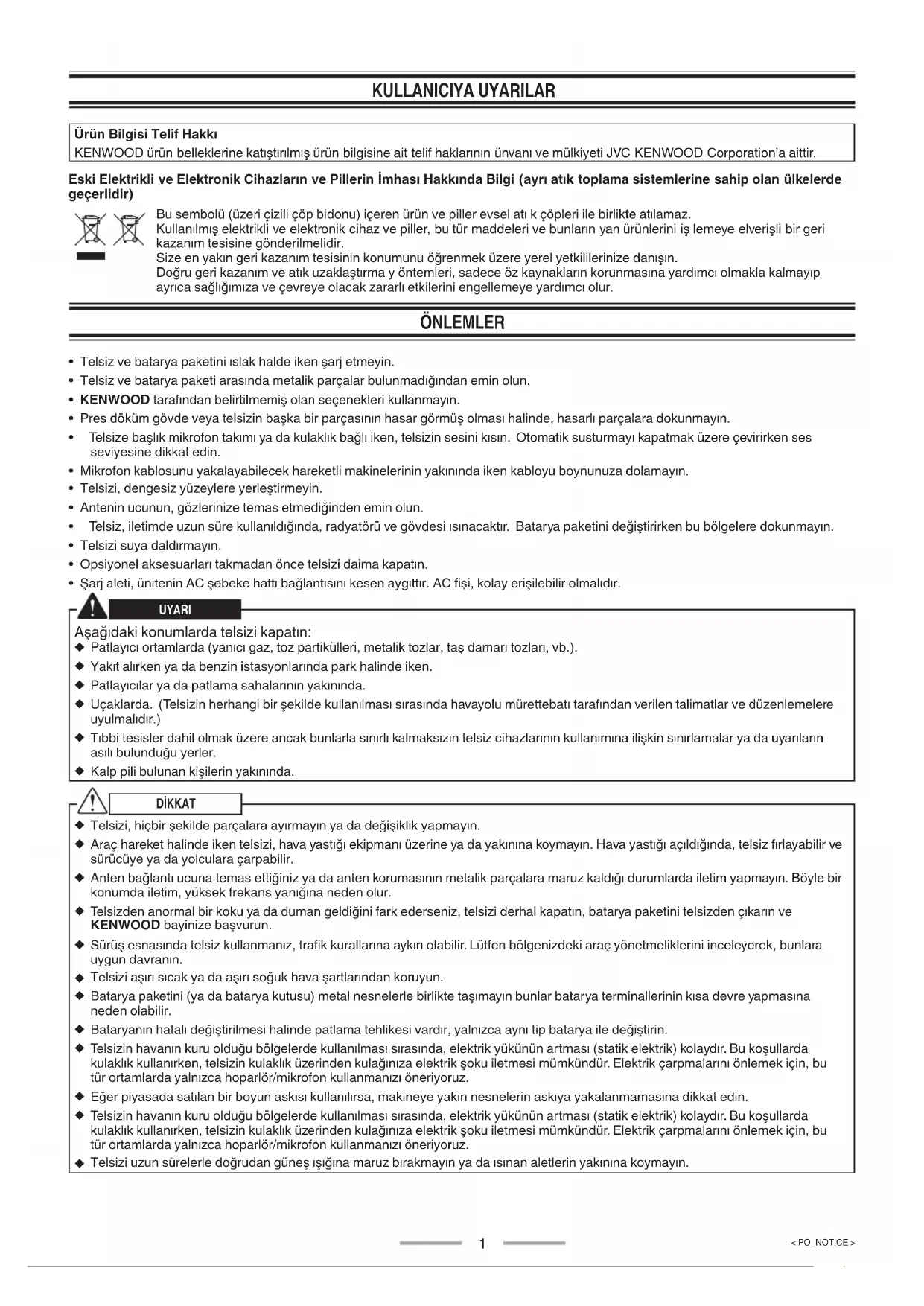 KULLANICIYA UYARILAR Ürün Bilgisi Telif Hakkı KENWOOD ürün belleklerine katıştırılmış ürün bilgisine ait telif haklarının ünvanı ve mülkiyeti JVC KENWOOD Corporation’a aittir. Eski Elektrikli ve Elektronik Cihazların ve Pillerin İmhası Hakkında Bilgi (ayrı atık toplama sistemlerine sahip olan ülkelerde geçerlidir) Bu sembolü (üzeri çizili çöp bidonu) içeren ürün ve piller evsel atı k çöpleri ile birlikte atılamaz. Kullanılmış elektrikli ve elektronik cihaz ve piller, bu tür maddeleri ve bunların yan ürünlerini iş lemeye elverişli bir geri kazanım tesisine gönderilmelidir. Size en yakın geri kazanım tesisinin konumunu öğrenmek üzere yerel yetkililerinize danışın. Doğru geri kazanım ve atık uzaklaştırma y öntemleri, sadece öz kaynakların korunmasına yardımcı olmakla kalmayıp ayrıca sağlığımıza ve çevreye olacak zararlı etkilerini engellemeye yardımcı olur. ÖNLEMLER