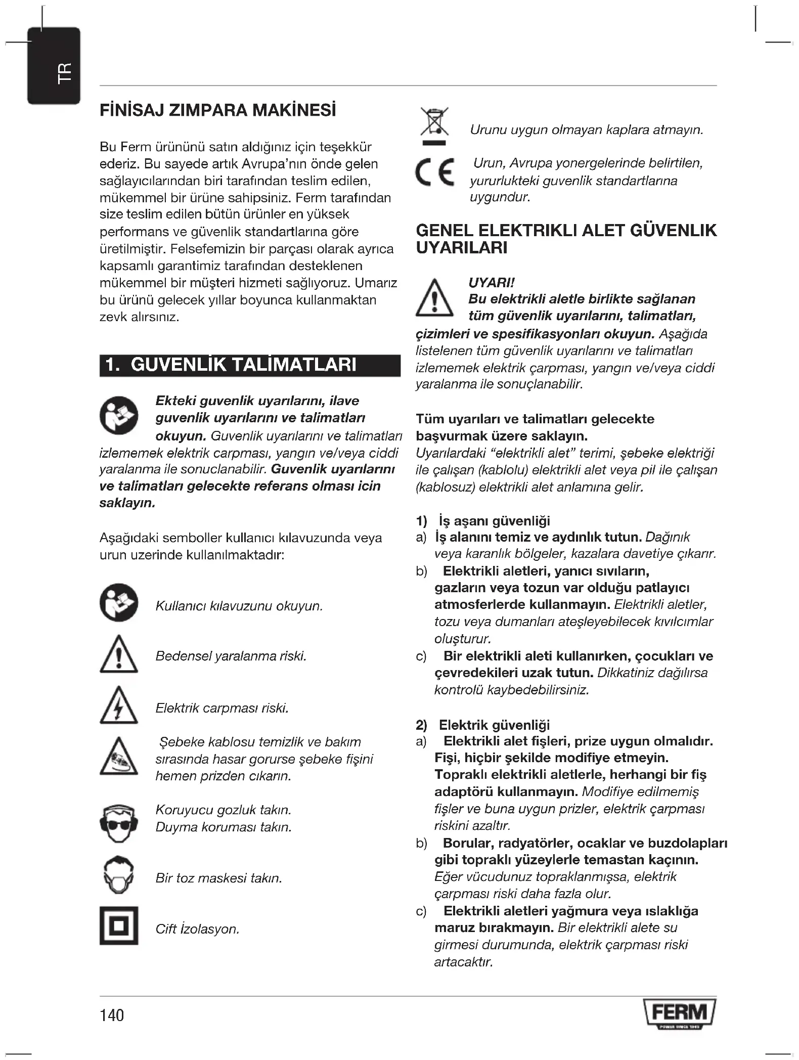 Ekteki guvenlik uyarılarını, ilave guvenlik uyarılarını ve talimatları okuyun. Guvenlik uyarılarını ve talimatları izlememek elektrik carpması, yangın ve/veya ciddi yaralanma ile sonuclanabilir. Guvenlik uyarılarını ve talimatları gelecekte referans olması icin saklayın. Aşağıdaki semboller kullanıcı kılavuzunda veya urun uzerinde kullanılmaktadır: Kullanıcı kılavuzunu okuyun. Bedensel yaralanma riski. Elektrik carpması riski. Şebeke kablosu temizlik ve bakım sırasında hasar gorurse şebeke fişini hemen prizden cıkarın. Koruyucu gozluk takın. Duyma koruması takın. Bir toz maskesi takın. Cift İzolasyon. Urunu uygun olmayan kaplara atmayın. Urun, Avrupa yonergelerinde belirtilen, yururlukteki guvenlik standartlarına uygundur.