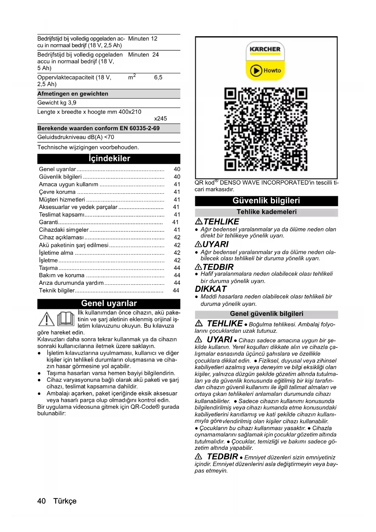 r duruma yönelik uyarı. DIKKAT ● Maddi hasarlara neden olabilecek olası tehlikeli bir duruma yönelik uyarı. Genel güvenlik bilgileri TEHLIKE ● Boğulma tehlikesi. Ambalaj folyo- larını çocuklardan uzak tutunuz. 몇 UYARI ● Cihazı sadece amacına uygun bir şe- kilde kullanın. Yerel koşulları dikkate alın ve cihazla ça- lışmalar esnasında üçüncü şahıslara ve özellikle çocuklara dikkat edin. ● Fiziksel, duyusal veya zihinsel kabiliyetleri azalmış veya deneyim ve bilgi eksikliği olan kişiler, yalnızca düzgün şekilde gözetim altında tutulma- ları ya da güvenlik konusunda eğitilmiş bir kişi tarafın- dan cihazın güvenli kullanımı ile ilgili talimat almaları ve ortaya çıkan tehlikeleri anlamaları durumunda cihazı kullanabilirler. ● Sadece cihazın kullanımı konusunda bilgilendirilmiş veya cihazı kumanda etme konusundaki kabiliyetlerini kanıtlamış ve kati şekilde cihazın kullanı- mıyla göre vlendirilmiş olan kişiler cihazı kullanabilir. ● Çocukların bu cihazı kullanması yasaktır. ● Cihazla oynamamalarını sağlamak için çocuklar gözetim altında tutulmalıdır. ● Çocuklar, temizliği ve bakımı sadece gö- zetim altında yapabilir. 몇 TEDBIR ● Emniyet düzenleri sizin emniyetiniz içindir. Emniyet düzenlerini asla değiştirmeyin veya bay- pas etmeyin. Bedrijfstijd bij volledig opgeladen ac- cu in normaal bedrijf (18 V, 2,5 Ah) Minuten 12 Bedrijfstijd bij volledig opgeladen accu in normaal bedrijf (18 V, 5 Ah) Minuten 24 Oppervlaktecapaciteit (18 V, 2,5 Ah)