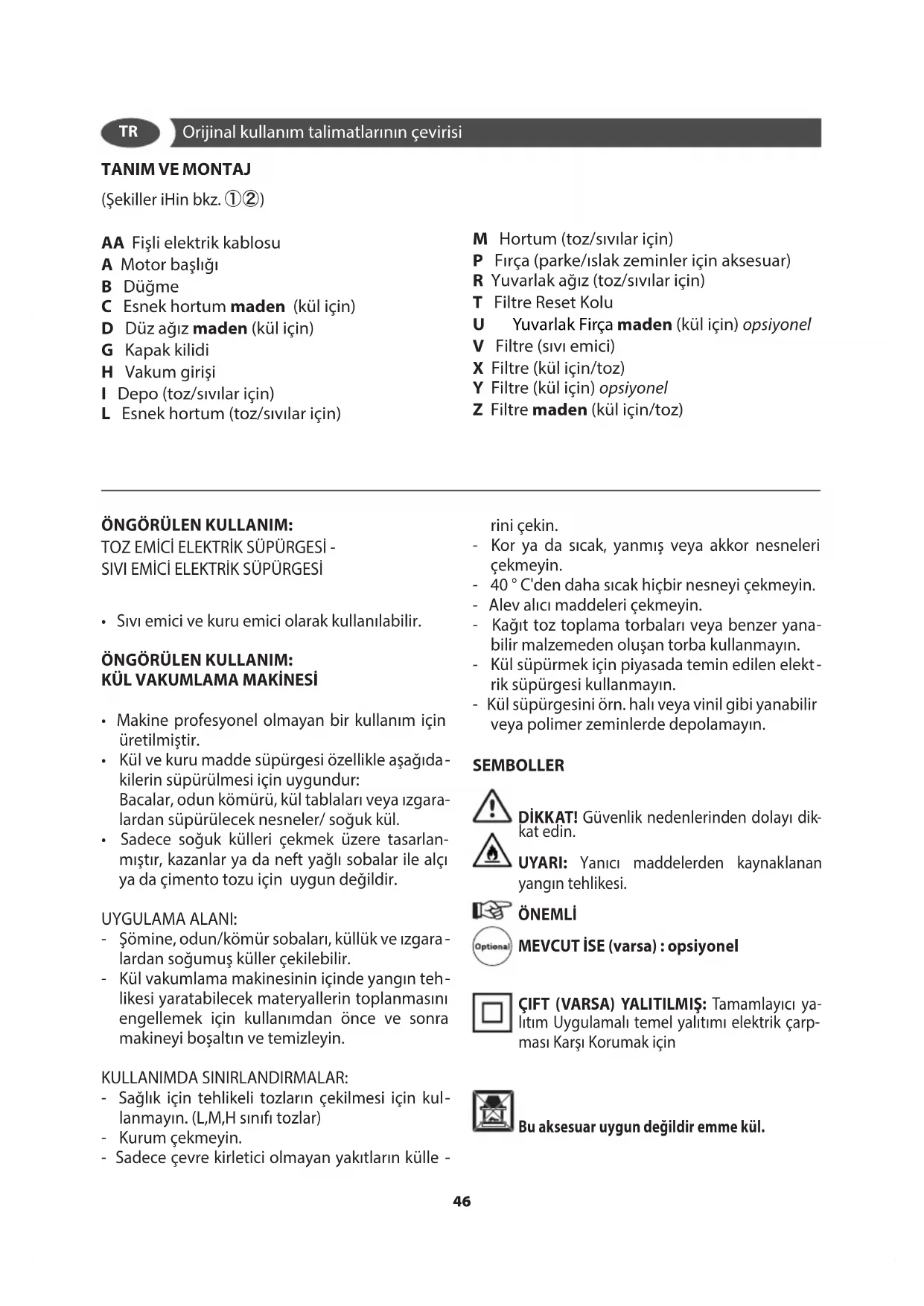 (ekller n bkz. ①②) AA Fili elektrik kablosu A Motor balığı B Düğme C Esnek hortum maden (kül çn) D Düz ağız maden (kül çn) G Kapak kld H Vakum gr I Depo (toz/sıvılar çn) L Esnek hortum (toz/sıvılar çn) M Hortum (toz/sıvılar çn) P Fırça (parke/ıslak zemnler çn aksesuar) R Yuvarlak ağız (toz/sıvılar çn) T Fltre Reset Kolu U Yuvarlak Firça maden (kül çn) opsiyonel V Fltre (sıvı emc) X Fltre (kül çn/toz) Y Fltre (kül çn) opsiyonel Z Fltre maden (kül çn/toz) ÖNGÖRÜLEN KULLANIM: TOZ EMİCİ ELEKTRİK SÜPÜRGESİ - SIVI EMİCİ ELEKTRİK SÜPÜRGESİ