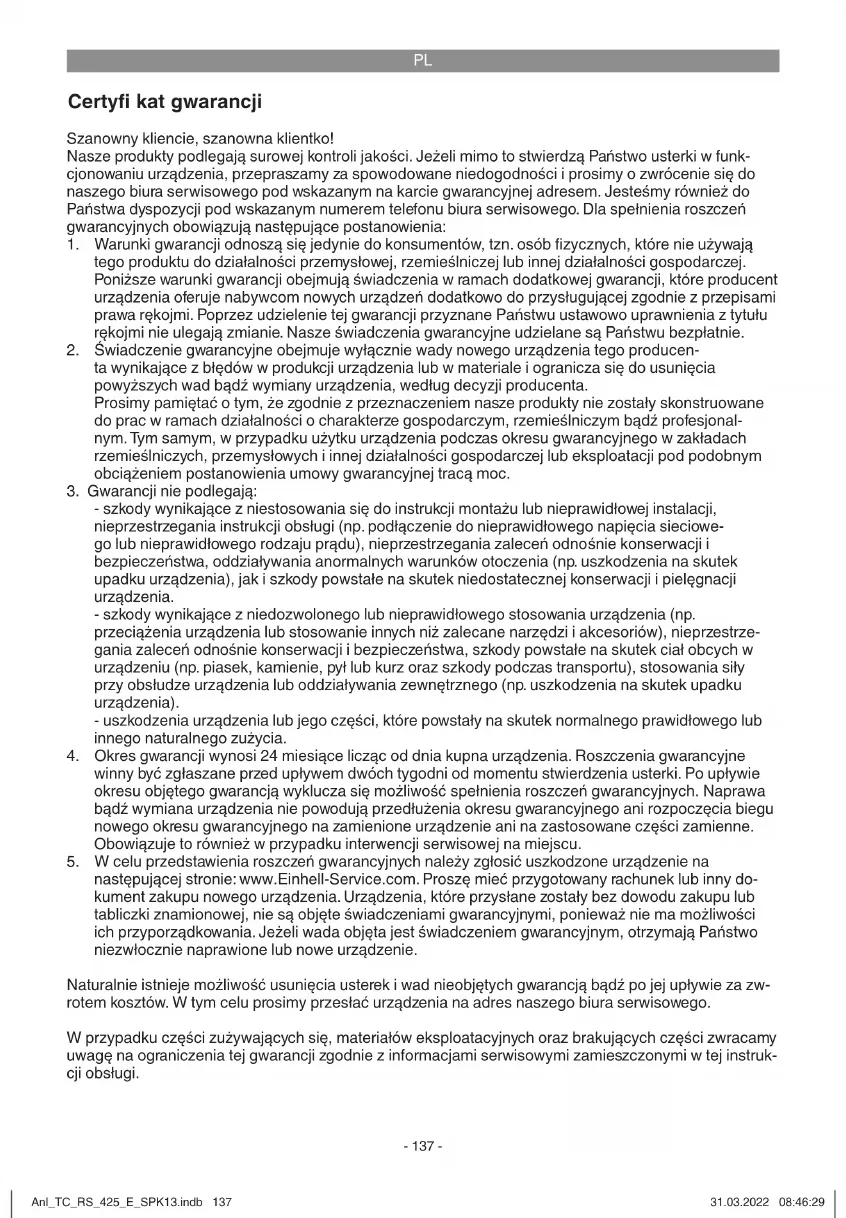 bildirin. Kasa fi şi veya yeni aletinizi satın aldığınızı belgeleyen diğer bir evrağı hazır tutun. Kasa fi şi veya tip etiketi olmaksızın gönderilen aletler, aletin tam olarak tanımlanma olanağının bulunmaması nedeniyle garanti hizmetleri dışındadır. Aletinizin arızası garanti hizmetleri kapsamındaysa en kısa zamanda onarılmış veya yeni bir alet adresinize gönderilecektir. Ayrıca garanti kapsamına dahil olmayan veya garanti süresi dolan arızaları ücreti karşılığında memnuniy- etle onarırız. Bunun için aleti lütfen Servis adresimize gönderin. Aşınma, sarf ve eksik parçalar için bu Kullanma Talimatının servis bilgileri bölümündeki garanti koşullarında belirtilen kısıtlamalara atıfta bulunuruz. Anl_TC_RS_425_E_SPK13.indb 144Anl_TC_RS_425_E_SPK13.indb 144 31.03.2022 08:46:3031.03.2022 08:46:30EE