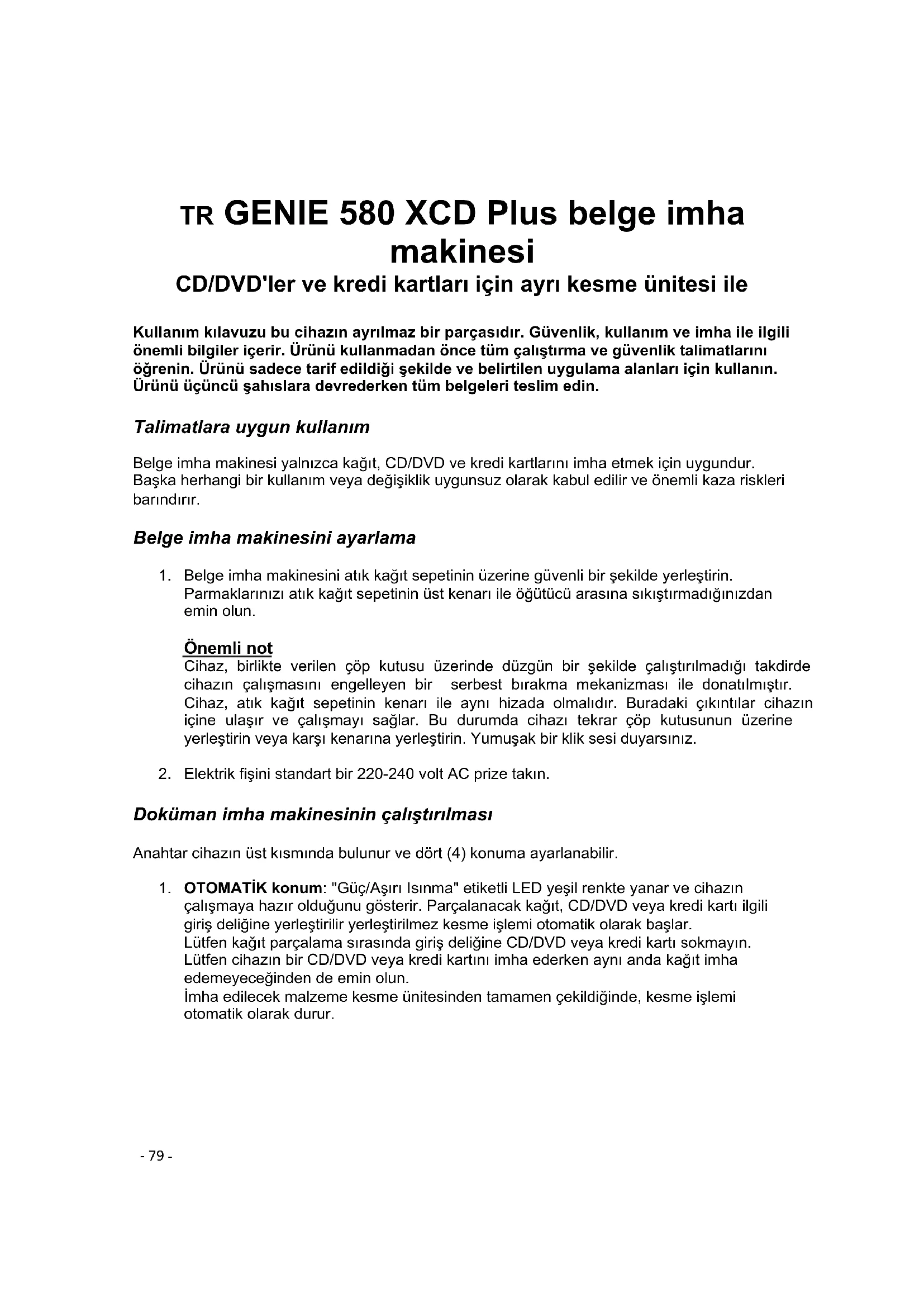 www.go-europe.com service@go-europe.com Δήλωση συμμόρφωσης Το σήμα CE στη συσκευή επιβεβαιώνει τη συμμόρφωση. Η δήλωση συμμόρφωσης διατίθεται στη διεύθυνση www.go-europe.com.- 79 - TR GENIE 580 XCD Plus belge imha makinesi CD/DVD'ler ve kredi kartları için ayrı kesme ünitesi ile Kullanım kılavuzu bu cihazın ayrılmaz bir parçasıdır. Güvenlik, kullanım ve imha ile ilgili önemli bilgiler içerir. Ürünü kullanmadan önce tüm çalıştırma ve güvenlik talimatlarını öğrenin. Ürünü sadece tarif edildiği şekilde ve belirtilen uygulama alanları için kullanın. Ürünü üçüncü şahıslara devrederken tüm belgeleri teslim edin.