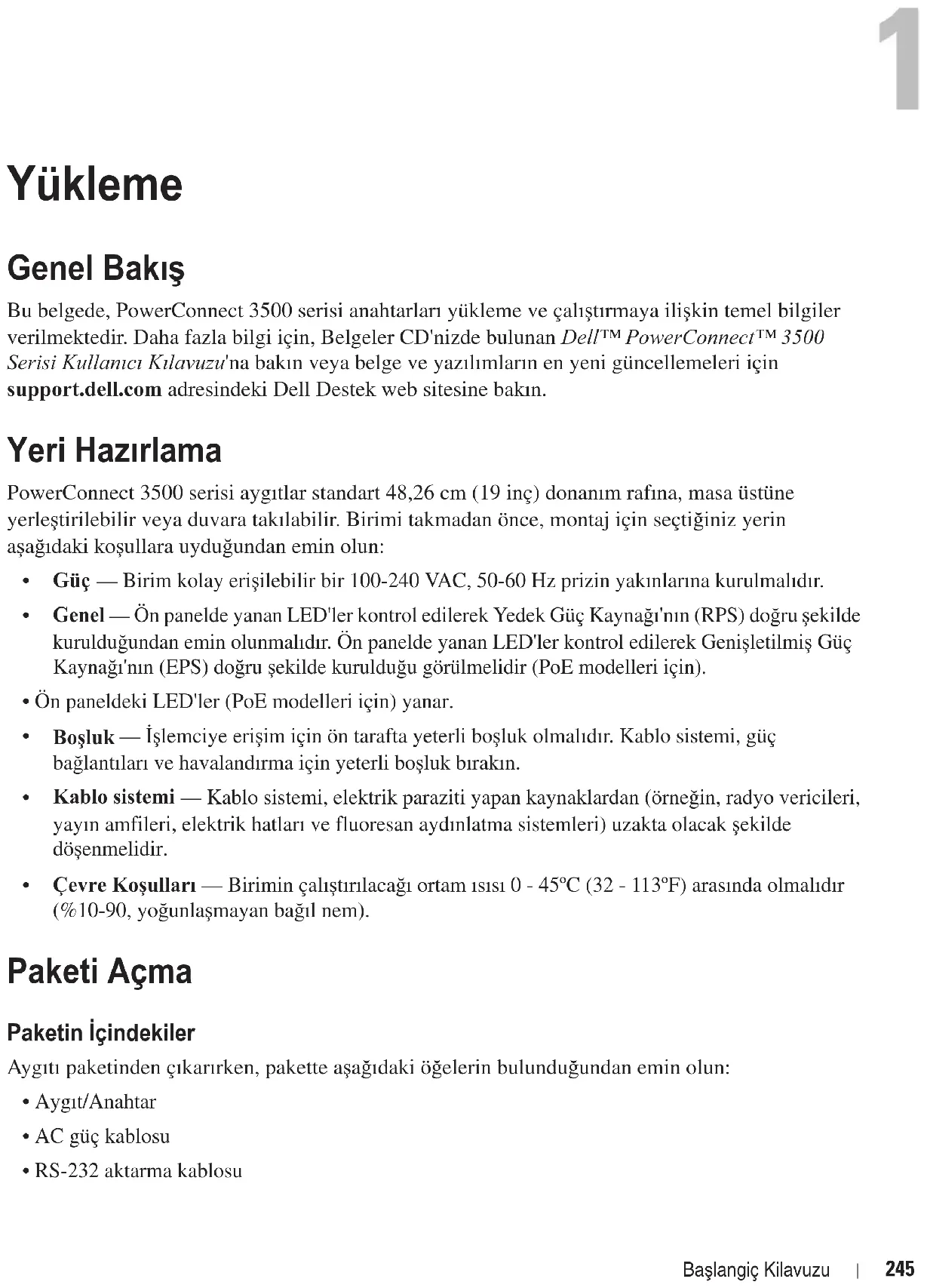 Yükleme Genel Bakış Bu belgede, PowerConnect 3500 serisi anahtarları yükleme ve çalıştırmaya ilişkin temel bilgiler verilmektedir. Daha fazla bilgi için, Belgeler CD'nizde bulunan Dell™ PowerConnect™ 3500 Serisi Kullanıcı Kılavuzu'na bakın veya belge ve yazılımların en yeni güncellemeleri için support.dell.com adresindeki Dell Destek web sitesine bakın. Yeri Hazırlama PowerConnect 3500 serisi aygıtlar standart 48,26 cm (19 inç) donanım rafına, masa üstüne yerleştirilebilir veya duvara takılabilir. Birimi takmadan önce, montaj için seçtiğiniz yerin aşağıdaki koşullara uyduğundan emin olun: