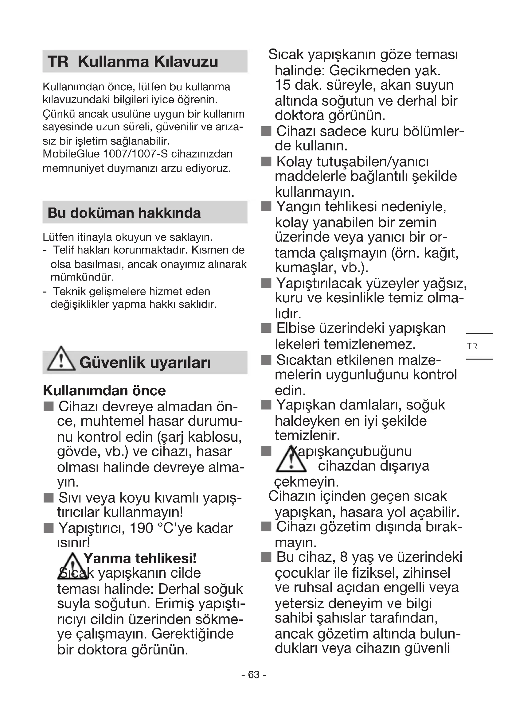 ΕΓΓΥΗΣΗ- 63 - TR Kullanma Kılavuzu Kullanımdan önce, lütfen bu kullanma kılavuzundaki bilgileri iyice öğrenin. Çünkü ancak usulüne uygun bir kullanım sayesinde uzun süreli, güvenilir ve arıza- sız bir işletim sağlanabilir. MobileGlue 1007/1007-S cihazınızdan memnuniyet duymanızı arzu ediyoruz. Bu doküman hakkında Lütfen itinayla okuyun ve saklayın. - Telif hakları korunmaktadır. Kısmen de olsa basılması, ancak onayımız alınarak mümkündür. - Teknik gelişmelere hizmet eden değişiklikler yapma hakkı saklıdır. Kullanımdan önce Cihazı devreye almadan ön- ce, muhtemel hasar durumu- nu kontrol edin (şarj kablosu, gövde, vb.) ve cihazı, hasar olması halinde devreye alma- yın. Sıvı veya koyu kıvamlı yapış- tırıcılar kullanmayın! Yapıştırıcı, 190 °C'ye kadar ısınır! Yanma tehlikesi! Sıcak yapışkanın cilde teması halinde: Derhal soğuk suyla soğutun. Erimiş yapıştı- rıcıyı cildin üzerinden sökme- ye çalışmayın. Gerektiğinde bir doktora görünün. Güvenlik uyarıları Sıcak yapışkanın göze teması halinde: Gecikmeden yak. 15 dak. süreyle, akan suyun altında soğutun ve derhal bir doktora görünün. Cihazı sadece kuru bölümler- de kullanın. Kolay tutuşabilen/yanıcı maddelerle bağlantılı şekilde kullanmayın. Yangın tehlikesi nedeniyle, kolay yanabilen bir zemin üzerinde veya yanıcı bir or- tamda çalışmayın (örn. kağıt, kumaşlar, vb.). Yapıştırılacak yüzeyler yağsız, kuru ve kesinlikle temiz olma- lıdır. Elbise üzerindeki yapışkan lekeleri temizlenemez. Sıcaktan etkilenen malze- melerin uygunluğunu kontrol edin. Yapışkan damlaları, soğuk haldeyken en iyi şekilde temizlenir. Yapışkan çubuğunu cihazdan dışarıya çekmeyin. Cihazın içinden geçen sıcak yapışkan, hasara yol açabilir. Cihazı gözetim dışında bırak- mayın. Bu cihaz, 8 yaş ve üzerindeki çocuklar ile fiziksel, zihinsel ve ruhsal açıdan engelli veya yetersiz deneyim ve bilgi sahibi şahıslar tarafından, ancak gözetim altında bulun- dukları veya cihazın güvenli TR- 64 - kullanımı ve bundan kaynak- lanacak tehlikeler hakkında bilgi edindikleri takdirde kullanılabilir. Çocuklar cihazla oynamama- lıdır. Temizlik ve kullanıcı bakımı, gözetim altında olma- yan çocuklar tarafından yapılamaz. Kusursuz bir fonksiyon sade- ce, orijinal STEINEL yapışkan çubuklarının kullanımıyla sağlanır. USB şarj kablosu Şarj kablosunu temiz tutun. Kirlenme nedeniyle, elektrik çarpma tehlikesi ortaya çıkar. Cihazı, 0 °C ila 35 °C sıcaklık aralığında saklayın. Cihazı sadece, birlikte ve- rilen USB şarj kablosu (tip 15.3841) ile şarj edin. Yaban- cı aküleri şarj etmeyin. Aksi halde, yangın ve patlama riski ortaya çıkar. Akü Cihazı ve aküyü açmayın. Kısa devre tehlikesi ortaya çı- kar. Akü, yerinden alınmama- lıdır. Sorun çıkması halinde, satış yerine başvurun. Lityum iyon akü, çalışma öm- rü kısalmaksızın her zaman şarj edilebilir. Şarj işlemine ara verilmesi, akünün hasar- lanmasına yol açmaz. Amacına uygun kullanım Bu elektrikli alet sadece, bilinen el işi malzemeleri ile model yapım parçaları- nın, ev ortamında çözücü madde kulla- nılmadan yapıştırılması için uygundur. Uzun süreli kullanılmaması halinde, cihazı şarjlı aküyle saklayın. Bu durum, lityum iyon akünün çalışma ömrünü uzatır. Usulüne aykırı kullanım ve akünün hasarlanması halinde, dışarıya buhar sızabilir. Rahatsızlık hissettiğinizde, bir doktora başvurun ve taze hava temin edin. Buharlar, solunum yollarını tahriş edebilir. Kullanım alanı Lityum iyon akülü, şarjlı sıcak tutkal kalemi. Model yapımı, süsleme ve onarımlar için ideal çok amaçlı yapıştırıcı. Kağıt, karton, mantar, ahşap, deri, kumaş, plastik, seramik, köpük, fayans, vb. için uygundur.- 65 - Cihaz açıklaması USB şarj kablosu LED gösterge Şarj kablosu için soket AÇMA/KAPAMA düğmesi Sürücü-çekici Yapışkan çubuğu Fonksiyon ve kullanım ■ Akünün çalışma ömrünü uzatmak için, ilk devreye alma sırasında tam olarak (2-3 saat) şarj edin. (bkz. Şarj/İşletim) ■ Yapışkan çubuğunu, ısıtma kanalına yerleştirin. ■ İlk devreye alma sırasında ısıtma bölmesine yapışkan dolması için, iticiye birkaç defa basılması gerekir. Bu arada icabında, yapışkan çubuğu- nun arkasından hafifçe bastırılması da gerekebilir. ■ Cihazın gözetimsiz çalıştırılmaması amacıyla, düğme yak. 2 san. süreyle basılı tutulmalıdır. Yeşil LED, 15 san. yanıp söner. ■ İticiyi çalıştırın ve yapışkanı tek taraflı olarak sürün. ■ Yapıştırılacak malzemeleri kuvvetlice bastırın ve gerektiğinde düzeltin. ■ Oldukça kısa süre sonra (yak. 2 daki- ka), yapıştırma yerine tam yük uygula- nabilir! ■ Büyük yüzeyli, uzun iş parçalarında, noktalar halinde yapıştırma önerilir. ■ Sert köpükler de (örn. stropor) hiç sorunsuz işlenebilir. Bu sırada özellik- le, sıcak yapıştırıcının stroporun üzeri- ne değil zemine sürülmesinin gerektiği göz önünde bulundurulmalıdır. ■ Kumaşların vb. malzemelerin yapıştı- rılması için, sıcak yapıştırıcının "kavisli şekilde" sürülmesi önerilmektedir. ■ Cihazı, kullanımdan sonra soğutun. Şarj / İşletim MobileGlue 1007/1007-S aküsü, kısmen şarjlı sevk edilmektedir. Tam kapasitenin elde edilebilmesi için, ilk kullanımdan önce aküyü tam olarak (yak. 2-3 saat) şarj edin. Şarj işlemi sırasında MobileGlue 1007/1007-S kullanılamaz. Şarj işlemine ara verilmesi, akünün hasarlanmasına yol açmaz. Akü, çalış- ma ömrü kısalmaksızın her zaman şarj edilebilir. "Elektronic Cell Protection (ECP)" sayesinde akü, tamamen boşalmaya karşı korunmuştur. Akü boşaldığında, MobileGlue 1007/1007-S bir koruyucu kontak yardımıyla kapatılır ve yapı