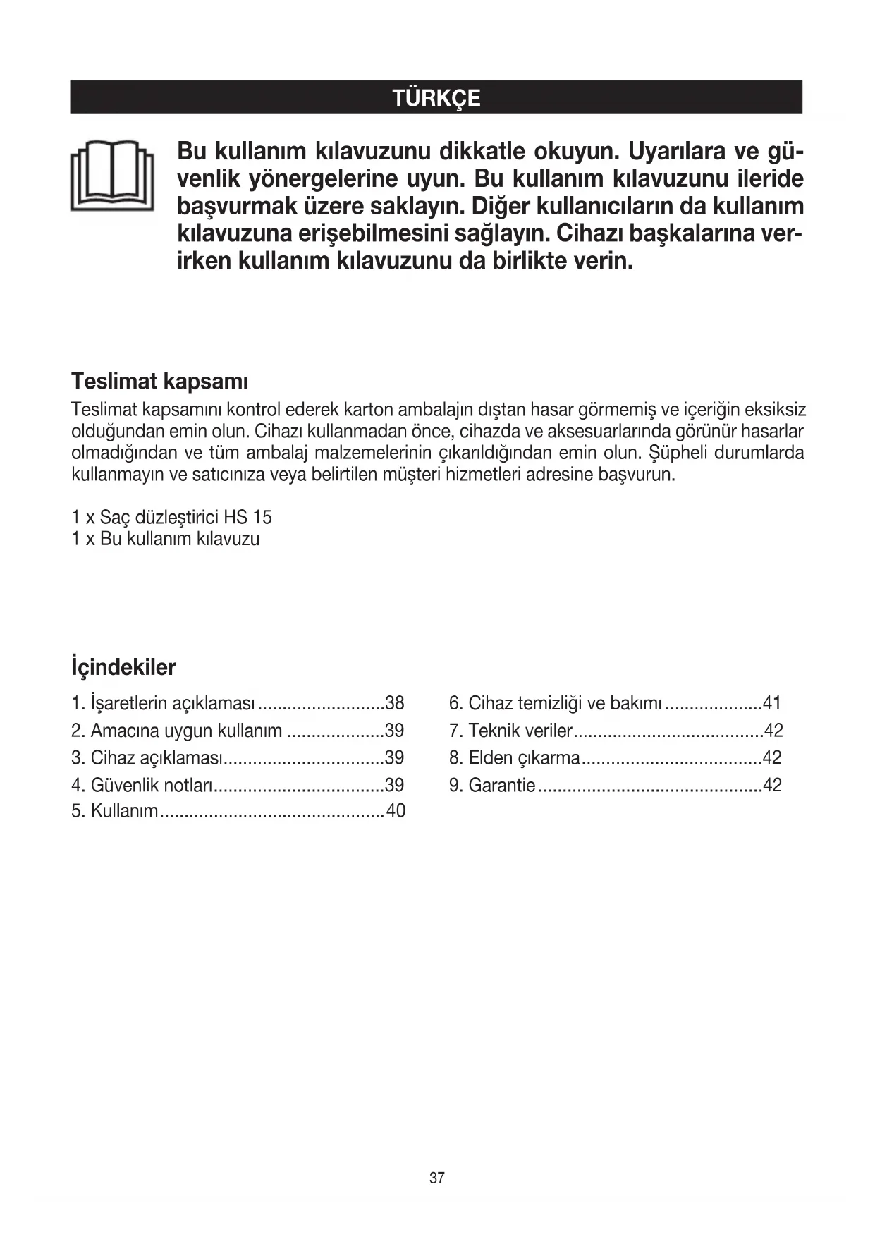 irken kullanım kılavuzunu da birlikte verin. Teslimat kapsamı Teslimat kapsamını kontrol ederek karton ambalajın dıştan hasar görmemiş ve içeriğin eksiksiz olduğundan emin olun. Cihazı kullanmadan önce, cihazda ve aksesuarlarında görünür hasarlar olmadığından ve tüm ambalaj malzemelerinin çıkarıldığından emin olun. Şüpheli durumlarda kullanmayın ve satıcınıza veya belirtilen müşteri hizmetleri adresine başvurun. 1 x Saç düzleştirici HS 15 1 x Bu kullanım kılavuzu