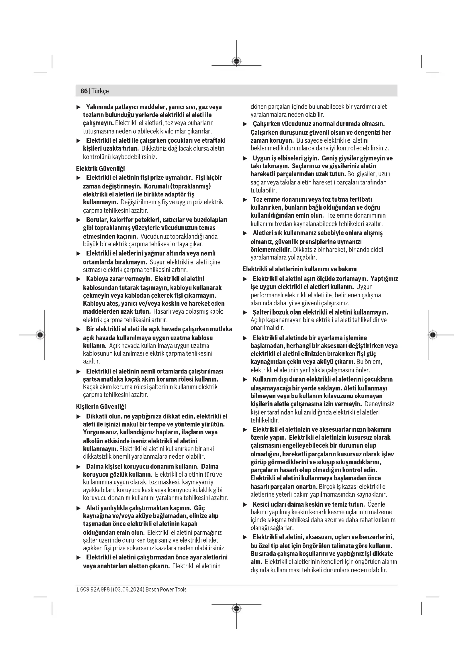 Μην ρίχνετε τα ηλεκτρικά εργαλεία στα απορρίμ- ματα του σπιτιού σας! Μόνο για χώρες τηςΕΕ: Τα άχρηστα ηλεκτρικά εργαλεία πρέπει να αποσύρονται ξεχω- ριστά. Χρησιμοποιείτε τα προβλεπόμενα συστήματα συλλογής. Σε περίπτωση μη ενδεδειγμένης απόσυρσης οι ηλεκτρικές και ηλεκτρονικές συσκευές λόγω ενδεχομένης παρουσίας επικίν- δυνων ουσιών μπορούν να έχουν επιβλαβείς επιπτώσεις στο περιβάλλον και στην ανθρώπινη υγεία. Türkçe Güvenlik talimatı Elektrikli el aletleri için genel güvenlik uyarıları UYARI Bu elektrikli el aletiyle birlikte gelen tüm güvenlik uyarılarını, talimatları, resim ve açıklamaları okuyun. Aşağıda bulunan talimatlara uyulmaması halinde elektrik çarpmalarına, yangınlara ve/veya ağır yaralanmalara neden olabilir. Bütün uyarıları ve talimat hükümlerini ileride kullanmak üzere saklayın. Uyarı ve talimat hükümlerinde kullanılan "elektrikli el aleti" terimi, akım şebekesine bağlı (elektrikli) aletlerle akü ile çalışan aletleri (akülü) kapsamaktadır. Çalışma yeri güvenliği u Çalıştığınız yeri temiz tutun ve iyi aydınlatın. Dağınık veya karanlık alanlar kazalara davetiye çıkarır. Bosch Power Tools 1 609 92A 9F8 | (03.06.2024)86 | Türkçe u Yakınında patlayıcı maddeler, yanıcı sıvı, gaz veya tozların bulunduğu yerlerde elektrikli el aleti ile çalışmayın. Elektrikli el aletleri, toz veya buharların tutuşmasına neden olabilecek kıvılcımlar çıkarırlar. u Elektrikli el aleti ile çalışırken çocukları ve etraftaki kişileri uzakta tutun. Dikkatiniz dağılacak olursa aletin kontrolünü kaybedebilirsiniz. Elektrik Güvenliği u Elektrikli el aletinin fişi prize uymalıdır. Fişi hiçbir zaman değiştirmeyin. Korumalı (topraklanmış) elektrikli el aletleri ile birlikte adaptör fiş kullanmayın. Değiştirilmemiş fiş ve uygun priz elektrik çarpma tehlikesini azaltır. u Borular, kalorifer petekleri, ısıtıcılar ve buzdolapları gibi topraklanmış yüzeylerle vücudunuzun temas etmesinden kaçının. Vücudunuz topraklandığı anda büyük bir elektrik çarpma tehlikesi ortaya çıkar. u Elektrikli el aletlerini yağmur altında veya nemli ortamlarda bırakmayın. Suyun elektrikli el aleti içine sızması elektrik çarpma tehlikesini artırır. u Kabloya zarar vermeyin. Elektrikli el aletini kablosundan tutarak taşımayın, kabloyu kullanarak çekmeyin veya kablodan çekerek fişi çıkarmayın. Kabloyu ateş, yanıcı ve/veya keskin ve hareket eden maddelerden uzak tutun. Hasarlı veya dolaşmış kablo elektrik çarpma tehlikesini artırır. u Bir elektrikli el aleti ile açık havada çalışırken mutlaka açık havada kullanılmaya uygun uzatma kablosu kullanın. Açık havada kullanılmaya uygun uzatma kablosunun kullanılması elektrik çarpma tehlikesini azaltır. u Elektrikli el aletinin nemli ortamlarda çalıştırılması şartsa mutlaka kaçak akım koruma rölesi kullanın. Kaçak akım koruma rölesi şalterinin kullanımı elektrik çarpma tehlikesini azaltır. Kişilerin Güvenliği u Dikkatli olun, ne yaptığınıza dikkat edin, elektrikli el aleti ile işinizi makul bir tempo ve yöntemle yürütün. Yorgunsanız, kullandığınız hapların, ilaçların veya alkolün etkisinde iseniz elektrikli el aletini kullanmayın. Elektrikli el aletini kullanırken bir anki dikkatsizlik önemli yaralanmalara neden olabilir. u Daima kişisel koruyucu donanım kullanın. Daima koruyucu gözlük kullanın. Elektrikli el aletinin türü ve kullanımına uygun olarak; toz maskesi, kaymayan iş ayakkabıları, koruyucu kask veya koruyucu kulaklık gibi koruyucu donanım kullanımı yaralanma tehlikesini azaltır. u Aleti yanlışlıkla çalıştırmaktan kaçının. Güç kaynağına ve/veya aküye bağlamadan, elinize alıp taşımadan önce elektrikli el aletinin kapalı olduğundan emin olun. Elektrikli el aletini parmağınız şalter üzerinde dururken taşırsanız ve elektrikli el aleti açıkken fişi prize sokarsanız kazalara neden olabilirsiniz. u Elektrikli el aletini çalıştırmadan önce ayar aletlerini veya anahtarları aletten çıkarın. Elektrikli el aletinin dönen parçaları içinde bulunabilecek bir yardımcı alet yaralanmalara neden olabilir. u Çalışırken vücudunuz anormal durumda olmasın. Çalışırken duruşunuz güvenli olsun ve dengenizi her zaman koruyun. Bu sayede elektrikli el aletini beklenmedik durumlarda daha iyi kontrol edebilirsiniz. u Uygun iş elbiseleri giyin. Geniş giysiler giymeyin ve takı takmayın. Saçlarınızı ve giysileriniz aletin hareketli parçalarından uzak tutun. Bol giysiler, uzun saçlar veya takılar aletin hareketli parçaları tarafından tutulabilir. u Toz emme donanımı veya toz tutma tertibatı kullanırken, bunların bağlı olduğundan ve doğru kullanıldığından emin olun. Toz emme donanımının kullanımı tozdan kaynalanabilecek tehlikeleri azaltır. u Aletleri sık kullanmanız sebebiyle onlara alışmış olmanız, güvenlik prensiplerine uymanızı önlememelidir. Dikkatsiz bir hareket, bir anda ciddi yaralanmalara yol açabilir. Elektrikli el aletlerinin kullanımı ve bakımı u Elektrikli el aletini aşırı ölçüde zorlamayın. Yaptığınız işe uygun elektrikli el aletleri kullanın. Uygun performanslı elektrikli el aleti ile, belirlenen çalışma alanında daha iyi ve güvenli çalışırsınız. u Şalteri bozuk olan elektrikli el aletini kullanmayın. Açılıp kapanamayan bir elektrikli el aleti tehlikelidir ve onarılmalıdır. u Elektrikli el aletinde bir ayarlama işlemine başlamadan, herhangi bir aksesuarı değiştirirken veya
