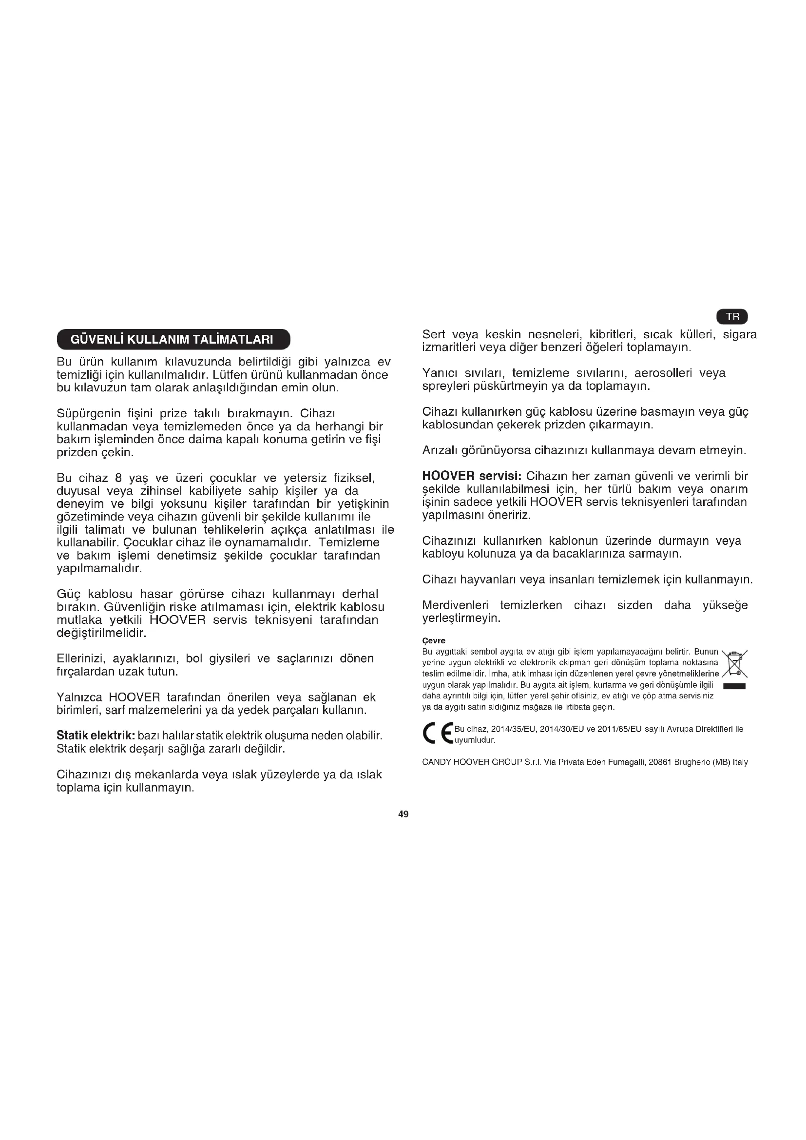 Bu ürün kullanım kılavuzunda belirtildiği gibi yalnızca ev temizliği için kullanılmalıdır. Lütfen ürünü kullanmadan önce bu kılavuzun tam olarak anlaşıldığından emin olun. Süpürgenin şini prize takılı bırakmayın. Cihazı kullanmadan veya temizlemeden önce ya da herhangi bir bakım işleminden önce daima kapalı konuma getirin ve şi prizden çekin. Bu cihaz 8 yaş ve üzeri çocuklar ve yetersiz ziksel, duyusal veya zihinsel kabiliyete sahip kişiler ya da deneyim ve bilgi yoksunu kişiler tarafından bir yetişkinin gözetiminde veya cihazın güvenli bir şekilde kullanımı ile ilgili talimatı ve bulunan tehlikelerin açıkça anlatılması ile kullanabilir. Çocuklar cihaz ile oynamamalıdır. Temizleme ve bakım işlemi denetimsiz şekilde çocuklar tarafından yapılmamalıdır. Güç kablosu hasar görürse cihazı kullanmayı derhal bırakın. Güvenliğin riske atılmaması için, elektrik kablosu mutlaka yetkili HOOVER servis teknisyeni tarafından değiştirilmelidir. Ellerinizi, ayaklarınızı, bol giysileri ve saçlarınızı dönen fırçalardan uzak tutun. Yalnızca HOOVER tarafından önerilen veya sağlanan ek birimleri, sarf malzemelerini ya da yedek parçaları kullanın. Statik elektrik: bazı halılar statik elektrik oluşuma neden olabilir. Statik elektrik deşarjı sağlığa zararlı değildir. Cihazınızı dış mekanlarda veya ıslak yüzeylerde ya da ıslak toplama için kullanmayın. Sert veya keskin nesneleri, kibritleri, sıcak külleri, sigara izmaritleri veya diğer benzeri öğeleri toplamayın. Yanıcı sıvıları, temizleme sıvılarını, aerosolleri veya spreyleri püskürtmeyin ya da toplamayın. Cihazı kullanırken güç kablosu üzerine basmayın veya güç kablosundan çekerek prizden çıkarmayın. Arızalı görünüyorsa cihazınızı kullanmaya devam etmeyin. HOOVER servisi: Cihazın her zaman güvenli ve verimli bir şekilde kullanılabilmesi için, her türlü bakım veya onarım işinin sadece yetkili HOOVER servis teknisyenleri tarafından yapılmasını öneririz. Cihazınızı kullanırken kablonun üzerinde durmayın veya kabloyu kolunuza ya da bacaklarınıza sarmayın. Cihazı hayvanları veya insanları temizlemek için kullanmayın. Merdivenleri temizlerken cihazı sizden daha yükseğe yerleştirmeyin. Çevre Bu aygıttaki sembol aygıta ev atığı gibi işlem yapılamayacağını belirtir. Bunun yerine uygun elektrikli ve elektronik ekipman geri dönüşüm toplama noktasına teslim edilmelidir. İmha, atık imhası için düzenlenen yerel çevre yönetmeliklerine uygun olarak yapılmalıdır. Bu aygıta ait işlem, kurtarma ve geri dönüşümle ilgili daha ayrıntılı bilgi için, lütfen yerel şehir osiniz, ev atığı ve çöp atma servisiniz ya da aygıtı satın aldığınız mağaza ile irtibata geçin. Bu cihaz, 2014/35/EU, 2014/30/EU ve 2011/65/EU sayılı Avrupa Direktieri ile uyumludur. CANDY HOOVER GROUP S.r.l. Via Privata Eden Fumagalli, 20861 Brugherio (MB) Italy TR50 *Sadece bazı modeller için **Başlık tasarımı modellere göre değişebilir SÜPÜRGENİZİN PARÇALARI