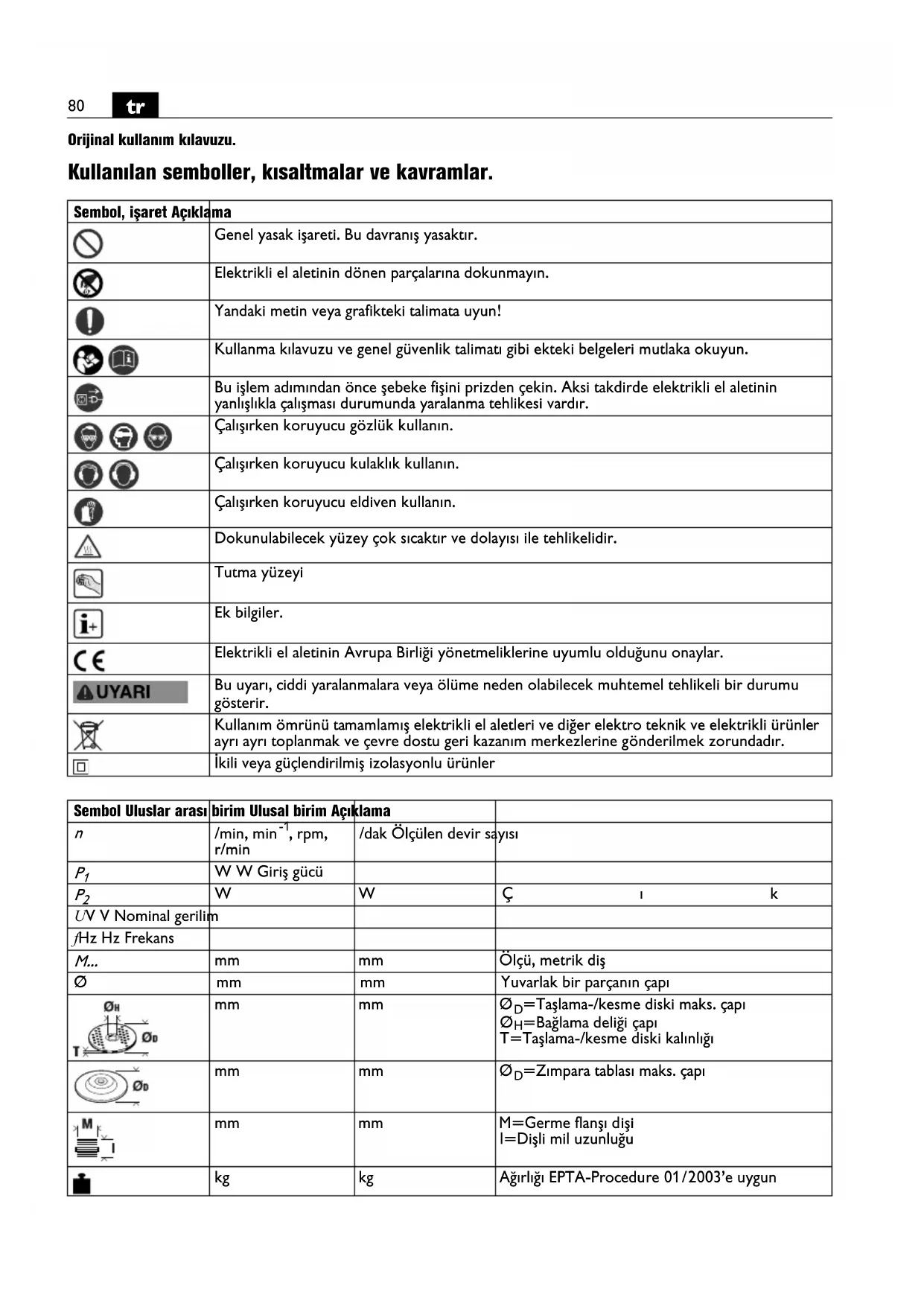 Orijinal kullanım kılavuzu. Kullanılan semboller, kısaltmalar ve kavramlar. Sembol, işaret Açıklama Genel yasak işareti. Bu davranış yasaktır. Elektrikli el aletinin dönen parçalarına dokunmayın. Yandaki metin veya grafikteki talimata uyun! Kullanma kılavuzu ve genel güvenlik talimatı gibi ekteki belgeleri mutlaka okuyun. Bu işlem adımından önce şebeke fişini prizden çekin. Aksi takdirde elektrikli el aletinin yanlışlıkla çalışması durumunda yaralanma tehlikesi vardır. Çalışırken koruyucu gözlük kullanın. Çalışırken koruyucu kulaklık kullanın. Çalışırken koruyucu eldiven kullanın. Dokunulabilecek yüzey çok sıcaktır ve dolayısı ile tehlikelidir. Tutma yüzeyi Ek bilgiler. Elektrikli el aletinin Avrupa Birliği yönetmeliklerine uyumlu olduğunu onaylar. Bu uyarı, ciddi yaralanmalara veya ölüme neden olabilecek muhtemel tehlikeli bir durumu gösterir. Kullanım ömrünü tamamlamış elektrikli el aletleri ve diğer elektro teknik ve elektrikli ürünler ayrı ayrı toplanmak ve çevre dostu geri kazanım merkezlerine gönderilmek zorundadır. İkili veya güçlendirilmiş izolasyonlu ürünler Sembol Uluslar arası birim Ulusal birim Açıklama