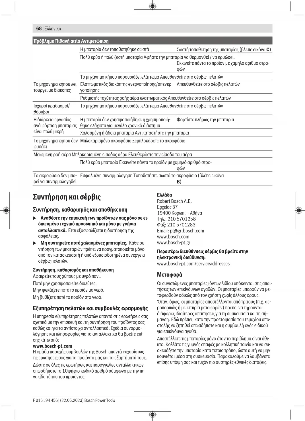 Τα μηχανήματα κήπου, οι μπαταρίες, τα εξαρτή- ματα και οι συσκευασίες πρέπει να ανακυκλώνο- νται με τρόπο φιλικό προς το περιβάλλον. Μη ρίχνετε τα ηλιακά φωτιστικά και τις μπαταρίες στα οικιακά απορρίμματα! Μόνο για χώρες τηςΕΕ: Σύμφωνα με την Ευρωπαϊκή Οδηγία 2012/19/EE, τα άχρηστα ηλεκτρικά εργαλεία, καθώς και σύμφωνα με την Κοινοτική Οδηγία 2006/66/EΚ, οι χαλασμένες ή αναλωμένες μπαταρίες πρέπει να συλλέγονται ξεχωριστά για να ανακυκλωθούν με τρόπο φιλικό προς το περιβάλλον. Σε περίπτωση μη ενδεδειγμένης απόσυρσης οι ηλεκτρικές και ηλεκτρονικές συσκευές λόγω ενδεχομένης παρουσίας επικίν- δυνων ουσιών μπορούν να έχουν επιβλαβείς επιπτώσεις στο περιβάλλον και στην ανθρώπινη υγεία. Μπαταρίες/Επαναφορτιζόμενες μπαταρίες: Li-Ion: Προσέξτε παρακαλώ τις υποδείξεις στην ενότητα Μεταφορά (βλέπε «Μεταφορά», Σελίδα68). Türkçe Güvenlik Talimatı Bahçe aleti üzerindeki sembollerin açıklaması Genel tehlike uyarısı. Kullanım kılavuzunu tam olarak okuyun. Yağmur altında kullanmayın. UYARI: Savrulan parçalara karşı dikkatli olun UYARI: Yakınınızda bulunanları uzaklaştırın. Ürün çalışırken ellerinizi, ayaklarınızı veya geniş giysilerinizi deliklere yaklaştırmayın. Dönen fan. Ürün çalışırken ellerinizi, ayaklarınızı, uzun saçlarınızı veya geniş giysilerinizi deliklere yaklaştırmayın. Koruyucu gözlük ve kulaklık kullanın. UYARI: Bakım işlemlerine başlamadan önce aküyü aletten çıkarın. Elektrikli el aletleri için genel güvenlik talimatı UYARI Bu elektrikli el aletiyle birlikte gelen tüm güvenlik uyarılarını, talimatları, resim ve açıklamaları okuyun. Aşağıda bulunan talimatlara uyulmaması halinde elektrik çarpmalarına, yangınlara ve/veya ağır yaralanmalara neden olabilir. Bütün uyarıları ve talimat hükümlerini ileride kullanmak üzere saklayın. Uyarı ve talimat hükümlerinde kullanılan "elektrikli el aleti" terimi, akım şebekesine bağlı (elektrikli) aletlerle akü ile çalışan aletleri (akülü) kapsamaktadır. Çalışma yeri güvenliği u Çalıştığınız yeri temiz tutun ve iyi aydınlatın. Dağınık veya karanlık alanlar kazalara davetiye çıkarır. u Elektrikli el aleti ile çalışırken çocukları ve etraftaki kişileri uzakta tutun. Dikkatiniz dağılacak olursa aletin kontrolünü kaybedebilirsiniz. u Aletle çalışırken 3 metrelik bir daire içinde başkaları ve evcil hayvanlar bulunmamalıdır. Kirler hiçbir zaman yakındaki kişilere doğru püskürtülmemelidir. u Ürünle çalışırken duyulamayan tehlikelere karşı dikkatli olun. u Aleti yere bıraktığınızda ona takılarak tökezlememek için dikkatli olun. u Bu aleti kullananlar başkalarının başına gelebilecek kazalardan veya bunların özel mülkiyetinde bulunan mallarda meydana gelebilecek hasarlardan sorumludur. Elektrik güvenliği u Borular, kalorifer petekleri, ısıtıcılar ve buzdolapları gibi topraklanmış yüzeylerle vücudunuzun temas etmesinden kaçının. Vücudunuz topraklandığı anda büyük bir elektrik çarpma tehlikesi ortaya çıkar. u Elektrikli el aletini yağmura ve neme karşı koruyun. Suyun elektrikli el aleti içine sızması elektrik çarpma tehlikesini artırır. u Özellikle fırtınalı havalar olmak üzere elverişsiz hava koşullarında çalışmaktan kaçının. Kişilerin Güvenliği u Dikkatli olun, ne yaptığınıza dikkat edin, elektrikli el aleti ile işinizi makul bir tempo ve yöntemle yürütün. Yorgunsanız, kullandığınız hapların, ilaçların veya Bosch Power Tools F 016 L94 456 | (22.05.2023)70 | Türkçe alkolün etkisinde iseniz elektrikli el aletini kullanmayın. Elektrikli el aletini kullanırken bir anki dikkatsizlik önemli yaralanmalara neden olabilir. u Daima kişisel koruyucu donanım kullanın. Daima koruyucu gözlük kullanın. Elektrikli el aletinin türü ve kullanımına uygun olarak; toz maskesi, kaymayan iş ayakkabıları, koruyucu kask veya koruyucu kulaklık gibi koruyucu donanım kullanımı yaralanma tehlikesini azaltır. u Uygun iş elbiseleri giyin. Geniş giysiler giymeyin ve takı takmayın. Saçlarınızı ve giysileriniz aletin hareketli parçalarından uzak tutun. Bol giysiler, uzun saçlar veya takılar aletin hareketli parçaları tarafından tutulabilir. u Çalışırken vücudunuz anormal durumda olmasın. Çalışırken duruşunuz güvenli olsun ve dengenizi her zaman koruyun. Bu sayede elektrikli el aletini beklenmedik durumlarda daha iyi kontrol edebilirsiniz. u Ürünle birlikte koşmayın. u Ürünü daima bel yüksekliğinde kullanın. u Aletleri sık kullanmanız sebebiyle onlara alışmış olmanız, güvenlik prensiplerine uymanızı önlememelidir. Dikkatsiz bir hareket, bir anda ciddi yaralanmalara yol açabilir. Elektrikli el aletlerinin kullanımı ve bakımı u Ürünü sadece meme takılı durumda çalıştırın. u Bütün soğutma havası deliklerini temiz tutun. u Özellikle soğuk havalarda ürünü düşük devir sayısı ile başlatın. Düşük sıcaklıklarda yüksek devir sayısı seçildiği takdirde, ürünün seçilenden daha düşük devir sayısı ile başlaması ve sonra yavaşça seçilen devir sayısına ulaşması mümkündür. u Bahçe aleti kapandıktan sonra da birkaç saniye serbest dönüşte hareket eder (hava akımının sürmesi nedeni