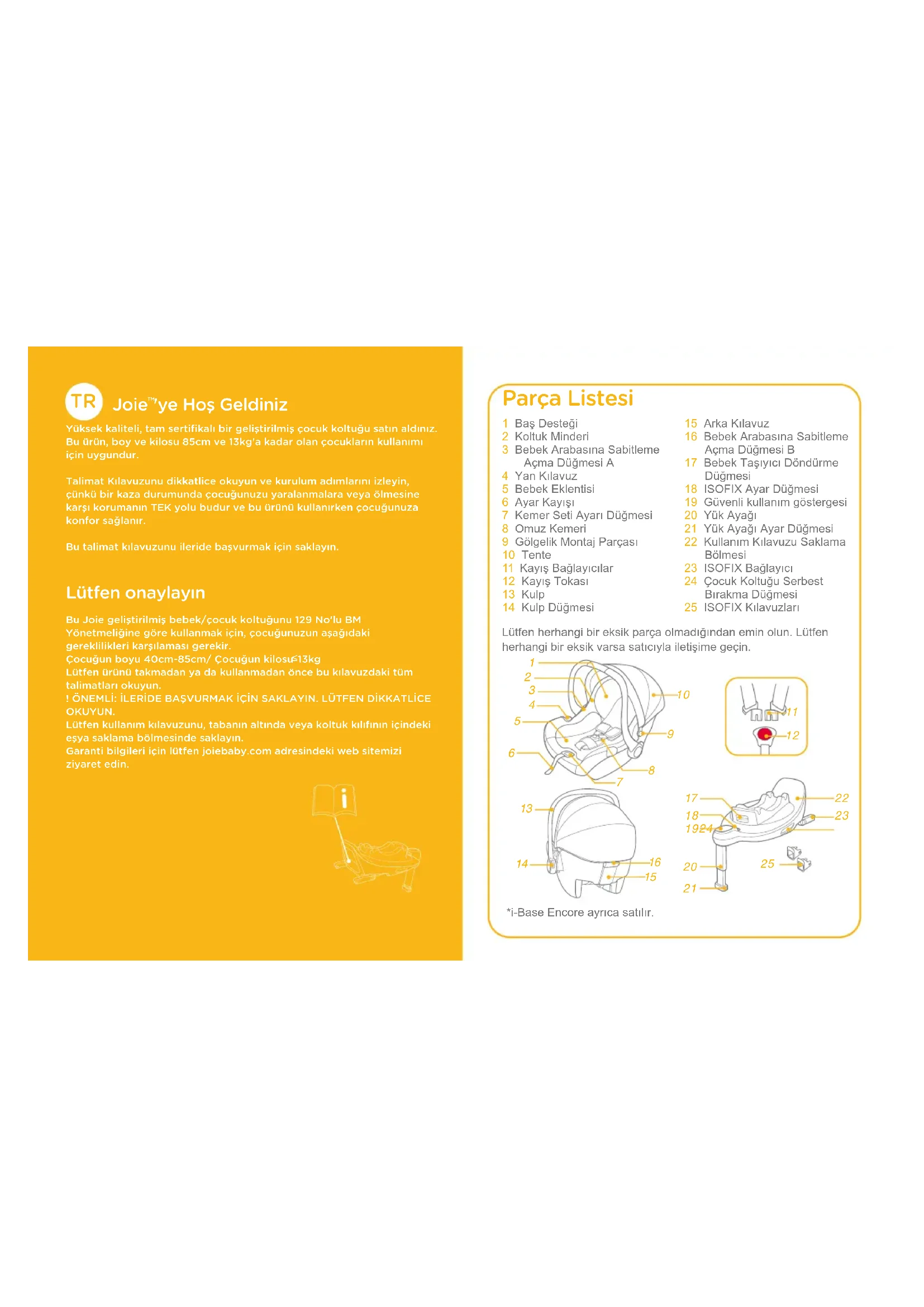 'ye Hoş Geldiniz Yüksek kaliteli﹐ tam sertifikalı bir geliştirilmiş çocuk koltuğu satın aldınız. Bu ürün﹐ boy ve kilosu 85cm ve 13kg'a kadar olan çocukların kullanımı için uygundur.Talimat Kılavuzunu dikkatlice okuyun ve kurulum adımlarını izleyin﹐ çünkü bir kaza durumunda çocuğunuzu yaralanmalara veya ölmesine karşı korumanın TEK yolu budur ve bu ürünü kullanırken çocuğunuza konfor sağlanır.Bu talimat kılavuzunu ileride başvurmak için saklayın. Lütfen onaylayın Bu Joie geliştirilmiş bebek/çocuk koltuğunu 129 No'lu BM Yönetmeliğine göre kullanmak için﹐ çocuğunuzun aşağıdaki gereklilikleri karşılaması gerekir.Çocuğun boyu 40cm-85cm/ Çocuğun kilosu