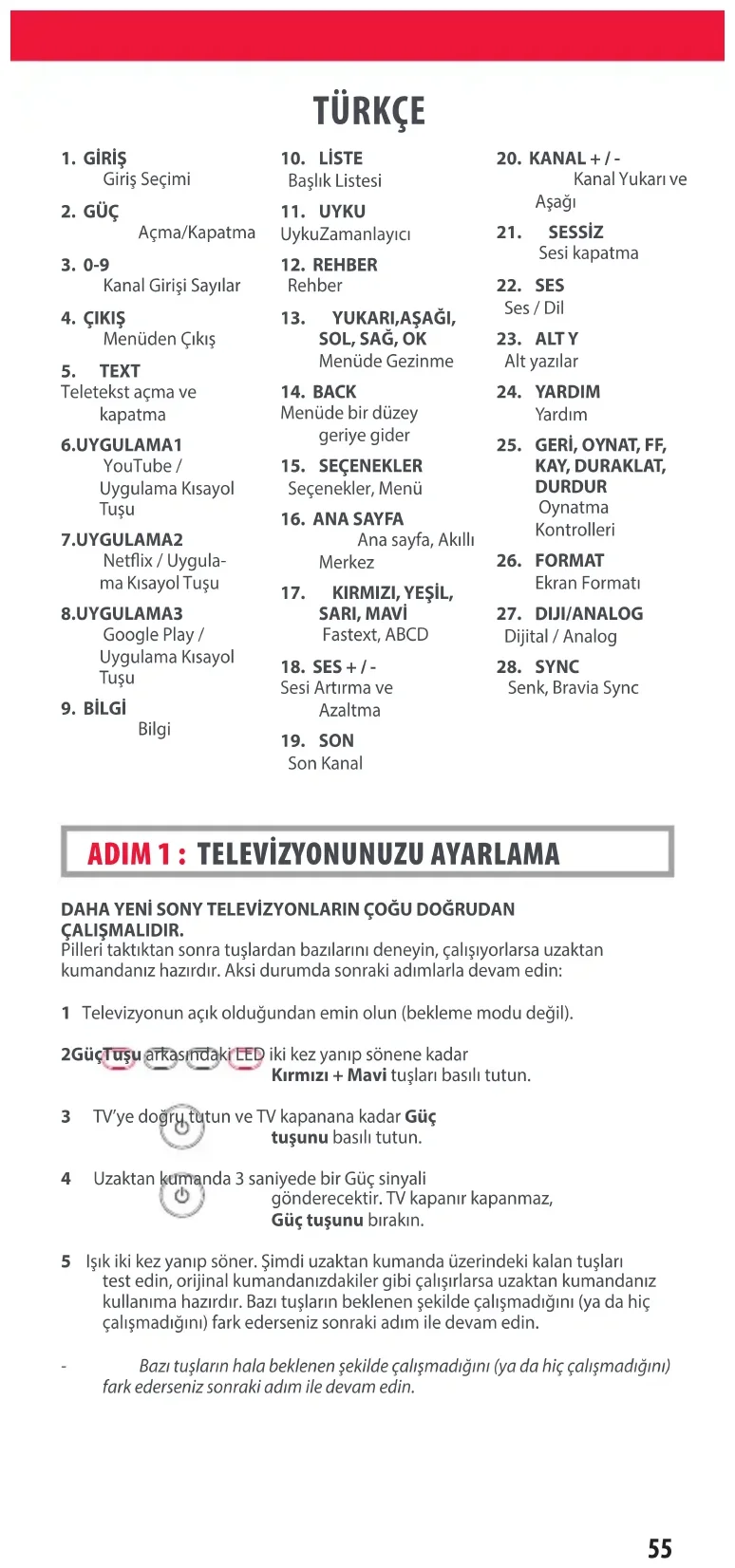 DAHA YENİ SONY TELEVİZYONLARIN ÇOĞU DOĞRUDAN ÇALIŞMALIDIR. Pller taktıktan sonra tulardan bazılarını deneyn, çalııyorlarsa uzaktan kumandanız hazırdır. Aks durumda sonrak adımlarla devam edn: 1 Televzyonun açık olduğundan emn olun (bekleme modu değl). 2 Güç Tuşu arkasındak LED k kez yanıp sönene kadar Kırmızı + Mavi tuları basılı tutun. 3 TV’ye doğru tutun ve TV kapanana kadar Güç tuşunu basılı tutun. 4 Uzaktan kumanda 3 sanyede br Güç snyal gönderecektr. TV kapanır kapanmaz, Güç tuşunu bırakın. 5 Iık k kez yanıp söner. md uzaktan kumanda üzerndek kalan tuları test edn, orjnal kumandanızdakler gb çalıırlarsa uzaktan kumandanız kullanıma hazırdır. Bazı tuların beklenen eklde çalımadığını (ya da hç çalımadığını) fark edersenz sonrak adım le devam edn. - Bazı tuşların hala beklenen şekilde çalışmadığını (ya da hiç çalışmadığını) fark ederseniz sonraki adım ile devam edin.