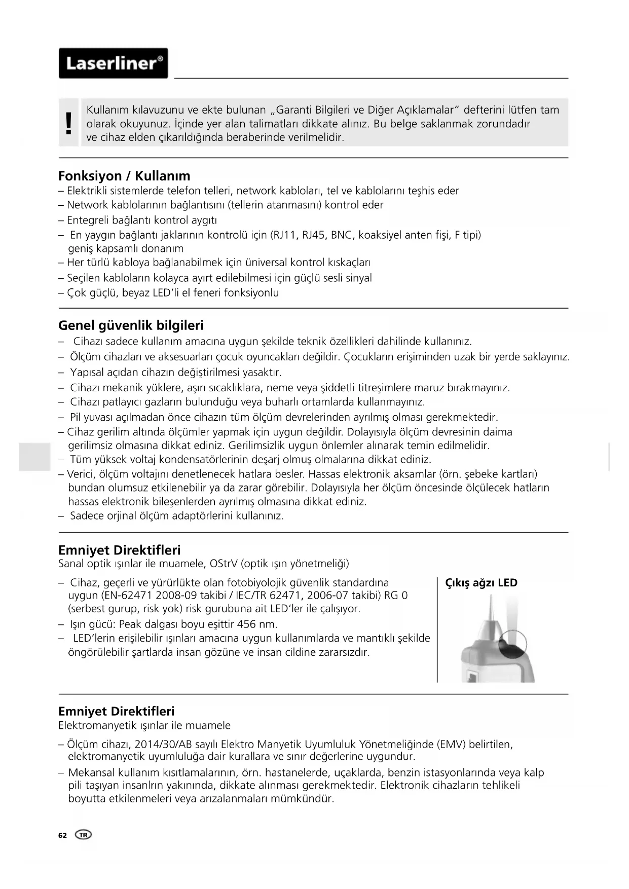 Fonksiyon / Kullanım – Elektrikli sistemlerde telefon telleri, network kabloları, tel ve kablolarını teşhis eder – Network kablolarının bağlantısını (tellerin atanmasını) kontrol eder – Entegreli bağlantı kontrol aygıtı – En yaygın bağlantı jaklarının kontrolü için (RJ11, RJ45, BNC, koaksiyel anten şi, F tipi) geniş kapsamlı donanım – Her türlü kabloya bağlanabilmek için üniversal kontrol kıskaçları – Seçilen kabloların kolayca ayırt edilebilmesi için güçlü sesli sinyal – Çok güçlü, beyaz LED‘li el feneri fonksiyonlu Genel güvenlik bilgileri – Cihazı sadece kullanım amacına uygun şekilde teknik özellikleri dahilinde kullanınız. – Ölçüm cihazları ve aksesuarları çocuk oyuncakları değildir. Çocukların erişiminden uzak bir yerde saklayınız. – Yapısal açıdan cihazın değiştirilmesi yasaktır. – Cihazı mekanik yüklere, aşırı sıcaklıklara, neme veya şiddetli titreşimlere maruz bırakmayınız. – Cihazı patlayıcı gazların bulunduğu veya buharlı ortamlarda kullanmayınız. – Pil yuvası açılmadan önce cihazın tüm ölçüm devrelerinden ayrılmış olması gerekmektedir. – Cihaz gerilim altında ölçümler yapmak için uygun değildir. Dolayısıyla ölçüm devresinin daima gerilimsiz olmasına dikkat ediniz. Gerilimsizlik uygun önlemler alınarak temin edilmelidir. – Tüm yüksek voltaj kondensatörlerinin deşarj olmuş olmalarına dikkat ediniz. – Verici, ölçüm voltajını denetlenecek hatlara besler. Hassas elektronik aksamlar (örn. şebeke kartları) bundan olumsuz etkilenebilir ya da zarar görebilir. Dolayısıyla her ölçüm öncesinde ölçülecek hatların hassas elektronik bileşenlerden ayrılmış olmasına dikkat ediniz. – Sadece orjinal ölçüm adaptörlerini kullanınız. Emniyet Direktieri Sanal optik ışınlar ile muamele, OStrV (optik ışın yönetmeliği) Emniyet Direktifleri Elektromanyetik ışınlar ile muamele – Cihaz, geçerli ve yürürlükte olan fotobiyolojik güvenlik standardına uygun (EN-62471 2008-09 takibi / IEC/TR 62471, 2006-07 takibi) RG 0 (serbest gurup, risk yok) risk gurubuna ait LED‘ler ile çalışıyor. – Işın gücü: Peak dalgası boyu eşittir 456 nm. – LED‘lerin erişilebilir ışınları amacına uygun kullanımlarda ve mantıklı şekilde öngörülebilir şartlarda insan gözüne ve insan cildine zararsızdır. – Ölçüm cihazı, 2014/30/AB sayılı Elektro Manyetik Uyumluluk Yönetmeliğinde (EMV) belirtilen, elektromanyetik uyumluluğa dair kurallara ve sınır değerlerine uygundur.