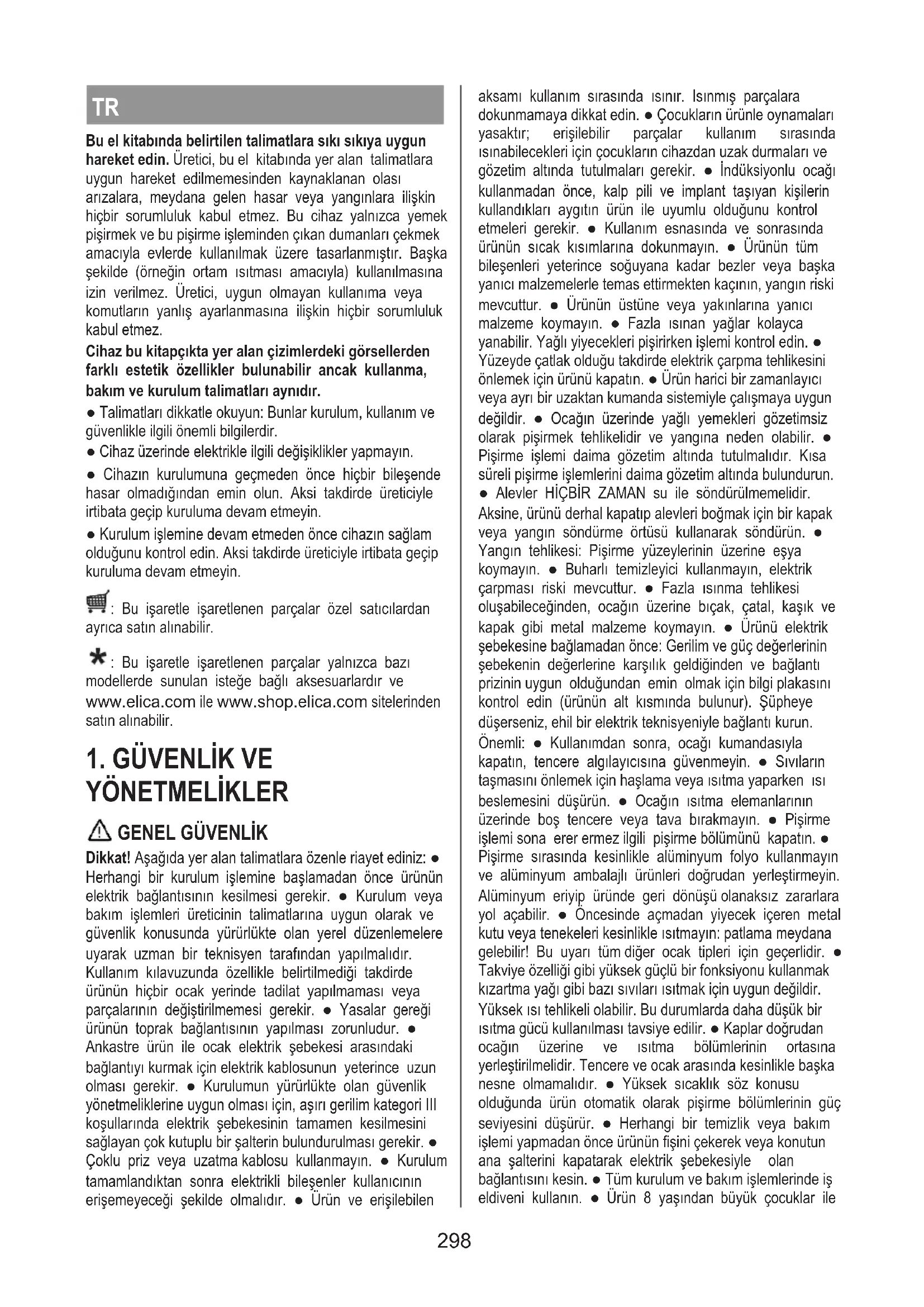 Prije nego što kontaktirate Službu za korisnike 1.Provjerite je li moguće samostalno riješiti problem na temelju točaka opisanih u "Pretraživanje kvarova". 2.Ugasite i ponovno upalite uređaj da provjerite da li problem i dalje postoji. Ako i nakon gore navedenih provjera problem i dalje postoji, obratite se najbližoj Službi za korisnike. 297TR Bu el kitabında belirtilen talimatlara sıkı sıkıya uygun hareket edin. Üretici, bu el kitabında yer alan talimatlara uygun hareket edilmemesinden kaynaklanan olası arızalara, meydana gelen hasar veya yangınlara ilişkin hiçbir sorumluluk kabul etmez. Bu cihaz yalnızca yemek pişirmek ve bu pişirme işleminden çıkan dumanları çekmek amacıyla evlerde kullanılmak üzere tasarlanmıştır. Başka şekilde (örneğin ortam ısıtması amacıyla) kullanılmasına izin verilmez. Üretici, uygun olmayan kullanıma veya komutların yanlış ayarlanmasına ilişkin hiçbir sorumluluk kabul etmez. Cihaz bu kitapçıkta yer alan çizimlerdeki görsellerden farklı estetik özellikler bulunabilir ancak kullanma, bakım ve kurulum talimatları aynıdır. ● Talimatları dikkatle okuyun: Bunlar kurulum, kullanım ve güvenlikle ilgili önemli bilgilerdir. ● Cihaz üzerinde elektrikle ilgili değişiklikler yapmayın. ● Cihazın kurulumuna geçmeden önce hiçbir bileşende hasar olmadığından emin olun. Aksi takdirde üreticiyle irtibata geçip kuruluma devam etmeyin. ● Kurulum işlemine devam etmeden önce cihazın sağlam olduğunu kontrol edin. Aksi takdirde üreticiyle irtibata geçip kuruluma devam etmeyin. : Bu işaretle işaretlenen parçalar özel satıcılardan ayrıca satın alınabilir. : Bu işaretle işaretlenen parçalar yalnızca bazı modellerde sunulan isteğe bağlı aksesuarlardır ve www.elica.com ile www.shop.elica.com sitelerinden satın alınabilir.