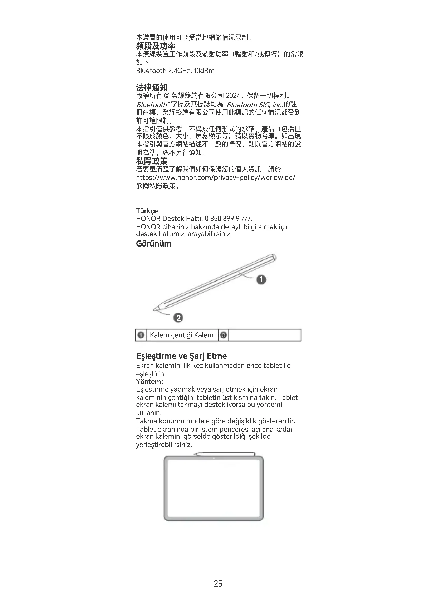 Bu cihaz AB’nin tüm üye ülkelerinde kullanılabilir. Cihazın kullanıldığı ülkenin mevzuatını ve mahalli mevzuatı dikkate alın. Bu cihazın kullanımı yerel şebekeye bağlı olarak kısıtlanabilir. Frekans Bantları ve Güç Bu telsiz ekipman için geçerli frekans bantları ve iletilen (ışıma ve/veya temas yoluyla) nominal güç limitleri aşağıdaki gibidir: Bluetooth 2.4GHz: 10dBm Teknik Özellikler Boyutlar: 165 mm x 9 mm, ~17.4 gr (değerler yaklaşıktır) Bu cihaz Türkiye Altyapısına uygundur. Bakanlıkça tespit ve ilan edilen kullanım ömrü: 5 yıl. Bu cihaz Türkçe karakterlerin tamamını ihtiva eden ETSI TS 123.038 V8.0.0 (veya sonraki sürümün kodu) ve ETSI TS 123.040 V8.1.0 (veya sonraki sürümün kodu) teknik özelliklerine uygundur. Cihazınıza, yasal tanımlama amacı doğrultusunda HONOR Magic-Pencil3 (AD54s) ismi atanmıştır. TÜKETİCİNİN SEÇİMLİK HAKLARI 1-Malın ayıplı olduğunun anlaşılması durumunda tüketici; a) Satılanı geri vermeye hazır olduğunu bildirerek sözleşmeden dönme, b) Satılanı alıkoyup ayıp oranında satış bedelinden indirim isteme, c) Aşırı bir masraf gerektirmediği takdirde, bütün masraarı satıcıya ait olmak üzere satılanın ücretsiz onarılmasını isteme, ç) İmkân varsa, satılanın ayıpsız bir misli ile değiştirilmesini isteme, seçimlik haklarından birini kullanabilir. Satıcı, tüketicinin tercih ettiği bu talebi yerine getirmekle yükümlüdür. 2-Ücretsiz onarım veya malın ayıpsız misli ile değiştirilmesi hakları üretici veya ithalatçıya karşı da kullanılabilir. Bu fıkradaki hakların yerine getirilmesi konusunda satıcı, üretici ve ithalatçı müteselsilen sorumludur. Üretici veya ithalatçı, malın kendisi tarafından piyasaya sürülmesinden sonra ayıbın doğduğunu ispat ettiği takdirde sorumlu tutulmaz. 3-Ücretsiz onarım veya malın ayıpsız misli ile değiştirilmesinin satıcı için orantısız güçlükleri beraberinde getirecek olması hâlinde tüketici, sözleşmeden dönme veya ayıp oranında bedelden indirim haklarından birini kullanabilir. Orantısızlığın tayininde malın ayıpsız değeri, ayıbın önemi ve diğer seçimlik haklara başvurmanın tüketici açısından sorun teşkil edip etmeyeceği gibi hususlar dikkate alınır. 284-Ücretsiz onarım veya malın ayıpsız misli ile değiştirilmesi haklarından birinin seçilmesi durumunda bu talebin satıcıya, üreticiye veya ithalatçıya yöneltilmesinden itibaren azami otuz iş günü, konut ve tatil amaçlı taşınmazlarda ise altmış iş günü içinde yerine getirilmesi zorunludur. Ancak, bu Kanunun 58 inci maddesi uyarınca çıkarılan yönetmelik eki listede yer alan mallara ilişkin, tüketicinin ücretsiz onarım talebi, yönetmelikte belirlenen azami tamir süresi içinde yerine getirilir. Aksi hâlde tüketici diğer seçimlik haklarını kullanmakta serbesttir. 5-Tüketicinin sözleşmeden dönme veya ayıp oranında bedelden indirim hakkını seçtiği durumlarda, ödemiş olduğu bedelin tümü veya bedelden yapılan indirim tutarı derhâl tüketiciye iade edilir. 6-Seçimlik hakların kullanılması nedeniyle oaya çıkan tüm masraar, tüketicinin seçtiği hakkı yerine getiren tarafça karşılanır. Tüketici bu seçimlik haklarından biri ile birlikte 11/1/2011 tarihli ve 6098 sayılı Türk Borçlar Kanunu hükümleri uyarınca tazminat da talep edebilir. Garanti koşulları ve şaları ile gizlilik politikası için aşağıdaki adresleri ziyaret edebilirsiniz. https://www.honor.com/tr/suppo/ https://www.honor.com/tr/privacy-policy/ Yetkili Seisler: KVK Teknik Seis Bakırköy Adres: Kaaltepe Mah. İncirli Cad. İhsan Kalmaz SokakNo: 3/1-2 Bakırköy / İstanbul Web: https://www.kvkteknikseis.com/ Yuiçi Kargo Gönderi Kodu: 341139940 KVK Teknik Seis Çağrı Merkezi: 0 850 222 1 585 KVK Teknik Seis Ankara Adres: Kızılay Mah. Fevzi Çakmak 1 Sokak, Oran Apt. No: 15/B Çankaya / Ankara Web: https://www.kvkteknikseis.com/ Yuiçi Kargo Gönderi Kodu: 9002731 KVK Teknik Seis Çağrı Merkezi: 0 850 222 1 585 KVK Teknik Seis Adana Adres: Reşatbey Mah. Turhan Cemal Beriker Bulvarı Günep Panorama B Blok No: 8 Seyhan / Adana Web: https://www.kvkteknikseis.com/ Yuiçi Kargo Gönderi Kodu: 341140273 KVK Teknik Seis Çağrı Merkezi: 0 850 222 1 585 KVK Teknik Seis Antalya Adres: Etiler Mah. Adnan Menderes Bulvarı No:67-B - 07040Muratpaşa / Antalya Web: https://www.kvkteknikseis.com/ Yuiçi Kargo Gönderi Kodu: 311524639 KVK Teknik Seis Çağrı Merkezi: 0 850 222 1 585 KVK Teknik Seis İzmir Adres: İsmet Kaptan Mah. 1365 Sok. No: 7B Çankaya Konak / İzmir Web: https://www.kvkteknikseis.com/ Yuiçi Kargo Gönderi Kodu: 341141000 KVK Teknik Seis Çağrı Merkezi: 0 850 222 1 585 KVK Teknik Seis Trabzon Adres: Cumhuriyet Mahallesi Nemlioğlu Cemal Sokak Ziya Bey Sitesi A Blok No: 16/1 - 61050 Trabzon Web: https://www.kvkteknikseis.com/ Yuiçi Kargo Gönderi Kodu: 225923276 KVK Teknik Seis Çağrı Merkezi: 0 850 222 1 585 29KVK Teknik Seis Kaal Adres: Soğanlık Yeni Mah. D-100 Kuzey Yanyol Cad. Kanat Sanayi Sitesi No: 32 (Titanic Otel Yanı) Kaal / İST Web: https://www.kvkteknikseis.com/ Yuiçi Kargo Gönderi Kodu: 261734527 KVK Teknik Seis Çağrı Merkezi: 0 850 222 1 585 Üretici Firma Bilgileri: Honor Device Co., Ltd. Suite 3401, Unit A, Building 6, Shum Yip Sky Park, No. 8089, Hongli West Road, Xiangmihu Street, Futian District, Shenzhen, Guangdong 518040, People's Republic of China Tel: +86-755-61886688 Web: www.honor.com Çin'de üretilmiştir Uyumluluk Bildirisi: Honor Device Co., Ltd. bu cihazın 2014/53/EU yönergesinin temel gereksinimleri ve ilgili hükümleri ile uyumlu olduğunu beyan eder. Uyumluluk Beyanı'nı (Decleration of Comformity) görüntülemek için https://www.honor.com/global/legal/ceication/ İthalatçı Firma Bilgileri: Honor Turkey Teknoloji Limited Şirketi Maslak Mah. Bilim Sk. Sun Plaza Blok No: 5a İç Kap
