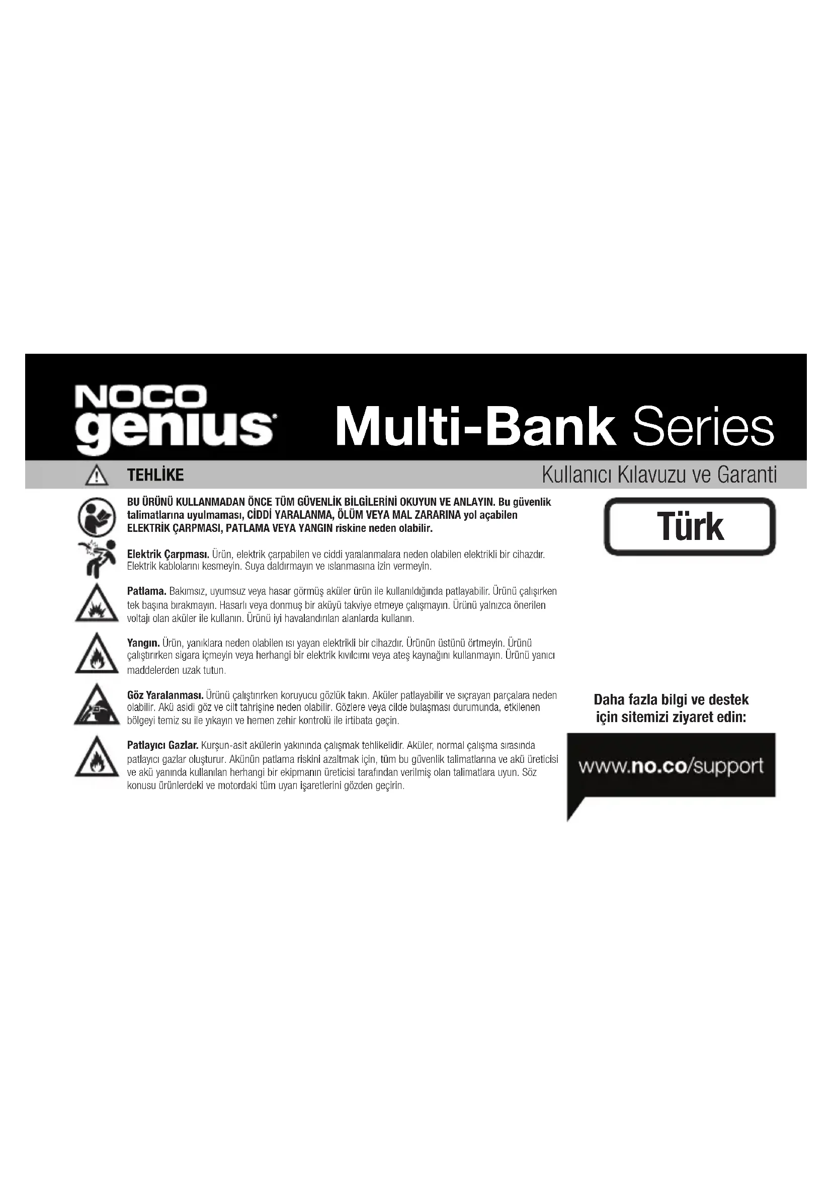 TRYARALANMAYI ICEREN FAKAT BUNUNLA SINIRLI OLMAYAN HERHANGI BIR OZEL, DOLAYLI, VEYA MISAL OLACAK ZARARLARLARDAN DOLAYI NOCO HERHANGI BIR URUN ALICISINA VEYA HERHANGI BIR UCUNCU TARAFA KARSI SORUMLU DEGILDIR. BURADA BELIRTILEN GARANTILER, SATILABILIRLIK VE BELIRLI BIR AMACA UYGUNLUK ILE ILGILI ZIMNI GARANTILER VE SINIRLAMA OLMAMAK UZERE ACIK, ZIMNI, KANUNI TARAFINDAN KAYNAKLANAN TUM DIGER GARANTILERDEN DEGILDIR VE BORSA, KULLANIM VEYA TICARI UYGULAMA DUZEYINDEN KAYNAKLANAN GARANTILER. YÜRÜRLÜKTEKİ YASALARIN KAPSAM DIŞINDAKİ VEYA HARİÇ TUTULAMAYACAK GARANTİLER, KOŞULLAR VE YÜKÜMLÜLÜKLERİ KAPSAM DIŞINDA, BU PARAGRAP, BÖYLE YASALARIN İZİN VERDİĞİ EN BÜYÜK ÖLÇÜDE UYGULANACAKTIR. Bu Garanti, sadece NOCO’dan veya NOCO onaylı bir satıcı veya dağıtıcıdan Ürünü satın alan orijinal müşterinin yararı için hazırlanmıştır ve devredilemez veya transfer edilemez. Bir garanti iddiası öne sürmek için, müşteri: (1) support@no.co adresine e-posta göndererek ya da 1.800.456.6626 nolu telefonu arayarak geri iade ürün yetkisi (“RMA”) numarası ve geri iade konum bilgisi (“Geri İade Konumu”) istemeli ve edinmelidir; ve (2) RMA numarası dahil Ürünü ve faturasını Geri İade Konumuna göndermelidir. NOCO DESTEK’TEN BİR RMA NUMARASI ALMADAN ÖNCE ÜRÜNÜ TEK BAŞINA GÖNDERMEYİN. İlk alici, garanti hizmetleri için tüm ambalaj ve taşima maliyetlerini sorumluyor (ve peşin odemeli). YUKARIDAKİNE RAĞMEN, BU SORUNSUZ GARANTİ ŞU ÜRÜNLER İÇİN GEÇERSİZDİR VE KULLANILAMAZ: (a) yanlış kullanılmış, kötü kullanılmış, kötü veya dikkatsiz kullanıma, kazaya, yanlış şekilde depolamaya maruz kalmış veya NOCO’nun güvenli ve etkili kullanım için verdiği önerilerin dışında aşırı voltaj, sıcaklık, şok veya titreşim altında çalıştırılmış; (b) yanlış şekilde kurulmuş, çalıştırılmış veya bakımı yapılmış; (c) NOCO’nun yazılı izni olmadan değiştirilmiş; (d) parçalara ayrıştırılmış, üzerinde oynanmış veya NOCO dışında biri tarafından tamir edilmiş; (e) Garanti Süresi sonrasında bildirilen kusurları içeren ürünler. BU SORUNSUZ GARANTİ ŞUNLARI KAPSAMAMAKTADIR: (1) normal yıpranma ve aşınma; (2) işlevi etkilemeyen görsel hasarlar; veya (3) NOCO seri numarası kayıp, değiştirilmiş veya bozulmuş ürünler.
