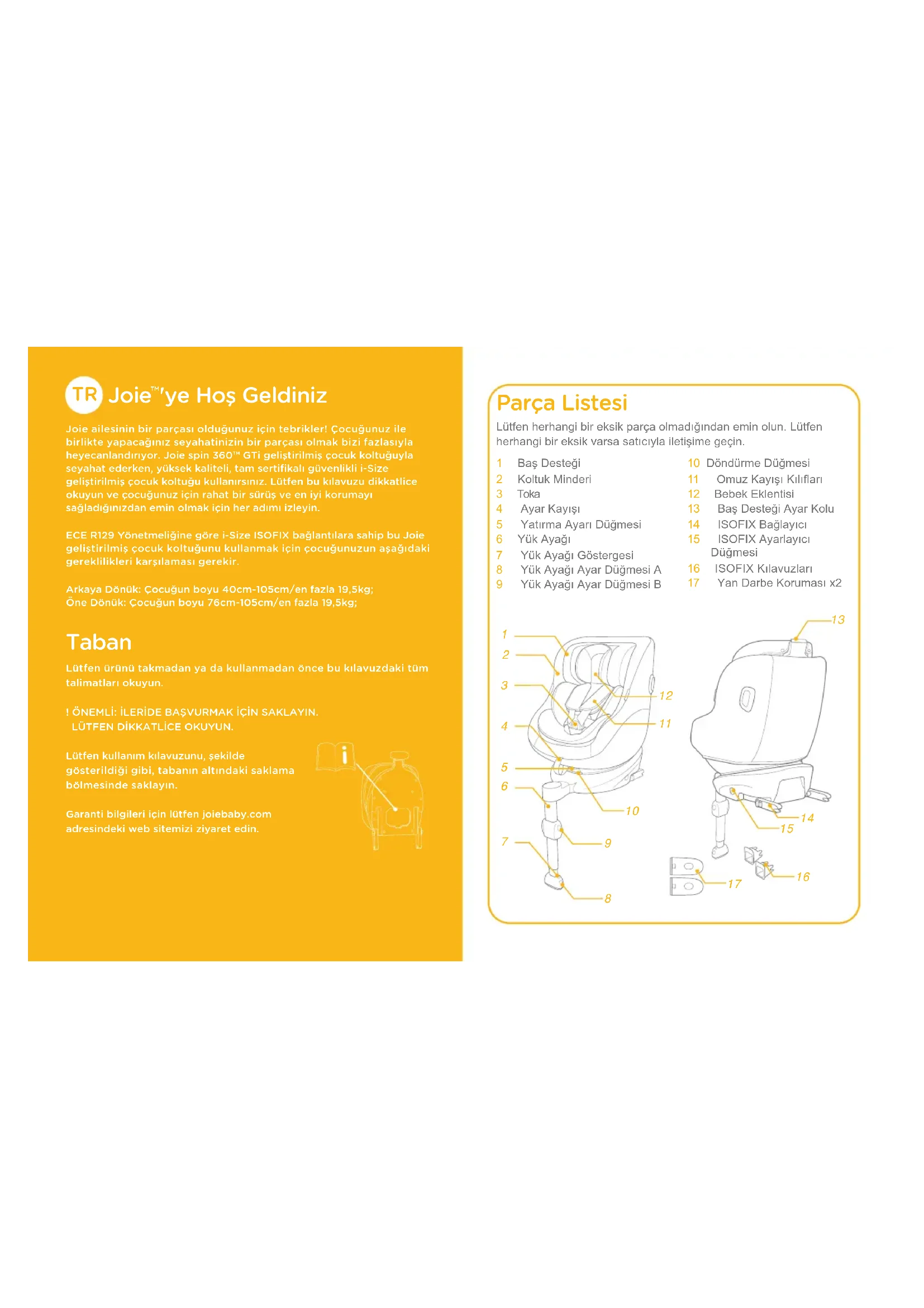 'ye Hoş Geldiniz Joie ailesinin bir parçası olduğunuz için tebrikler! Çocuğunuz ile birlikte yapacağınız seyahatinizin bir parçası olmak bizi fazlasıyla heyecanlandırıyor. Joie spin 360™ GTi geliştirilmiş çocuk koltuğuyla seyahat ederken, yüksek kaliteli, tam sertifikalı güvenlikli i-Size geliştirilmiş çocuk koltuğu kullanırsınız. Lütfen bu kılavuzu dikkatlice okuyun ve çocuğunuz için rahat bir sürüş ve en iyi korumayı sağladığınızdan emin olmak için her adımı izleyin.ECE R129 Yönetmeliğine göre i-Size ISOFIX bağlantılara sahip bu Joie geliştirilmiş çocuk koltuğunu kullanmak için çocuğunuzun aşağıdaki gereklilikleri karşılaması gerekir.Arkaya Dönük: Çocuğun boyu 40cm-105cm/en fazla 19,5kg;Öne Dönük: Çocuğun boyu 76cm-105cm/en fazla 19,5kg; Taban Lütfen ürünü takmadan ya da kullanmadan önce bu kılavuzdaki tüm talimatları okuyun.! ÖNEMLİ: İLERİDE BAŞVURMAK İÇİN SAKLAYIN.LÜTFEN DİKKATLİCE OKUYUN.Lütfen kullanım kılavuzunu, şekilde gösterildiği gibi, tabanın altındaki saklama bölmesinde saklayın.Garanti bilgileri için lütfen joiebaby.com adresindeki web sitemizi ziyaret edin. Parça Listesi 1 BaşDesteği2 KoltukMinderi3 Toka4 AyarKayışı5 YatırmaAyarıDüğmesi6 YükAyağı7 YükAyağıGöstergesi8 YükAyağıAyarDüğmesiA9 YükAyağıAyarDüğmesiB10 DöndürmeDüğmesi11 OmuzKayışıKılıfları12 BebekEklentisi13 BaşDesteğiAyarKolu14 ISOFIXBağlayıcı15 ISOFIXAyarlayıcıDüğmesi16 ISOFIXKılavuzları17 YanDarbeKorumasıx2Lütfenherhangibireksikparçaolmadığındaneminolun.Lütfenherhangibireksikvarsasatıcıylailetişimegeçin.