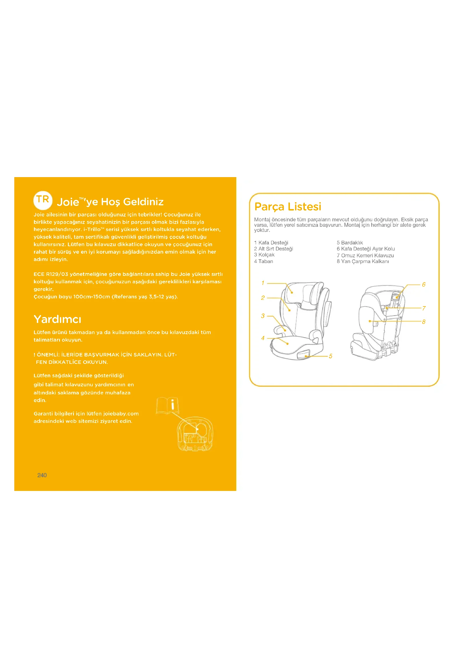 altındaki saklama gözünde muhafaza edin.Garanti bilgileri için lütfen joiebaby.com adresindeki web sitemizi ziyaret edin.5 Bardaklık6 Kafa Desteği Ayar Kolu7 Omuz Kemeri Kılavuzu8 Yan Çarpma Kalkanı Parça Listesi Montaj öncesinde tüm parçaların mevcut olduğunu doğrulayın. Eksik parça varsa, lütfen yerel satıcınıza başvurun. Montaj için herhangi bir alete gerek yoktur.1 Kafa Desteği2 Alt Sırt Desteği3 Kolçak4 Taban241 242 UYARI ! Hiçbir yardımcı kaza hâlinde tam koruma garanti edemez. Ancak bu yardımcının doğru kullanılması, çocuğunuzun ciddi yaralanma veya ölüm riskini azaltacaktır. ! Kurulum talimatlarını daima doğru bir şekilde takip etmeye özen gösterin; bu, yardımcının optimum güvenlik seviyesinde çalışmasını sağlar. ! Yardımcının sert ve plastik parçalarının, hareketli bir koltuğa veya aracın bir kapısına sıkışmayacak şekilde yerleştirilip monte edilmeleri gerektiğine dikkat edin. ! ECE R129/03 yönetmeliğine göre bağlantılara sahip bu yardımcıyı kullanmak için, çocuğunuzun aşağıdaki gereklilikleri karşılaması gerekir. Çocuğun boyu 100cm-150cm (referans yaş: 3.5-12 yaş). Yalnız öne dönük (araç seyahat yönünde) ! Yardımcı, 135cm-150cm arası kullanım için tüm araçlara sığmayabilir. ! Yardımcıyı araca sabitleyen kayışlar sıkı olmalı ve kemerler bükülmemelidir. ! Yardımcı koltuk, bir kaza durumunda ağır yüklere maruz kalırsa veya düşerse değiştirilmelidir. ! Bu yardımcı, yalnız arabada kullanılmak üzere tasarlanmıştır. UYARI ! Tür onay yetkili kuruluşunun onayı olmadan yardımcı koltukta herhangi bir değişiklik veya ekleme yapmayın. Beyaz EPP/EPS köpüklerin hiç birini ÇIKARMAYIN. Bu, ciddi güvenlik sorunlarına neden olabilir. ! Yüzeyler güneş nedeniyle çok fazla ısınmışsa koltuğu KULLANMAYIN. ! Çocuğu, bir kaç dakika için bile olsa, yardımcı koltukta veya araçta gözetimsiz bırakmayın. ! Çarpışma durumunda yaralanmalara neden olabilecek herhangi bir bavul veya diğer nesneler uygun biçimde sabitlenmelidir. ! Yardımcı, tekstil malzemeler olmadan kullanılmamalıdır. ! Koltuk performansının önemli bir parçasını oluşturduklarından, yardımcının tekstil malzemeleri üretici firmanın önerdiğinin dışındakilerle değiştirilmemelidir. ! Çocuğu, çoğu kazanın meydana geldiği kısa gezilerde bile mutlaka yardımcıya sabitleyin. ! Bu yardımcıyı veya diğer öğeleri aracınızda kemersiz veya sabitlenmemiş bir halde bırakmayın. Düzenli kullanılmadığı zamanlarda yardımcı koltuğu araçtan çıkarın ve kuru, güneşten korunan bir ortamda saklayın.243 244 UYARI ! Geçmişi bilinmeyen ikinci el bir yardımcı koltuk kullanmanız önerilmez. Yanlış kullanım/saklama nedeniyle görünmeyen yapısal hasarlar veya kusurlar içerebilir. ! Yardımcıda işaretlenen ve talimatlarda belirtilenlerin dışında herhangi bir yük karşılama temas noktasını KULLANMAYIN. ! Aşağıdaki koşullarda bu yardımcıyı KURMAYIN: