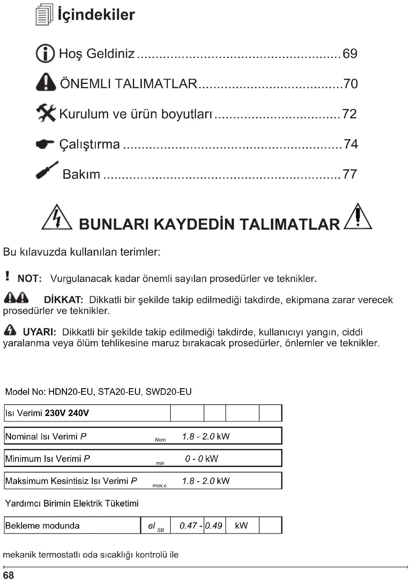 - Bakım Model No: HDN20-EU, STA20-EU, SWD20-EU Isı Verimi 230V 240V Nominal Isı Verimi P Nom p. 77