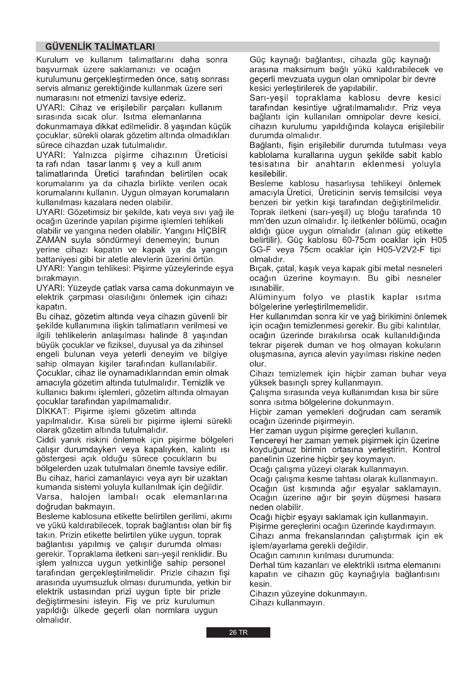 AUX 1kW 1 1 1 1 1 SR 1,75 kW 2 - 1 1 2 R 2,7 kW 1 1 1 2 1 DC 4 kW Mono - - 1 - - DC 4,2 kW Mono - - - - 1 DC 4,5 kW Mono - 1 - 1 - Nomnalne ceplo wejscowe 7,2kW 8,2kW 9,45kW 12,65kW NG 11,4kW LPG 11,2kW G20/20 mbar 686 l/h 781 l/h 900 l/h 1204 l/h 1085 l/h G30/28-30 mbar 524 g/h 596 g/h 688 g/h 920 g/h 814 g/h Klasa nstalacj 3 3 3 3 3 Napece / Czestotlwosc V / Hz 220-240V 50/60Hz 220-240V 50/60Hz 220-240V 50/60Hz 220-240V 50/60Hz 220-240V 50/60Hz Moc elektryczna poberana 1 1 1 1 1 Zaplon elektryczny TAK TAK TAK TAK TAK Wymary produktu 595x505x42 595x505x42 595x505x42 745x505x42 745x505x4226 TR UYARI: Yangın tehlikesi: Pişirme yüzeylerinde eşya bırakmayın. DİKKAT: Pişirme işlemi gözetim altında yapılmalıdır. Kısa süreli bir pişirme işlemi sürekli olarak gözetim altında tutulmalıdır. Besleme kablosuna etikette belirtilen gerilimi, akımı ve yükü kaldırabilecek, toprak bağlantısı olan bir fiş takın. Prizin etikette belirtilen yüke uygun, toprak bağlantısı yapılmış ve çalışır durumda olması gerekir. Topraklama iletkeni sarı-yeşil renklidir. Bu işlem yalnızca uygun yetkinliğe sahip personel tarafından gerçekleştirilmelidir. Prizle cihazın fişi arasında uyumsuzluk olması durumunda, yetkin bir elektrik ustasından prizi uygun tipte bir prizle değiştirmesini isteyin. Fiş ve priz kurulumun yapıldığı ülkede geçerli olan normlara uygun olmalıdır. UYARI: Yalnızca pişirme cihazının Üreticisi ta rafı ndan tasar lanmı ş vey a kull anım talimatlarında Üretici tarafından belirtilen ocak korumalarını ya da cihazla birlikte verilen ocak korumalarını kullanın. Uygun olmayan korumaların kullanılması kazalara neden olabilir. Kurulum ve kullanım talimatlarını daha sonra başvurmak üzere saklamanızı ve ocağın kurulumunu gerçekleştirmeden önce, satış sonrası servis almanız gerektiğinde kullanmak üzere seri numarasını not etmenizi tavsiye ederiz. Bu cihaz, gözetim altında veya cihazın güvenli bir şekilde kullanımına ilişkin talimatların verilmesi ve ilgili tehlikelerin anlaşılması halinde 8 yaşından büyük çocuklar ve fiziksel, duyusal ya da zihinsel engeli bulunan veya yeterli deneyim ve bilgiye sahip olmayan kişiler tarafından kullanılabilir. Çocuklar, cihaz ile oynamadıklarından emin olmak amacıyla gözetim altında tutulmalıdır. Temizlik ve kullanıcı bakımı işlemleri, gözetim altında olmayan çocuklar tarafından yapılmamalıdır. Bu cihaz, harici zamanlayıcı veya ayrı bir uzaktan kumanda sistemi yoluyla kullanılmak için değildir. UYARI: Cihaz ve erişilebilir parçaları kullanım sırasında sıcak olur. Isıtma elemanlarına dokunmamaya dikkat edilmelidir. 8 yaşından küçük çocuklar, sürekli olarak gözetim altında olmadıkları sürece cihazdan uzak tutulmalıdır. UYARI: Gözetimsiz bir şekilde, katı veya sıvı yağ ile ocağın üzerinde yapılan pişirme işlemleri tehlikeli olabilir ve yangına neden olabilir. Yangını HİÇBİR ZAMAN suyla söndürmeyi denemeyin; bunun yerine cihazı kapatın ve kapak ya da yangın battaniyesi gibi bir aletle alevlerin üzerini örtün. UYARI: Yüzeyde çatlak varsa cama dokunmayın ve elektrik çarpması olasılığını önlemek için cihazı kapatın. Ciddi yanık riskini önlemek için pişirme bölgeleri çalışır durumdayken veya kapalıyken, kalıntı ısı göstergesi açık olduğu sürece çocukların bu bölgelerden uzak tutulmaları önemle tavsiye edilir. Varsa, halojen lambalı ocak elemanlarına doğrudan bakmayın.