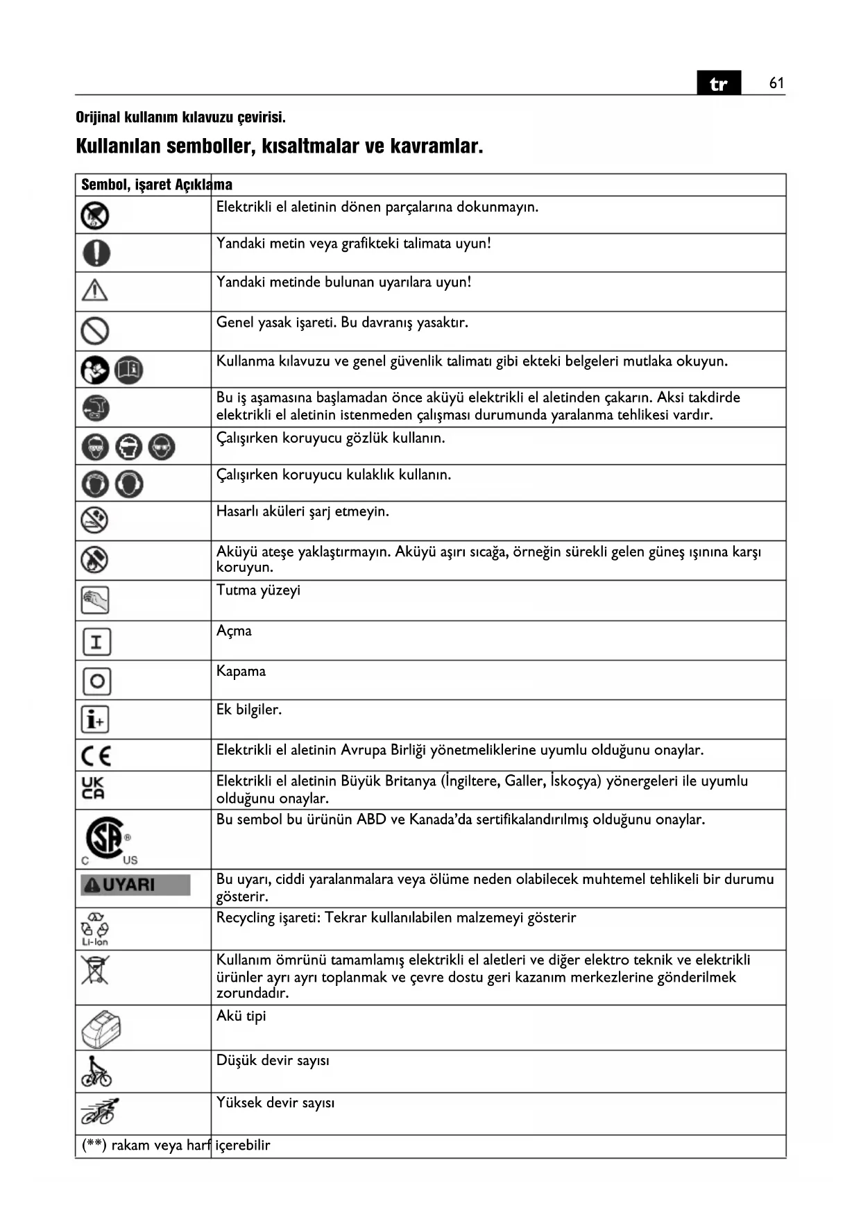 Orijinal kullanım kılavuzu çevirisi. Kullanılan semboller, kısaltmalar ve kavramlar. Sembol, işaret Açıklama Elektrikli el aletinin dönen parçalarına dokunmayın. Yandaki metin veya grafikteki talimata uyun! Yandaki metinde bulunan uyarılara uyun! Genel yasak işareti. Bu davranış yasaktır. Kullanma kılavuzu ve genel güvenlik talimatı gibi ekteki belgeleri mutlaka okuyun. Bu iş aşamasına başlamadan önce aküyü elektrikli el aletinden çakarın. Aksi takdirde elektrikli el aletinin istenmeden çalışması durumunda yaralanma tehlikesi vardır. Çalışırken koruyucu gözlük kullanın. Çalışırken koruyucu kulaklık kullanın. Hasarlı aküleri şarj etmeyin. Aküyü ateşe yaklaştırmayın. Aküyü aşırı sıcağa, örneğin sürekli gelen güneş ışınına karşı koruyun. Tutma yüzeyi Açma Kapama Ek bilgiler. Elektrikli el aletinin Avrupa Birliği yönetmeliklerine uyumlu olduğunu onaylar. Elektrikli el aletinin Büyük Britanya (İngiltere, Galler, İskoçya) yönergeleri ile uyumlu olduğunu onaylar. Bu sembol bu ürünün ABD ve Kanada’da sertifikalandırılmış olduğunu onaylar. Bu uyarı, ciddi yaralanmalara veya ölüme neden olabilecek muhtemel tehlikeli bir durumu gösterir. Recycling işareti: Tekrar kullanılabilen malzemeyi gösterir Kullanım ömrünü tamamlamış elektrikli el aletleri ve diğer elektro teknik ve elektrikli ürünler ayrı ayrı toplanmak ve çevre dostu geri kazanım merkezlerine gönderilmek zorundadır. Akü tipi Düşük devir sayısı Yüksek devir sayısı (**) rakam veya harf içerebilir62