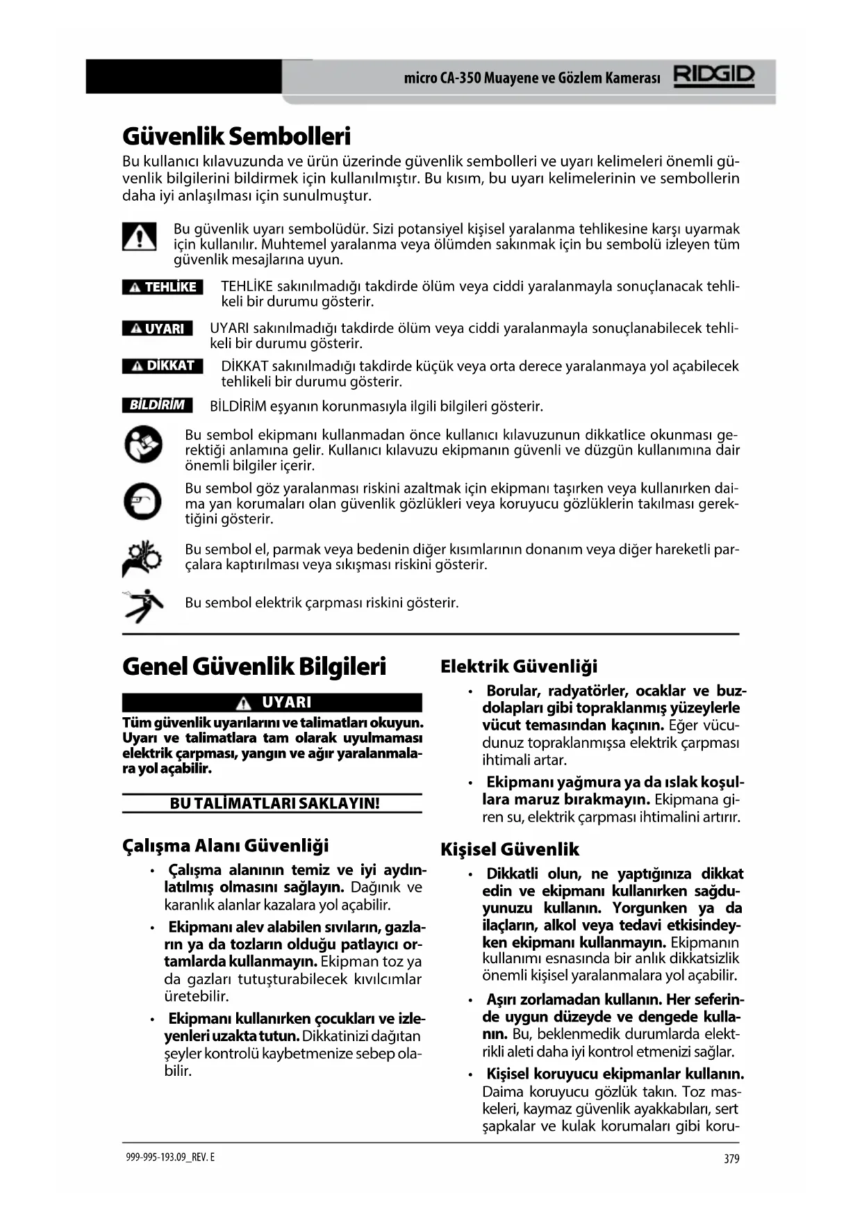 - Ekipmanınızın onarımını yetkili uz- man kişilere sadece orijinal yedek parçaları kullanarak yaptırın. Bu, aletin güvenliğinin devamlılığını sağlayacaktır. Özel Güvenlik Bilgileri UYARI Bu kısım muayene kamerasına özel önemli güvenlik bilgisi içerir. Elektrik çarpması veya diğer ciddi yaralanma risklerini azaltmak için RIDGID® micro CA‑350 Muayene ve Gözlem Kamerası'nı kullanma‑ dan önce bu önlemleri dikkatlice okuyun. BU TALİMATLARI SAKLAYIN! Bu kılavuzu kullanıcının kullanımı amacıyla alet‑ le birlikte muhafaza etmek için micro CA‑350 Muayene ve Gözlem Kamerası'nın taşıma çanta‑ sında bir kılavuz koyma yeri temin edilmiştir. micro CA‑350 Muayene ve Gözlem Kamerası Güvenliği