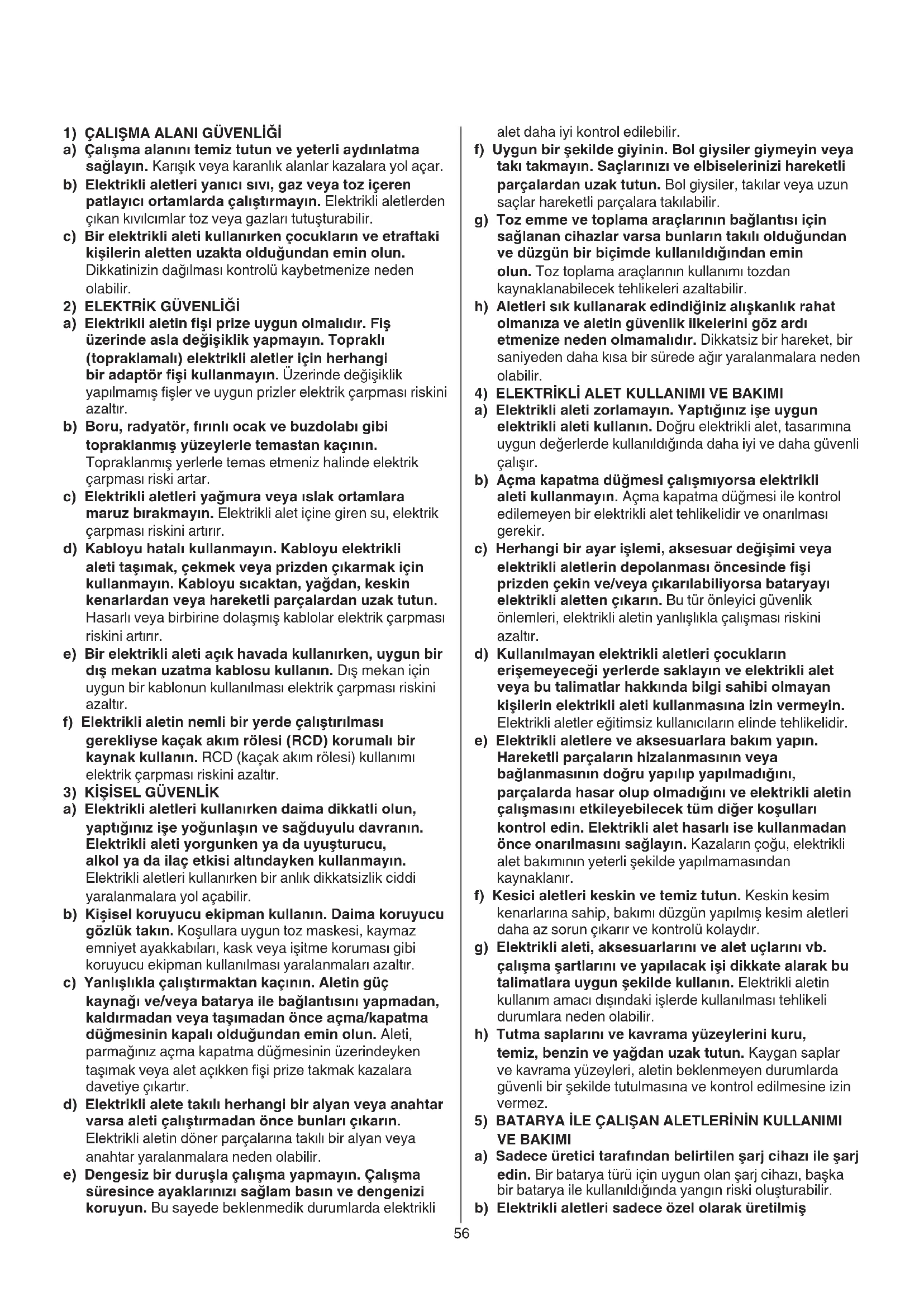VE BAKIMI a) Sadece üretici tarafından belirtilen şarj cihazı ile şarj edin. Bir batarya türü için uygun olan şarj cihazı, başka bir batarya ile kullanıldığında yangın riski oluşturabilir. b) Elektrikli aletleri sadece özel olarak üretilmiş