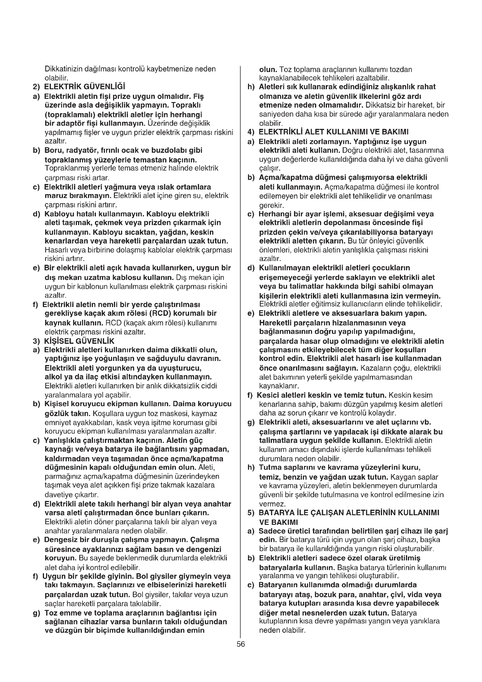 a) Elektrikli aletleri kullanırken daima dikkatli olun, yaptığınız işe yoğunlaşın ve sağduyulu davranın. Elektrikli aleti yorgunken ya da uyuşturucu, alkol ya da ilaç etkisi altındayken kullanmayın. Elektrikli aletleri kullanırken bir anlık dikkatsizlik ciddi yaralanmalara yol açabilir. b) Kişisel koruyucu ekipman kullanın. Daima koruyucu gözlük takın. Koşullara uygun toz maskesi, kaymaz emniyet ayakkabıları, kask veya işitme koruması gibi koruyucu ekipman kullanılması yaralanmaları azaltır. c) Yanlışlıkla çalıştırmaktan kaçının. Aletin güç kaynağı ve/veya batarya ile bağlantısını yapmadan, kaldırmadan veya taşımadan önce açma/kapatma düğmesinin kapalı olduğundan emin olun. Aleti, parmağınız açma/kapatma düğmesinin üzerindeyken taşımak veya alet açıkken şi prize takmak kazalara davetiye çıkartır. d) Elektrikli alete takılı herhangi bir alyan veya anahtar varsa aleti çalıştırmadan önce bunları çıkarın. Elektrikli aletin döner parçalarına takılı bir alyan veya anahtar yaralanmalara neden olabilir. e) Dengesiz bir duruşla çalışma yapmayın. Çalışma süresince ayaklarınızı sağlam basın ve dengenizi koruyun. Bu sayede beklenmedik durumlarda elektrikli alet daha iyi kontrol edilebilir. f) Uygun bir şekilde giyinin. Bol giysiler giymeyin veya takı takmayın. Saçlarınızı ve elbiselerinizi hareketli parçalardan uzak tutun. Bol giysiler, takılar veya uzun saçlar hareketli parçalara takılabilir. g) Toz emme ve toplama araçlarının bağlantısı için sağlanan cihazlar varsa bunların takılı olduğundan ve düzgün bir biçimde kullanıldığından emin57
